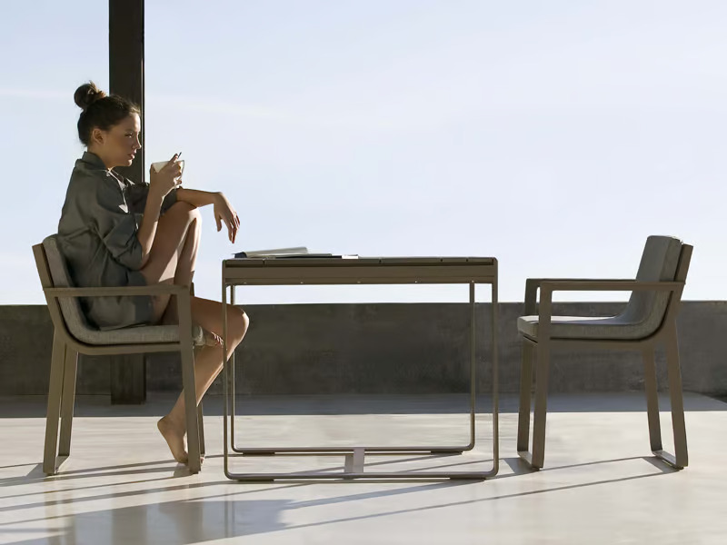 A FLAT kollekció egy sokoldalú és kiegyensúlyozott bútorgyűjtemény, amelyet 2008-ban terveztünk a GANDIABLASCO számára. Azóta is folyamatosan bővítjük új elemekkel. Az étkezőasztal és irodai asztal kategóriába tartozó modern asztalok könnyed, légies szerkezetükkel tűnnek ki, ahol a textil fontos szerepet játszik. A termék hőre keményedő alumínium profilokból és 100% újrahasznosítható polietilénből készül. A poliuretán habszivacs vízlepergető szövettel van bevonva, a huzat pedig levehető. A színválaszték magában foglalja a fehér, achátszürke, cement szürke, homok, bronz, kék szürke és antracit árnyalatokat. A homok, antracit és fehér asztallapok polietilénből készülnek, míg a bronz színű asztallap 12 mm vastag ultra-kompakt Dektonból. Ideális választás éttermek, kávézók, irodák és középületek számára, ahol design székek és kávézó székek társaságában is remekül mutat.