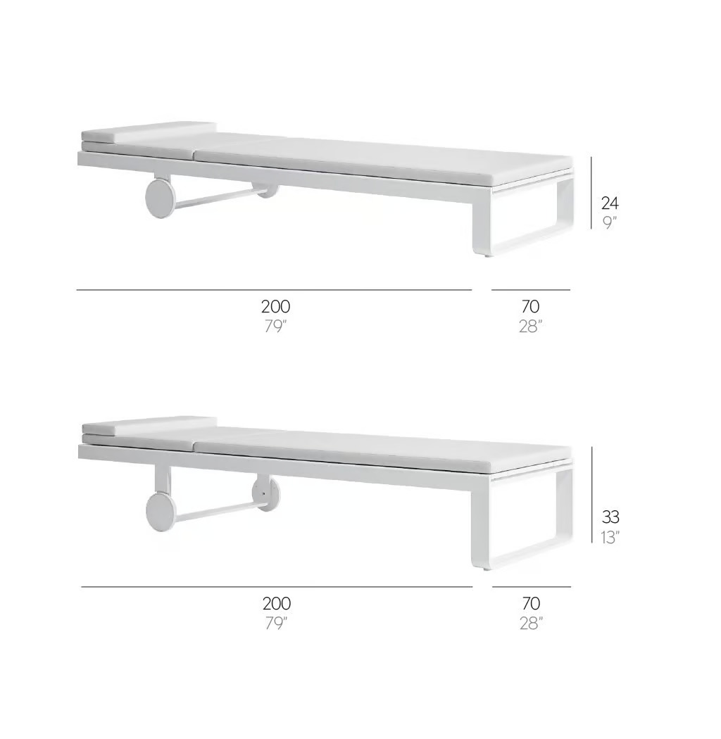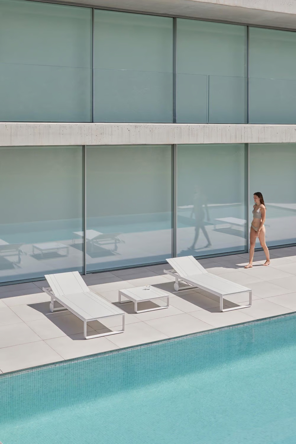 A FLAT napozóágy a kültéri ülőgarnitúrák sokoldalú darabja, amelyet a GANDIABLASCO számára terveztek. Az alumínium profilokból és 100% újrahasznosítható polietilénből készült szerkezet könnyed és légies megjelenést biztosít. A poliuretán habszivacs vízlepergető szövettel van bevonva, amely levehető huzattal rendelkezik. A kollekció színválasztéka magában foglalja a fehér, achátszürke, cement szürke, homok, bronz, kékesszürke és antracit árnyalatokat. Ideális választás éttermek, kávézók, szállodák és egyéb vendéglátóipari egységek számára, ahol a kerti bútorok és kültéri székek esztétikája és funkcionalitása egyaránt fontos.
