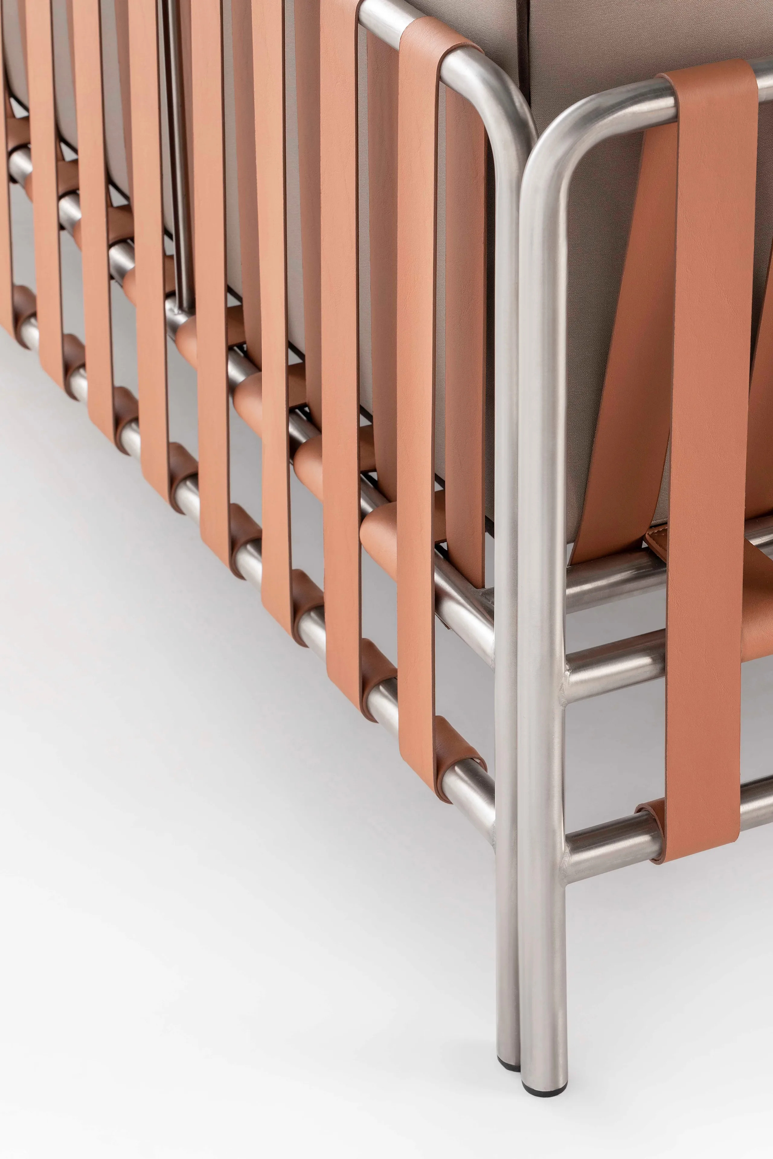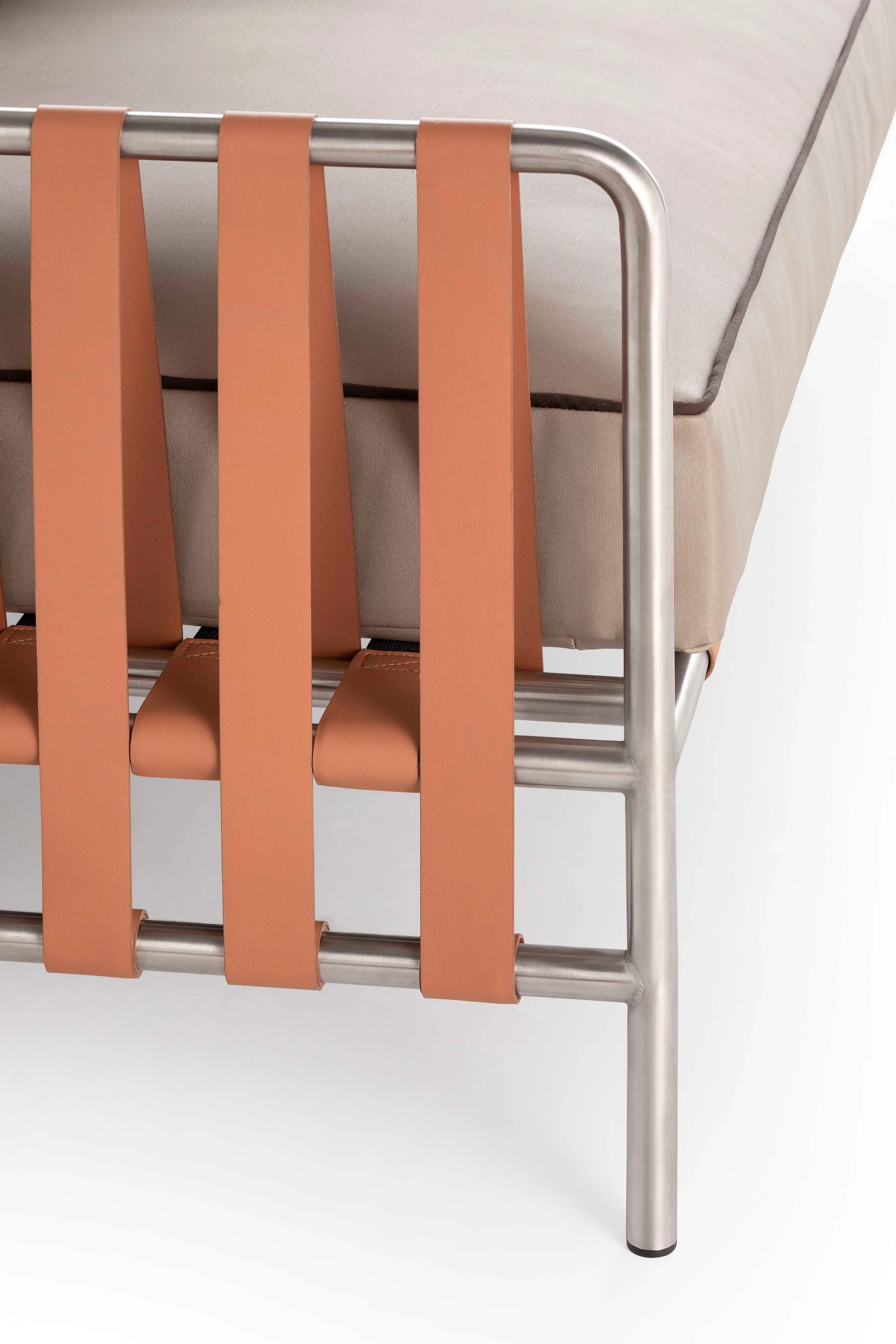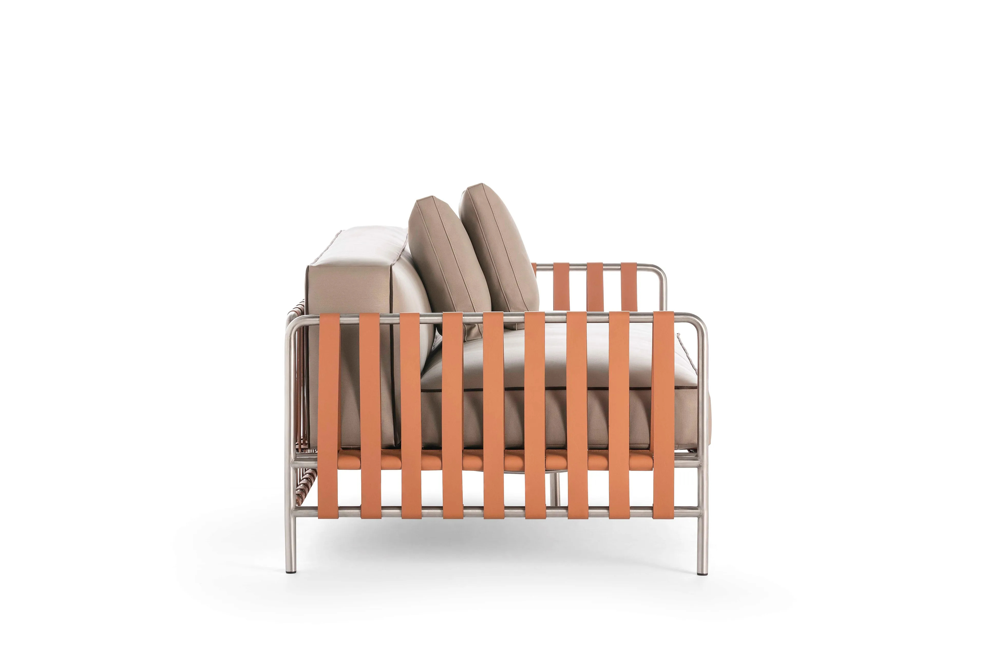 Az ONSEN 2 személyes kerti kanapé a kültéri bútorok világában a letisztult formák és a kifinomult anyaghasználat találkozása. Francesco Meda és David Quincoces tervezésében a kerti bútorok új szintre emelkednek, ahol a rozsdamentes acél, az elasztikus szíjak, az alumínium lemez és a teakfa harmonikus egységet alkotnak. Az ONSEN kollekció darabjai, beleértve a kültéri kanapékat és székeket, a geometrikus és egyszerű vonalvezetésükkel tűnnek ki, miközben a bőr szíjak és a fém szerkezet közötti kontraszt különleges esztétikai élményt nyújt. A kollekció sokoldalúsága lehetővé teszi a terek rugalmas kialakítását, legyen szó pihenésre alkalmas zugokról vagy formálisabb elrendezésekről. Az ONSEN kanapé a kültéri ülőgarnitúrák között a funkcionalitás és a nyugodt esztétika tökéletes egyensúlyát képviseli.