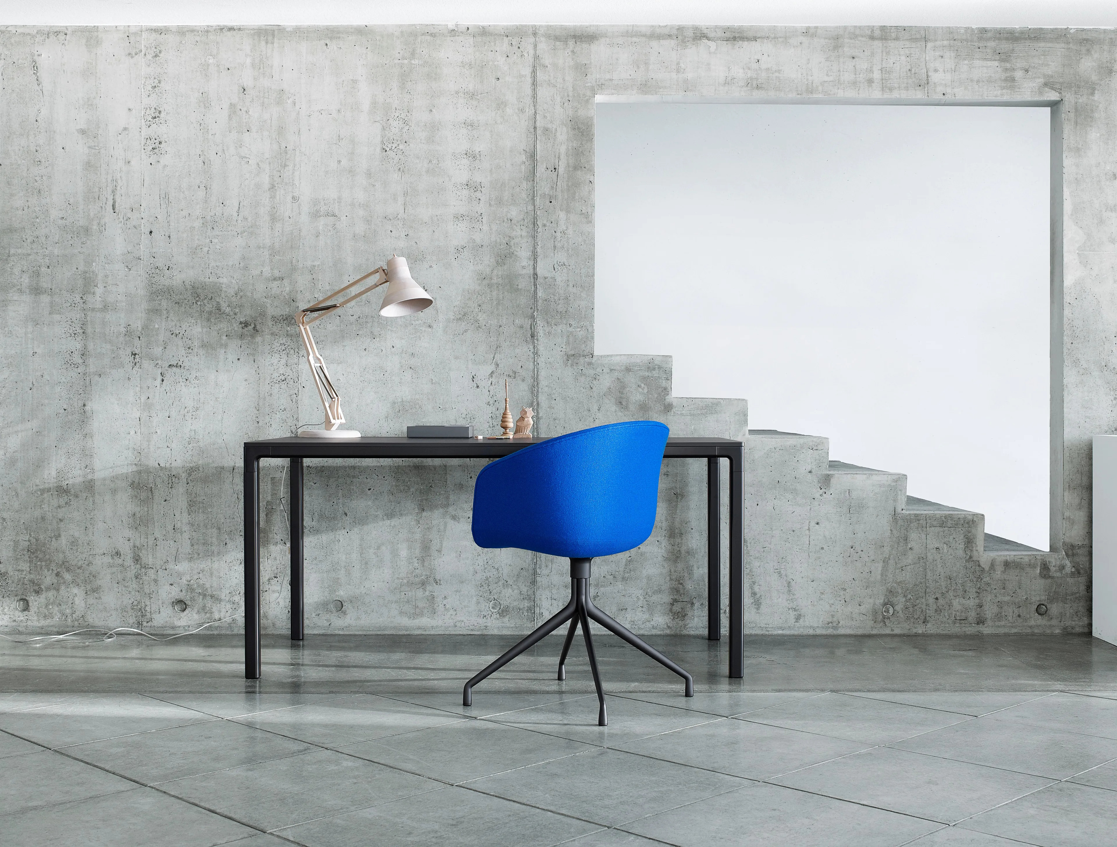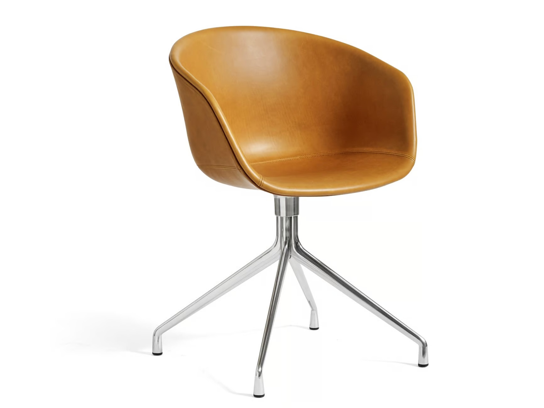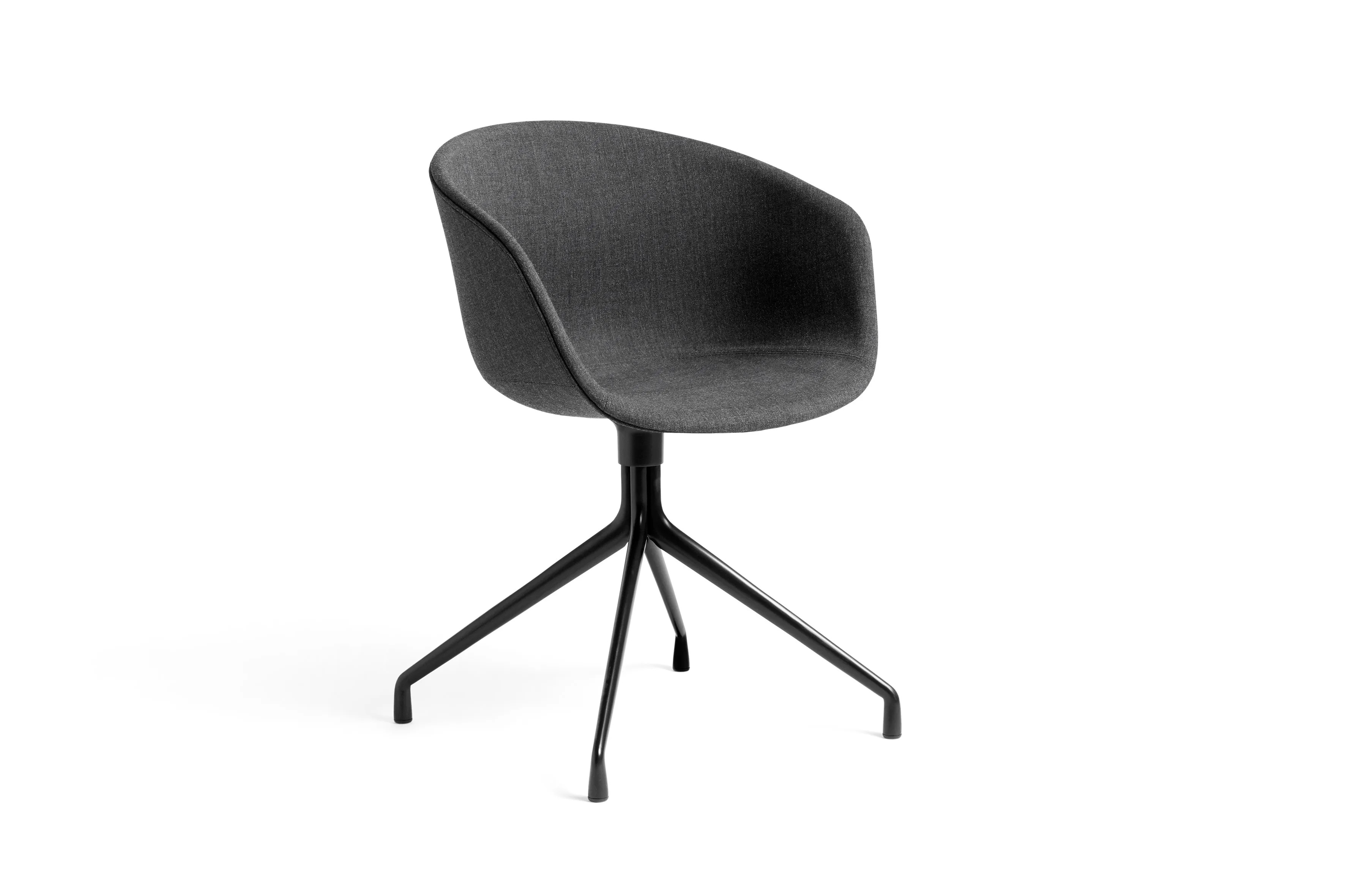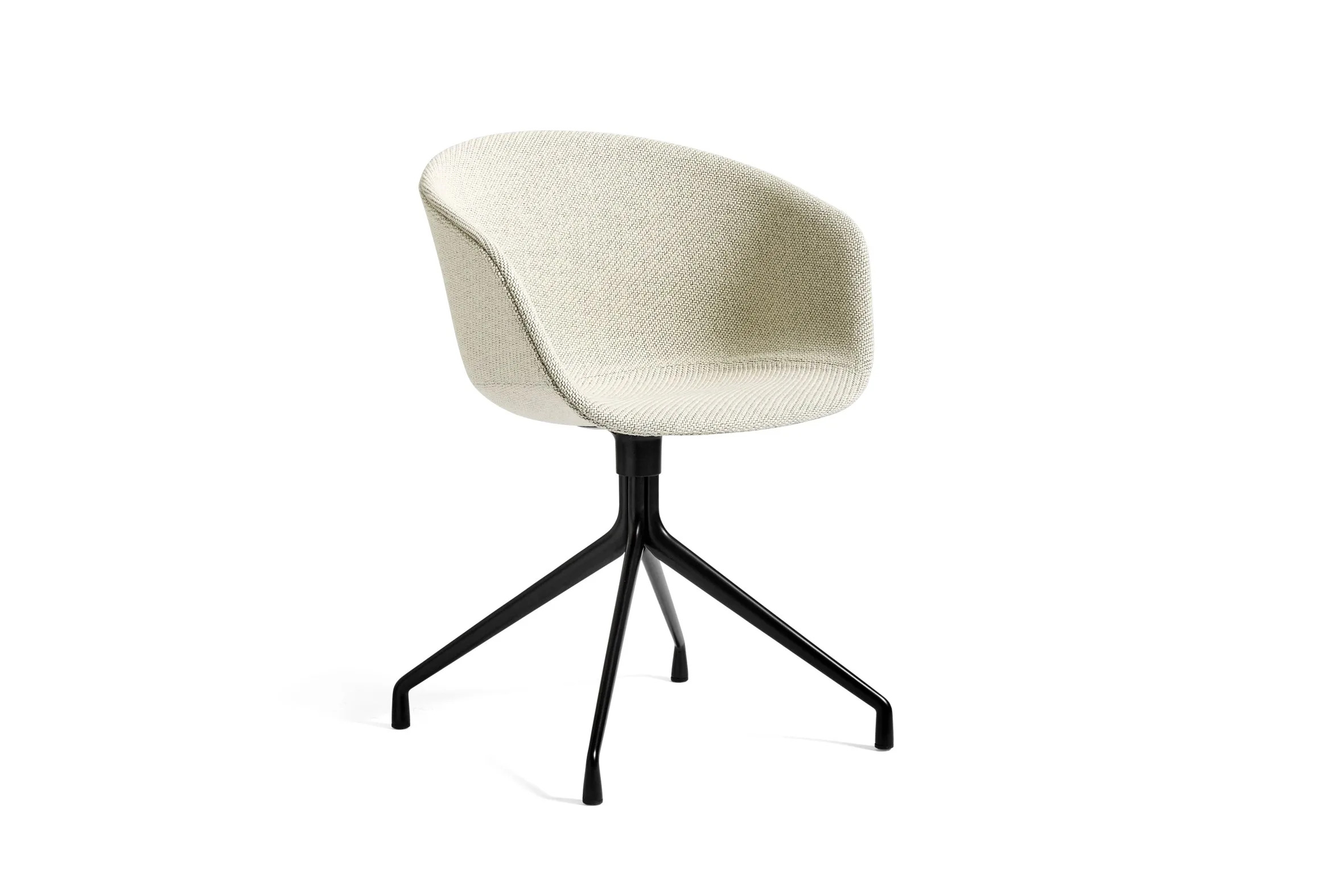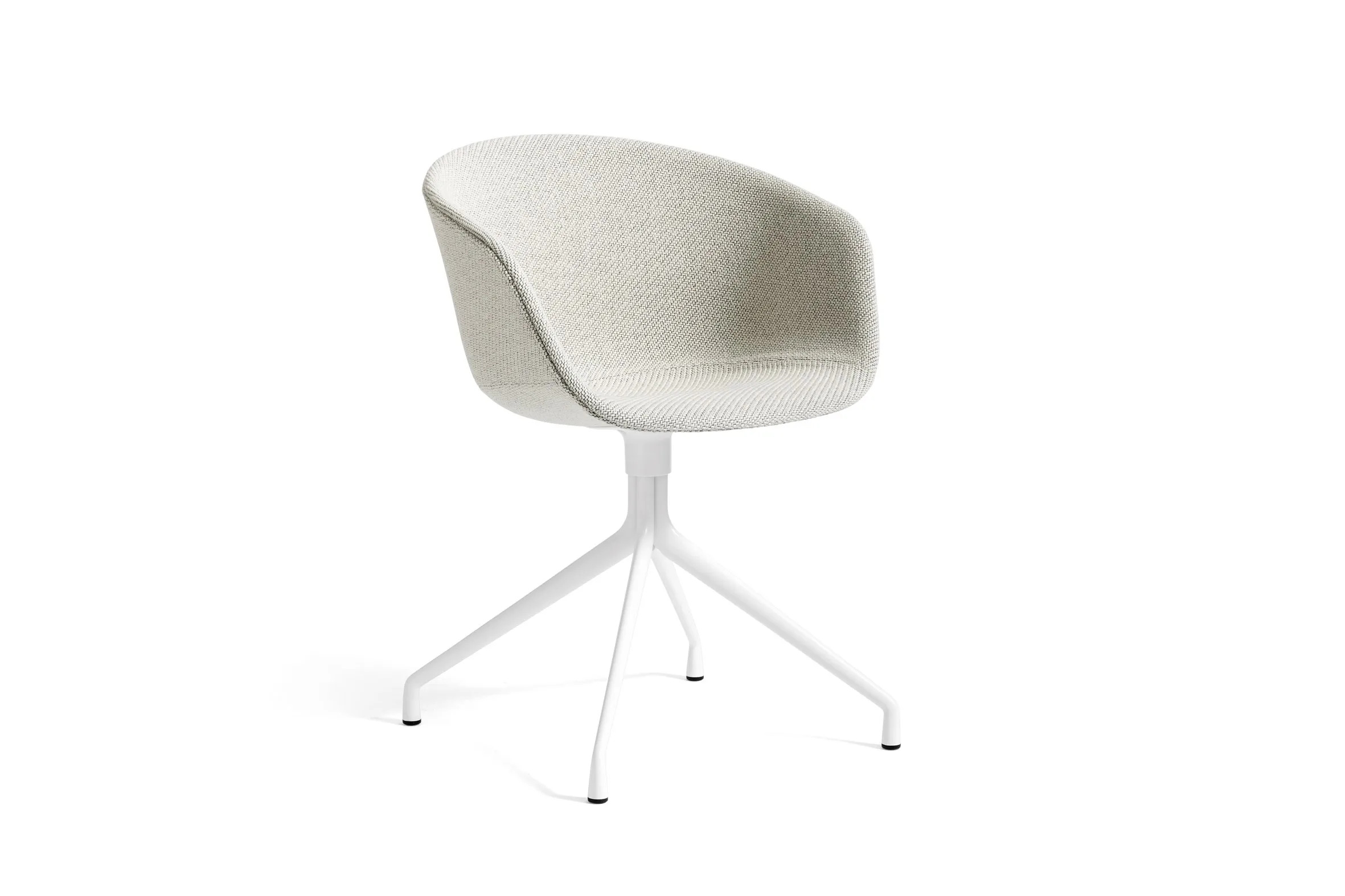 Az About A Chair AAC 21 egy acél forgóalappal rendelkező szék, amely formálisabb megjelenést kölcsönöz, mint a sorozat fa lábú változatai. Az ívelt héj puha, egységes sziluettet alkot, amelyet finom, elegáns lábak támasztanak alá, mintha a szék a padló fölé emelkedne. A szék öntött alumínium forgóalapja polírozott vagy porszórt kivitelben érhető el, míg a polipropilén héj különféle kárpitozási lehetőségeket kínál, így számos design kombinációt tesz lehetővé. Az injektált polipropilén ülés karfával és teljes kárpitozással rendelkezik. A héj vastagsága 10 mm polipropilén, 10 mm habbal. A 4 csillagos forgóalap öntött alumíniumból készült, és három különböző alapfelülettel kapható: fekete porszórt alumínium (RAL 9005), fehér porszórt alumínium (RAL 9003) és polírozott alumínium.