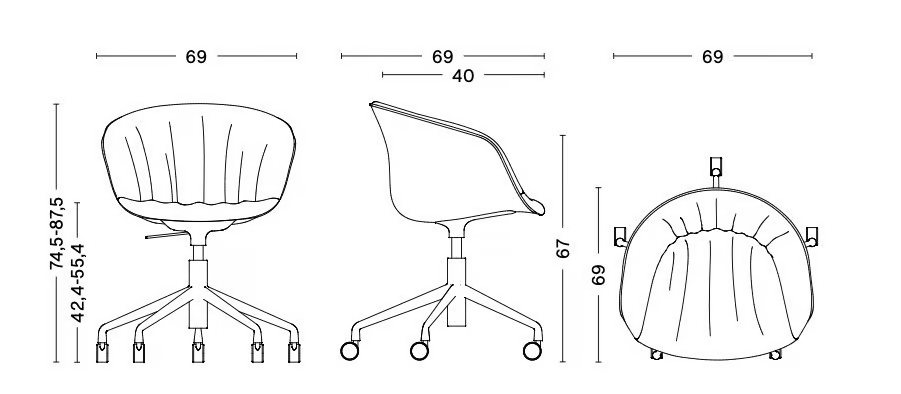 Az AAC53 Soft szék puha, steppelt héja melegséget kölcsönöz a funkcionális irodai székek világának. Az ívelt héj és az egységes sziluett megmarad, miközben a design egy ötágú, görgős talppal és gázlifttel rendelkezik, amely 14 cm-es magasságállítást tesz lehetővé. A talp elérhető polírozott vagy porszórt alumíniumból, míg a héj különféle kárpitozási lehetőségekkel választható, így számos design kombinációt kínál. Az injektált polipropilén héj karfával, teljes kárpitozással és steppelt előlappal rendelkezik. Az ülés 20 mm-es, a háttámla 15 mm-es habszivaccsal, valamint 20 mm-es vattával van ellátva. Az ötküllős, görgős alumínium talp gázlifttel és puha kerekekkel minden padlófelületre alkalmas. Számos standard szövet és bőr közül választható, három különböző talp kivitelben: fekete porszórt alumínium (RAL 9005), fehér porszórt alumínium (RAL 9003) és polírozott alumínium.