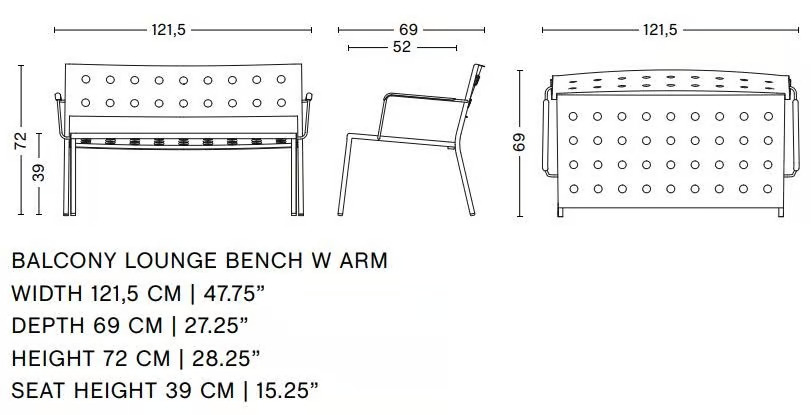 A Ronan & Erwan Bouroullec által a HAY számára tervezett Balcony kültéri ülőgarnitúra egyszerű, szögletes vonalvezetésével és a felületeken található lyukakkal tűnik ki, amelyek nemcsak a dizájnt határozzák meg, hanem erősítik is az ülő- és háttámlát. A kültéri bútorok között a Balcony különleges helyet foglal el, mivel rakásolható kialakítása révén kis erkélyektől kezdve nagyobb kertekig bármilyen térben elhelyezhető. A porfestett acélból készült, kültéri alapozóval ellátott kerti bútorok optimális szilárdságot és tartósságot biztosítanak. A Balcony több színváltozatban kapható, beleértve az antracit, vasvörös, sivatagi zöld, sötét erdőzöld és kréta bézs árnyalatokat, így könnyen illeszkedik bármilyen környezetbe.