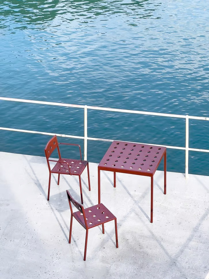 A Balcony asztal, amelyet Ronan & Erwan Bouroullec tervezett a HAY számára, egy négyzet alakú étkezőasztal, amelyet egyszerű vonalak és a felületen található lyukak jellemeznek. Ezek a lyukak nemcsak a design székekkel harmonizálnak, hanem erősítik is az asztallapot. Az irodai asztal ideális különféle terekbe, legyen szó kis erkélyekről, teraszokról, kertekről vagy nagyobb kültéri helyszínekről. A modern asztalok közé tartozó Balcony porszórt acélból készült, kültéri alapozóval a maximális tartósság érdekében. Több színváltozatban elérhető, mint például antracit, vasvörös, sivatagi zöld, sötét erdőzöld és kréta bézs. A kávézó székekkel is jól kombinálható, így sokoldalú választás különböző vendéglátóipari egységek számára.