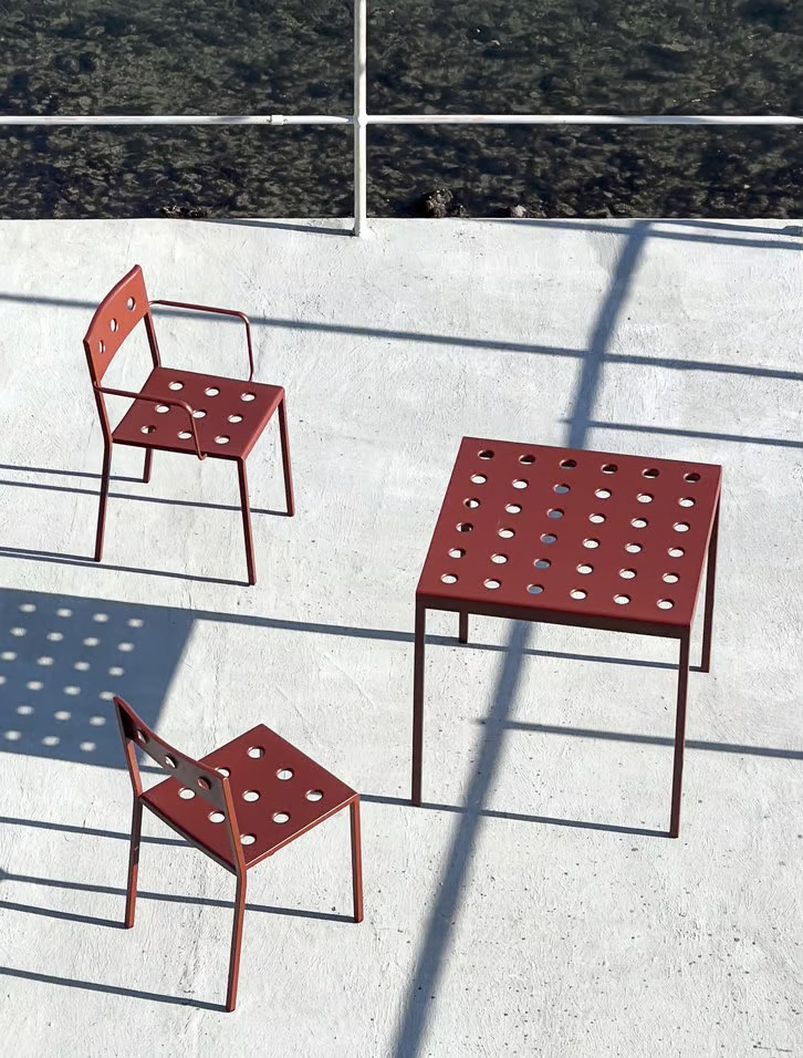 A Balcony szék, Ronan & Erwan Bouroullec tervezésében a HAY számára, egyszerű és szögletes vonalvezetésével tűnik ki, amelyet a felületeken található lyukak tesznek egyedivé és erősítik a háttámlát és az ülőrészt. A szék rakásolható kialakítása miatt ideális választás különféle terekbe, legyen szó kis erkélyekről, teraszokról, kertekről vagy nagyobb kültéri helyszínekről. Porszórt acélból készült, kültéri alapozóval a maximális szilárdság és tartósság érdekében. Több színváltozatban elérhető, beleértve az antracit, vasvörös, sivatagi zöld, sötét erdő és kréta bézs árnyalatokat. Ideális választás étkezőasztalokhoz, modern asztalokhoz, irodai asztalokhoz, valamint kávézó székek mellé.