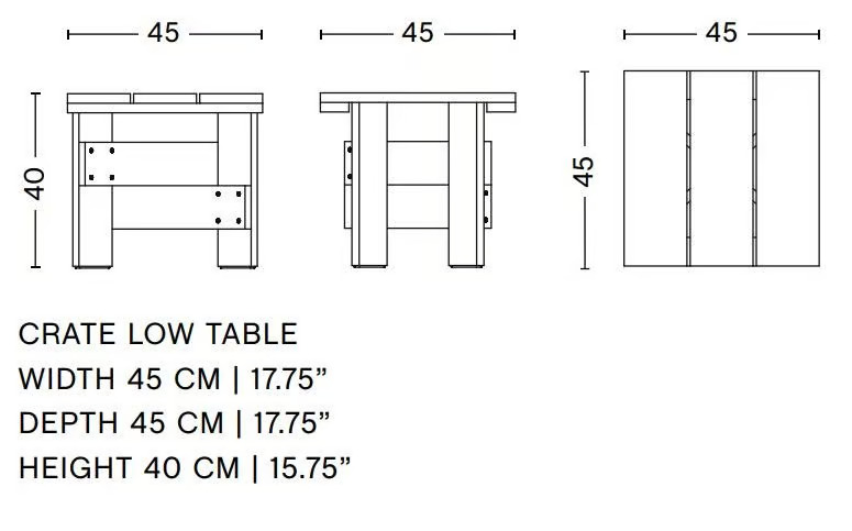 A Crate egy kültéri alacsony kávézóasztal, amely szerződéses felhasználásra is alkalmas, teljes egészében tömör fenyőfából készült. Az eredeti tervezés 1934-ben a holland építész és tervező, Gerrit Rietveld nevéhez fűződik, aki a felesleges fa szállítóládák újrahasznosítására törekedett. A Rietveld Originals és a HAY együttműködésében újraindított ikonikus Crate Kollekció modern, funkcionális és megfizethető bútordarabokat kínál. A kollekció részei a lounge szék, étkezőszék, alacsony asztal és oldalasztal, mindegyik az eredeti dizájn tiszteletben tartásával készült. A tömör fenyőből készült, vízbázisú lakkozással ellátott bútorok kültéri használatra is alkalmasak. Az egyszerűség és a térbeli kialakítás a tervező építészeti stílusát tükrözi, biztosítva a funkcionalitást és kényelmet anélkül, hogy helyet foglalna. A különböző színválaszték és a vízbázisú bevonat lehetővé teszi a bútorok sokoldalú felhasználását beltéri és kültéri környezetben egyaránt.