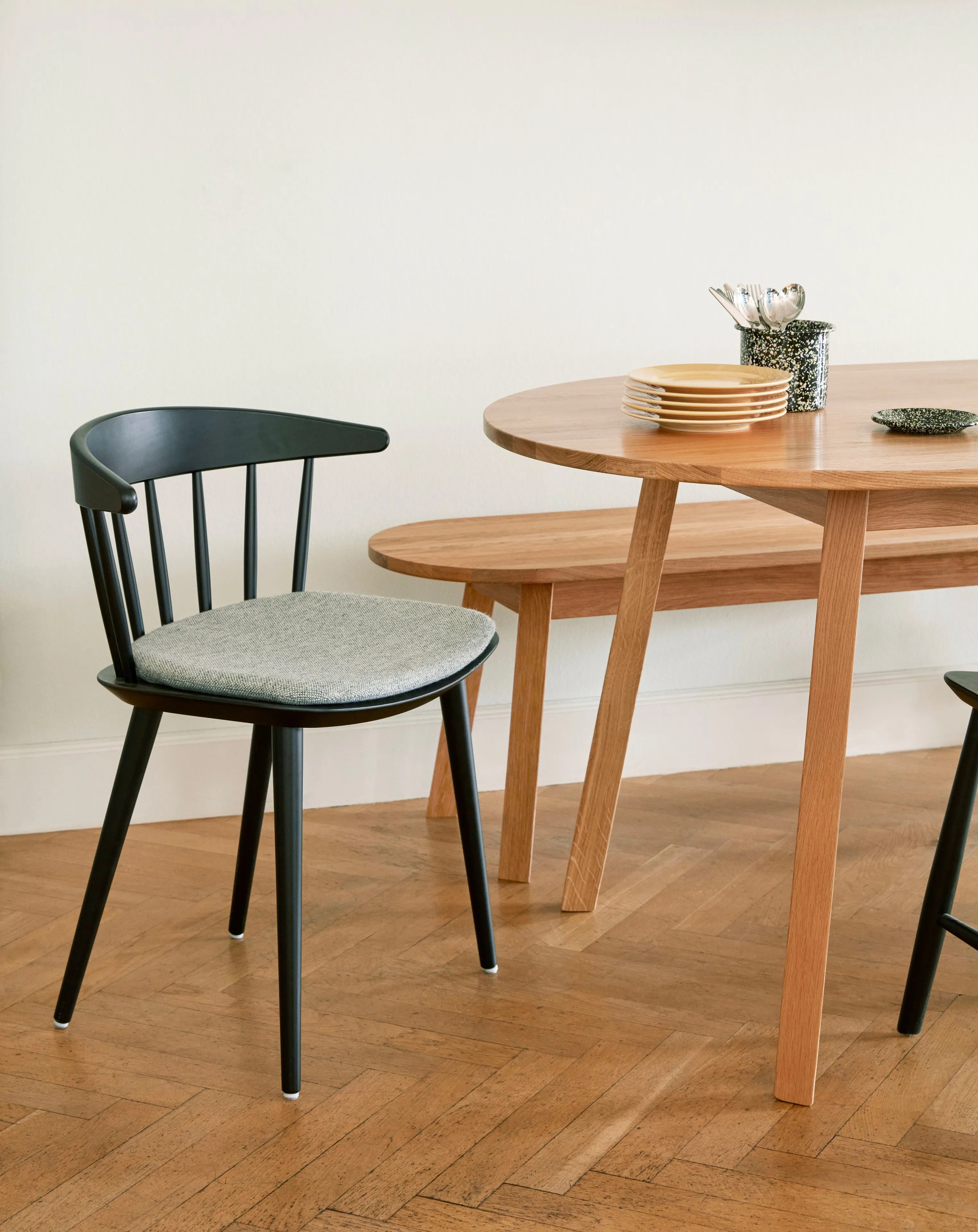 A J104 szék a klasszikus FBD bútorok újragondolása, amely az ipari fejlődésből született funkcionális dizájnt képviseli. Az FDB 1933-ban alakította ki erős bútorkoncepcióját, amely Børge Mogensen vezetésével az ipari gyártást szorosan összekapcsolta az építészeti bútortervezéssel. A cél a jól megtervezett bútorok széles körű elérhetősége volt, nem pedig a részletek kidolgozása. Az ipari megközelítés egységes lábakat eredményezett, ami forradalmasította a bútorgyártást. Jørgen Bækmark J104 széke az étkező- és könnyű székek ötvözete, amelyet a HAY tömör bükkből készít, természetes vagy különböző színezett felületekkel. Az ülés formázott bükk rétegelt lemezből, a háttámla tömör bükkből és rétegelt lemezből készül. Hat különböző kivitelben kapható: természetes, poros szürke, bézs szürke, kőszürke, fekete és fehér színezett bükk.