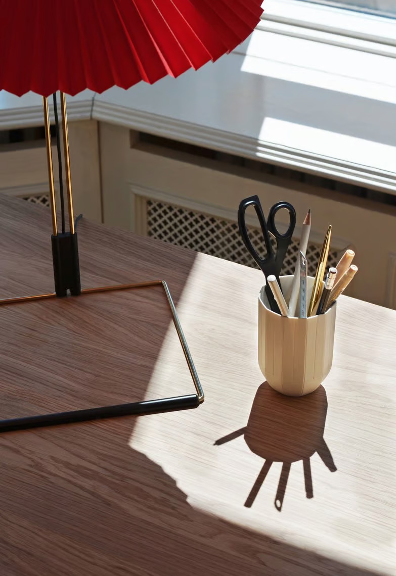 A Matin asztali lámpa modern és költői formatervezéssel rendelkezik, amely vizuális finomságot ötvöz fizikai robusztussággal. A lámpa acélhuzalból hajlított kerete polírozott sárgaréz felülettel és matt fekete szerelvényekkel készül, amelyet különböző élénk színű, redőzött pamut ernyő egészít ki. A beépített LED fényforrás szórt lefelé irányuló fényt biztosít, amelyet digitális vonali dimmerrel lehet szabályozni. A lámpa része egy fejlett világítási kollekciónak, amely asztali, mennyezeti és fali lámpákat is tartalmaz. Két méretben kapható, és alkalmas mind magán-, mind irodai környezetbe. Az anyagok között megtalálható a pamut szövet, PVC, hajlított acélhuzal és ABS műanyag. A lámpa CE tanúsítvánnyal rendelkezik, és legalább 25,000 órás élettartamot biztosít. A 200 cm hosszú kábel inline lépéses dimmerrel van ellátva.