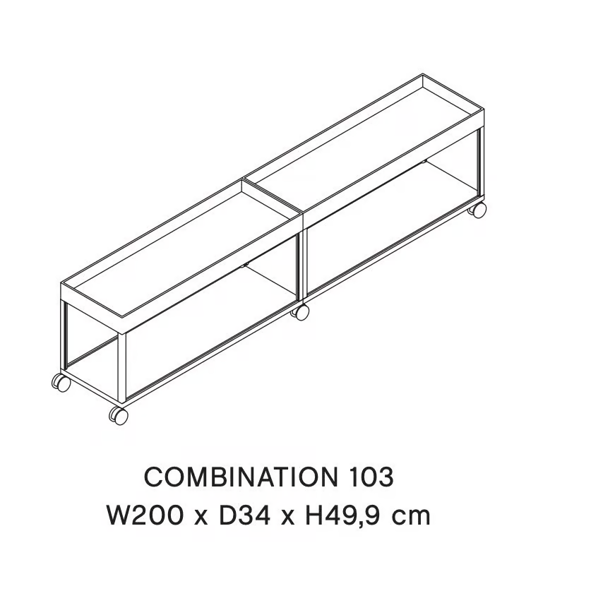 A New Order Combination 103 egy egyszerű, moduláris kialakítású tárolóegység, amely kerekeken gurul, így rugalmas és esztétikus tárolási megoldást kínál irodai környezetben. Két egységből áll, amelyeket egy dupla profil köt össze, így hosszabb formát ölt. Nyitott kialakítása lehetővé teszi különböző tárgyak, például TV vagy médiaeszközök elhelyezését és rendszerezését, miközben minden oldalról könnyen hozzáférhető. Az alumínium rács több színben elérhető, és lehetőség van panelek, ajtók és fiókok hozzáadására, így a megjelenés és a funkcionalitás személyre szabható, végtelen kombinációkat és alkalmazásokat kínálva. Ideális választás irodai székek, irodai asztalok és irodai tárolók környezetébe.
