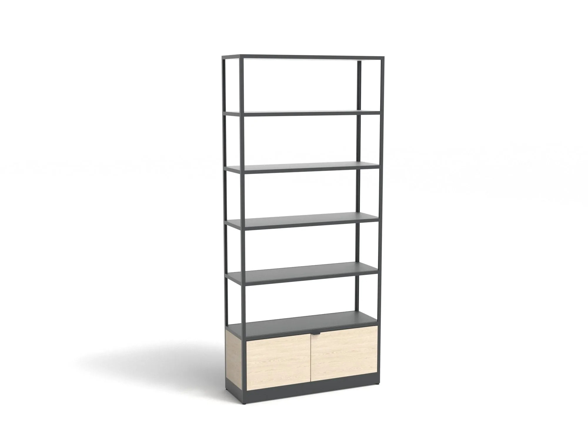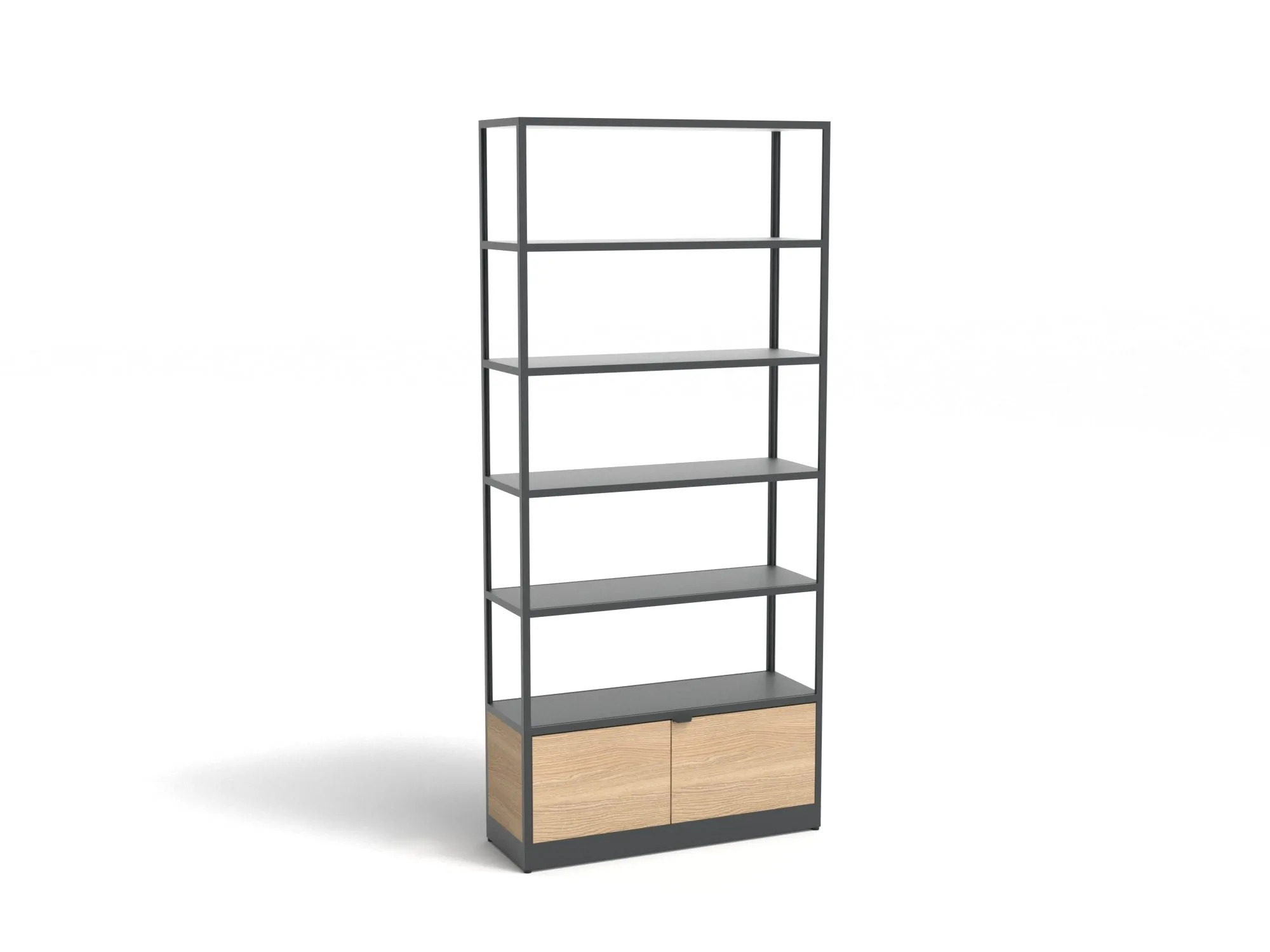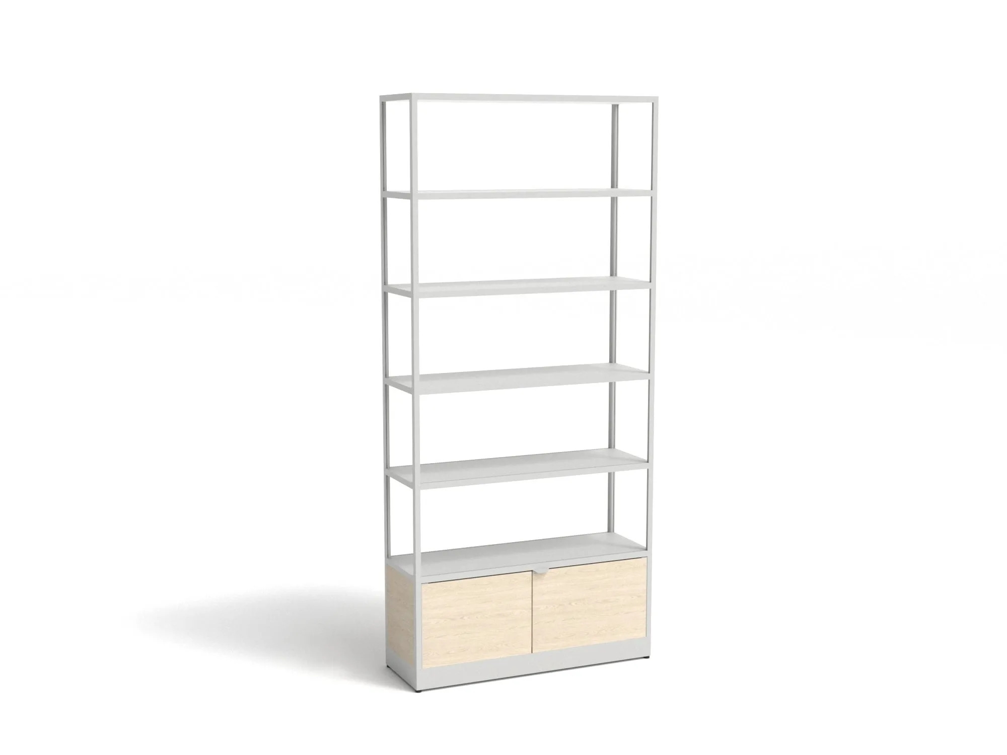A New Order Combination 601 egy rugalmas tárolási megoldás, amely zárt és nyitott tárolóhelyeket ötvöz. A hétpolcos rendszer praktikus és esztétikus könyvespolc és tároló megoldást kínál irodai vagy otthoni környezetben. Az integrált polc faajtókkal és panelekkel rendelkezik, amelyek megtörik a rácsrendszer egyhangúságát, a természetes anyag pedig hatékony kontrasztot és melegséget ad az ipari alumíniumnak. Az alumínium és furnér elemek különböző színváltozatokban érhetők el, lehetőséget biztosítva a panelek, ajtók, tálcák és fiókok módosítására, így a megjelenés és funkcionalitás személyre szabható, végtelen kombinációkat és alkalmazásokat teremtve.