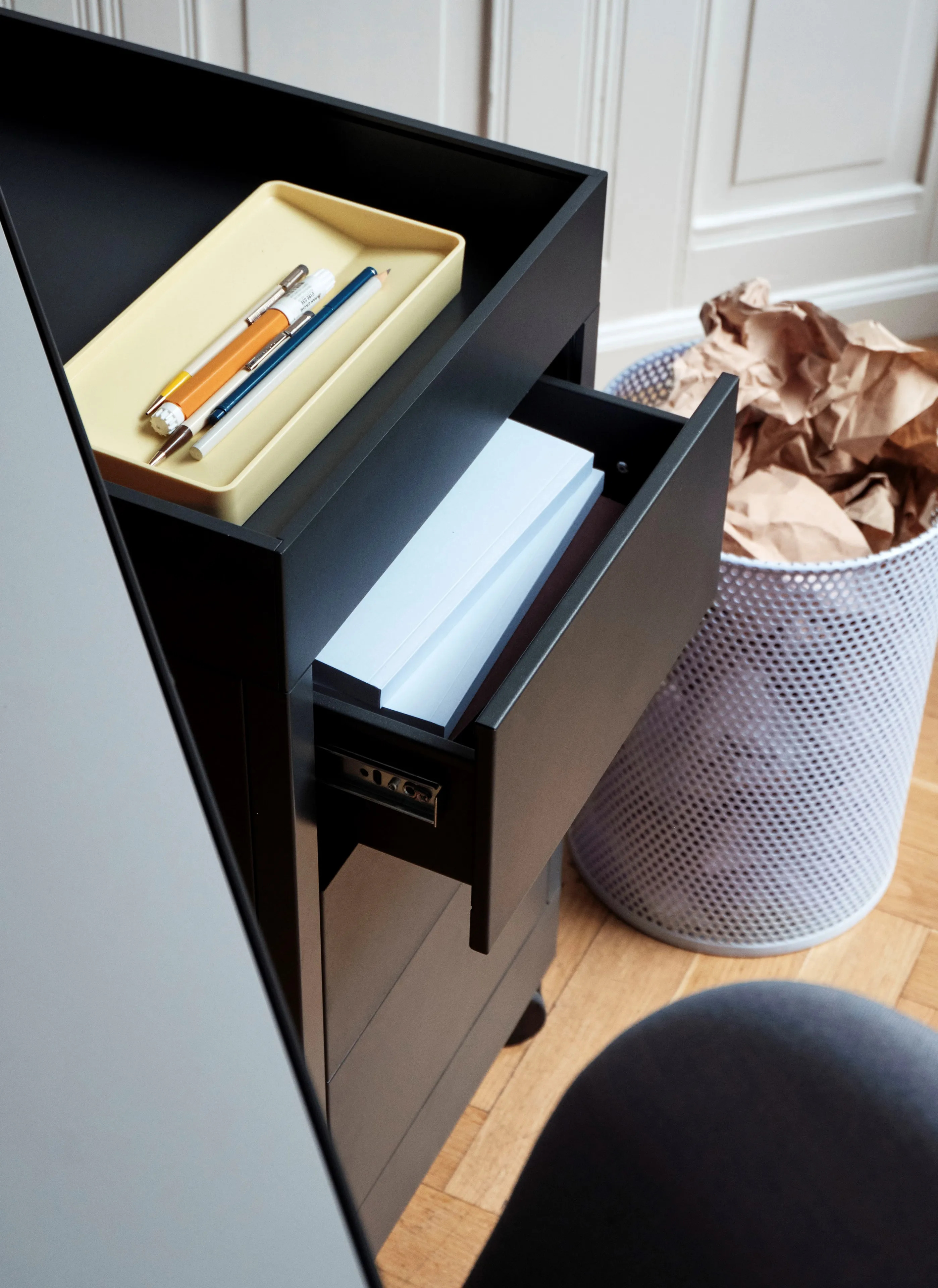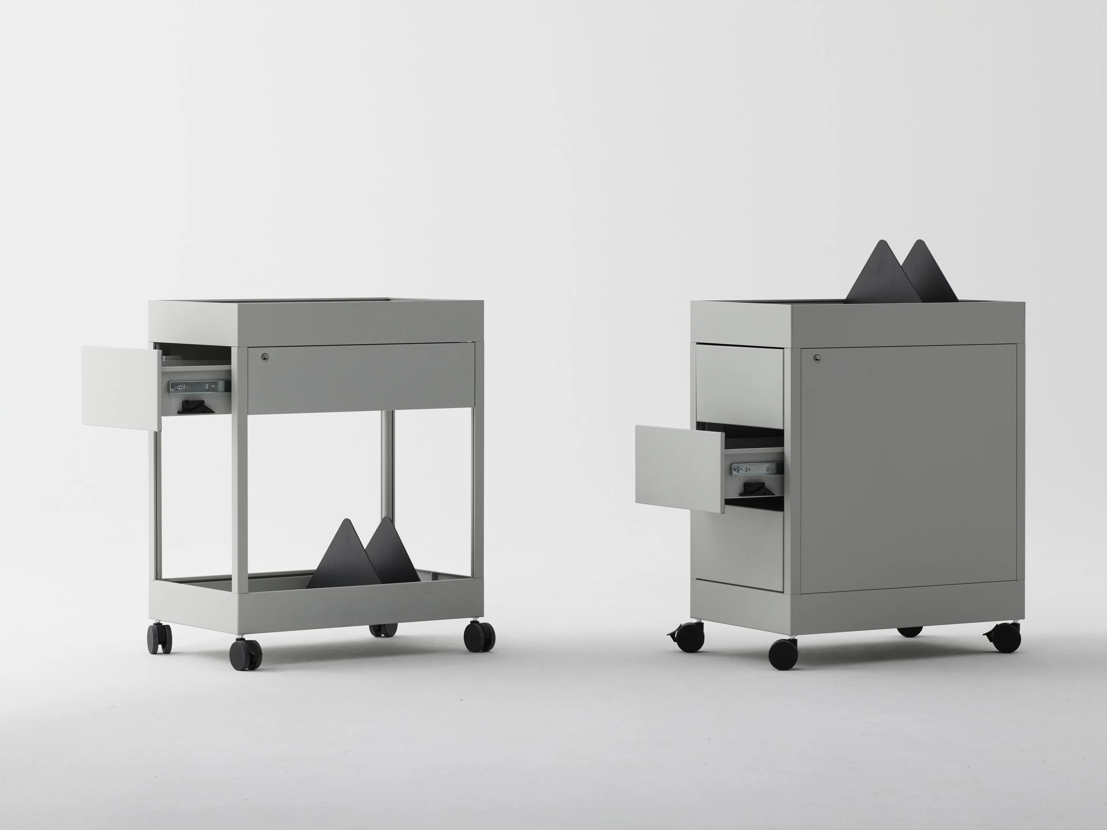 A New Order mobil tárolók tálcás felső résszel rendelkeznek, és egy fiókkal, valamint egy nyitott polccal vannak ellátva. Emellett egy zárt egység is található rajtuk, amely három fiókot tartalmaz. Mindkét kialakítás kompatibilis a New Order tálca kiegészítőkkel, és zárható rendszerrel van felszerelve. Ideális választás irodai székek, irodai asztalok és irodai tárolók környezetébe, ahol a funkcionalitás és a rendezettség kiemelt fontosságú.