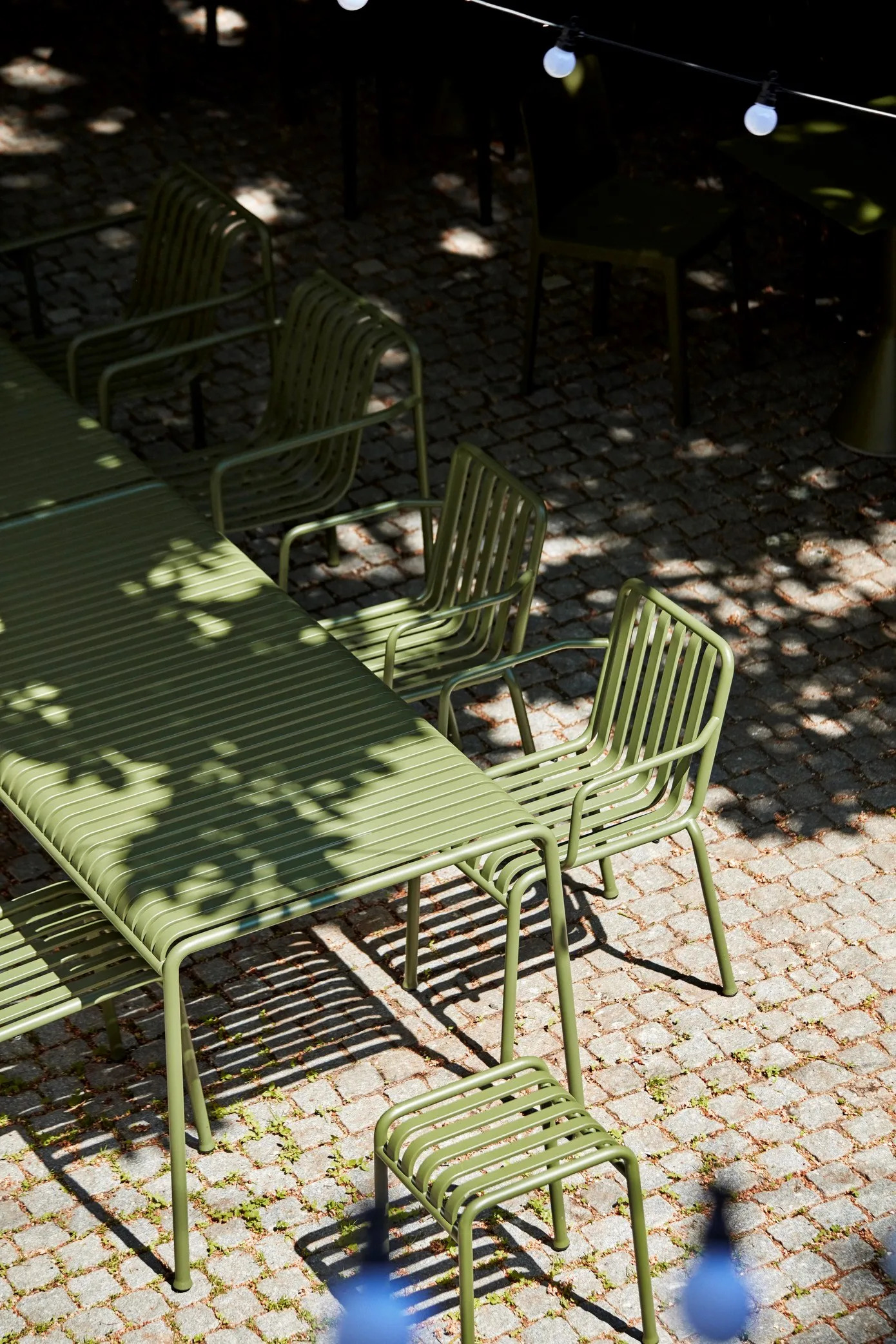A Ronan és Erwan Bouroullec által tervezett PALISSADE kollekció a HAY számára készült, kültéri bútorokból álló sorozat, amely porfestett vagy tűzihorganyzott acélból készül. A szimmetrikus geometria elvén alapuló tervezés biztosítja a vizuális egyszerűséget és a tartósságot. A kollekció színei és formái harmonikusan illeszkednek mind a természetes, mind a városi környezetbe. Az étkezőasztalok és design székek hosszú távú használatra készültek, idővel még szebbé válnak. Ideális választás kávézók, éttermek, irodák, valamint kertek és teraszok számára. A porfestett acél vagy tűzihorganyzott acél kétkomponensű bevonattal rendelkezik, amely védelmet nyújt a korrózió ellen, így alkalmas kültéri használatra. Különböző kivitelben elérhető: antracit, égkék, olíva, tűzihorganyzott és vasvörös.