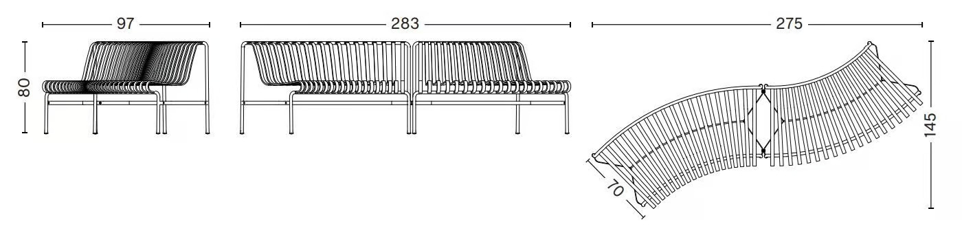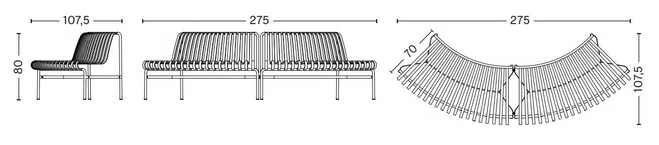 A Palissade Park Dining egy moduláris kültéri ülőgarnitúra, amelyet a neves francia tervezők, Ronan és Erwan Bouroullec álmodtak meg. A kerti bútorok között kiemelkedő darab, amely ívelt vázzal rendelkezik, külső és belső ívű változatban. Több modul összekapcsolásával, akár eltérő ívekkel is, kör vagy íves formációk alakíthatók ki. Ez a kültéri székek és kanapék közé sorolható pad harmonikusan illeszkedik bármilyen természetes vagy városi környezetbe, mint például parkok, kertek és közterek. A porfestett vagy horganyzott acélból készült termékek kétkomponensű bevonattal rendelkeznek, amely védelmet nyújt a korrózió ellen. Különböző kivitelben elérhető: antracit, égkék, olíva és vasvörös színekben.