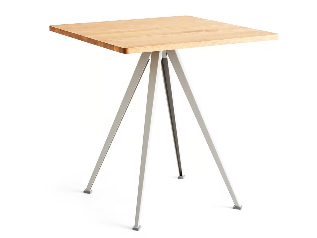 A Pyramid Café Table 21 a sokoldalúság, könnyedség és erő jegyében készült, a kivágott lemezacél konstrukció csúcsa. Az 1950-es években Wim Rietveld által tervezett asztalokat a HAY és az Ahrend újraélesztette. Az eredeti megjelenésekor úttörőnek számított a lemezacél innovatív felhasználása miatt, amely új irányt adott az organikus formájú termékeknek. A kollekció ma is kiemelkedik anyagtakarékos, egyszerű szerkezetével és könnyedségével, amely lehetővé teszi a könnyű mozgatást. Az időtálló design és a tartós minőség különböző éttermek és kávézók számára is ideális. A 21 mm vastag tömör tölgy asztallap négyféle felületkezeléssel érhető el: átlátszó lakkozott, matt lakkozott, füstölt olajozott és olajozott. A keret háromféle porszórt acél kivitelben kapható: fekete, bézs és paradicsompiros. Az asztal négyzet és kör alakú változatban is elérhető, tökéletesen illeszkedve modern asztalok és design székek környezetébe, legyen szó irodai asztalról vagy kávézó székekről.