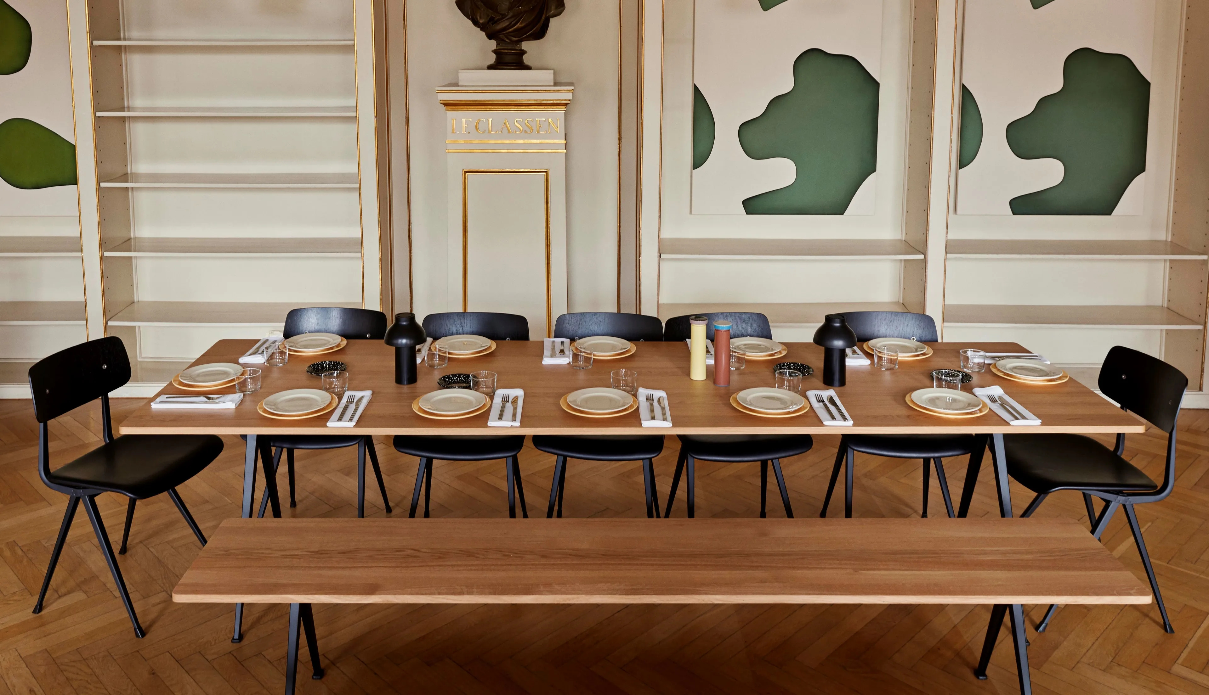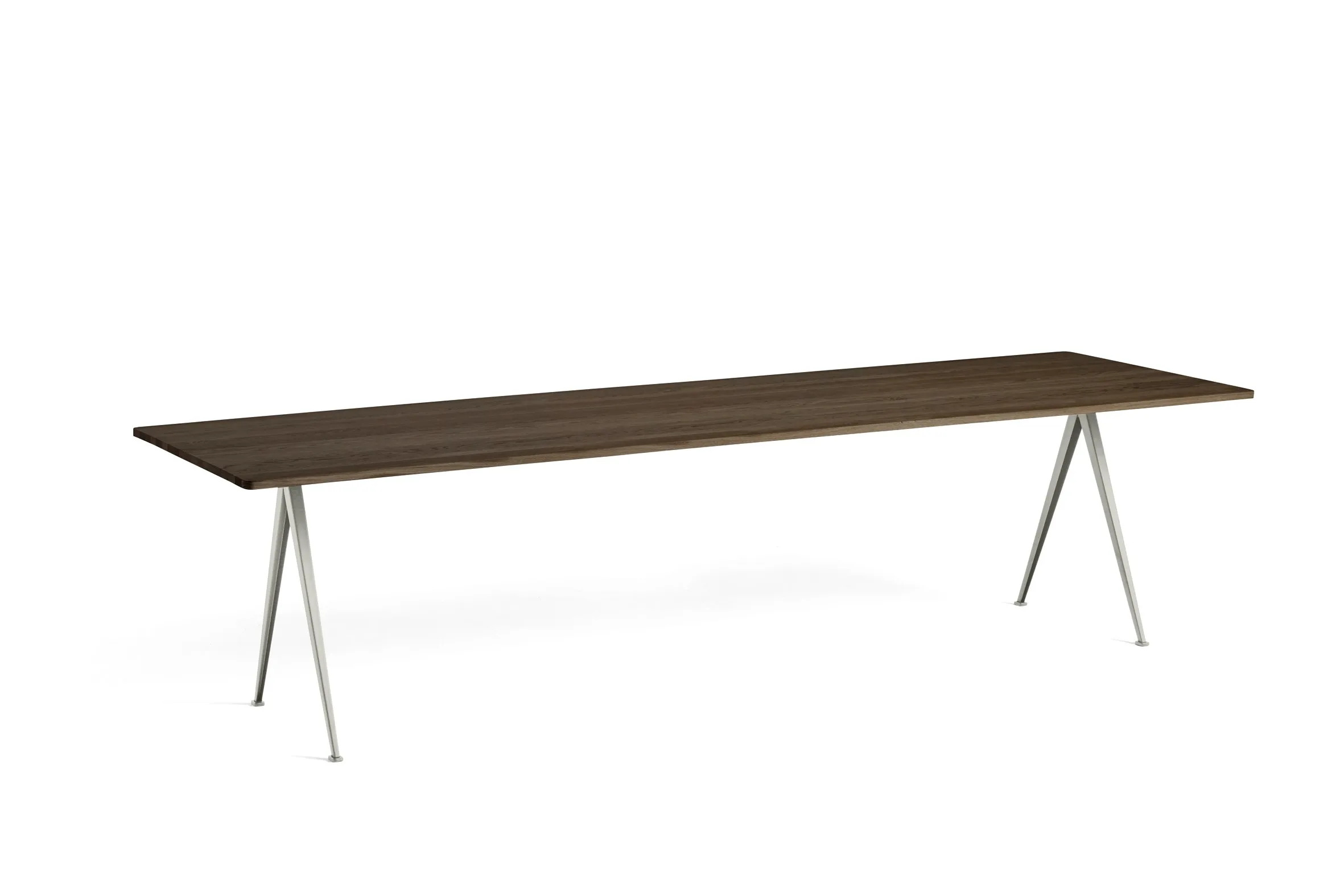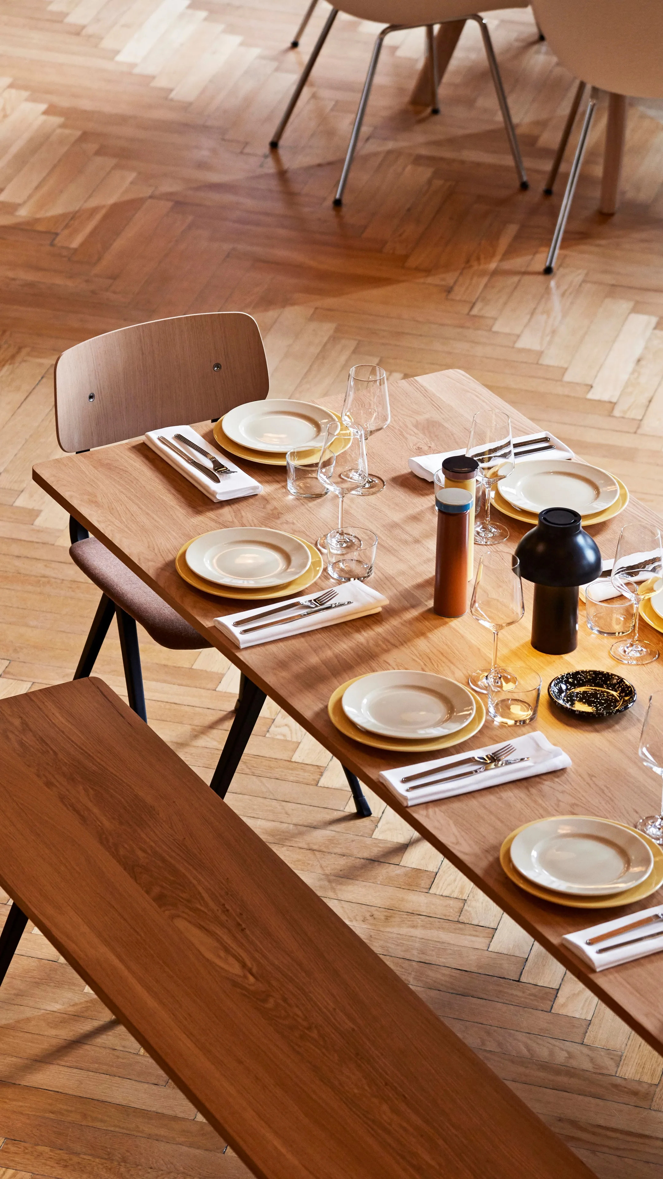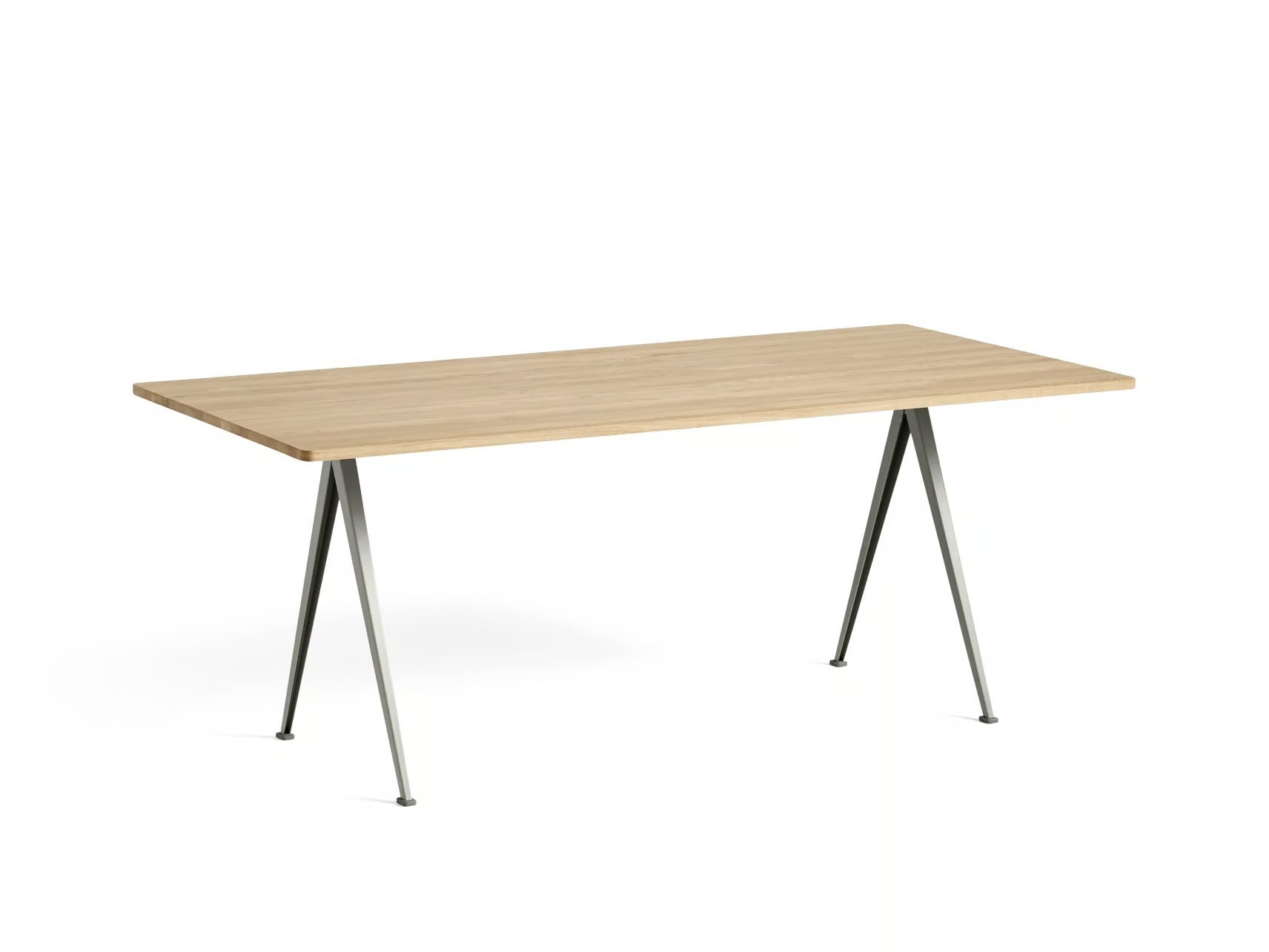 A Pyramid Table 02 a sokoldalúság, könnyedség és erő jegyében készült, a kivágott acéllemez konstrukció csúcsa. Az 1950-es években Wim Rietveld által tervezett, majd a HAY és az Ahrend által újraindított kollekció az acéllemez innovatív felhasználásával vált híressé. Az asztal egyszerű szerkezete és anyagtakarékos kialakítása miatt könnyen mozgatható, így ideális választás irodai asztalnak, étkezőasztalnak vagy modern asztalok közé. A változat egy acéllemez alapot és egy téglalap alakú tölgyfa asztallapot kombinál, amely letisztult megjelenést biztosít. Tartós és könnyen tárolható, így oktatási intézményekben, vállalati környezetben és vendéglátóipari egységekben is megállja a helyét. Többféle fa- és alap színben elérhető, így könnyen illeszthető bármilyen enteriőrbe.