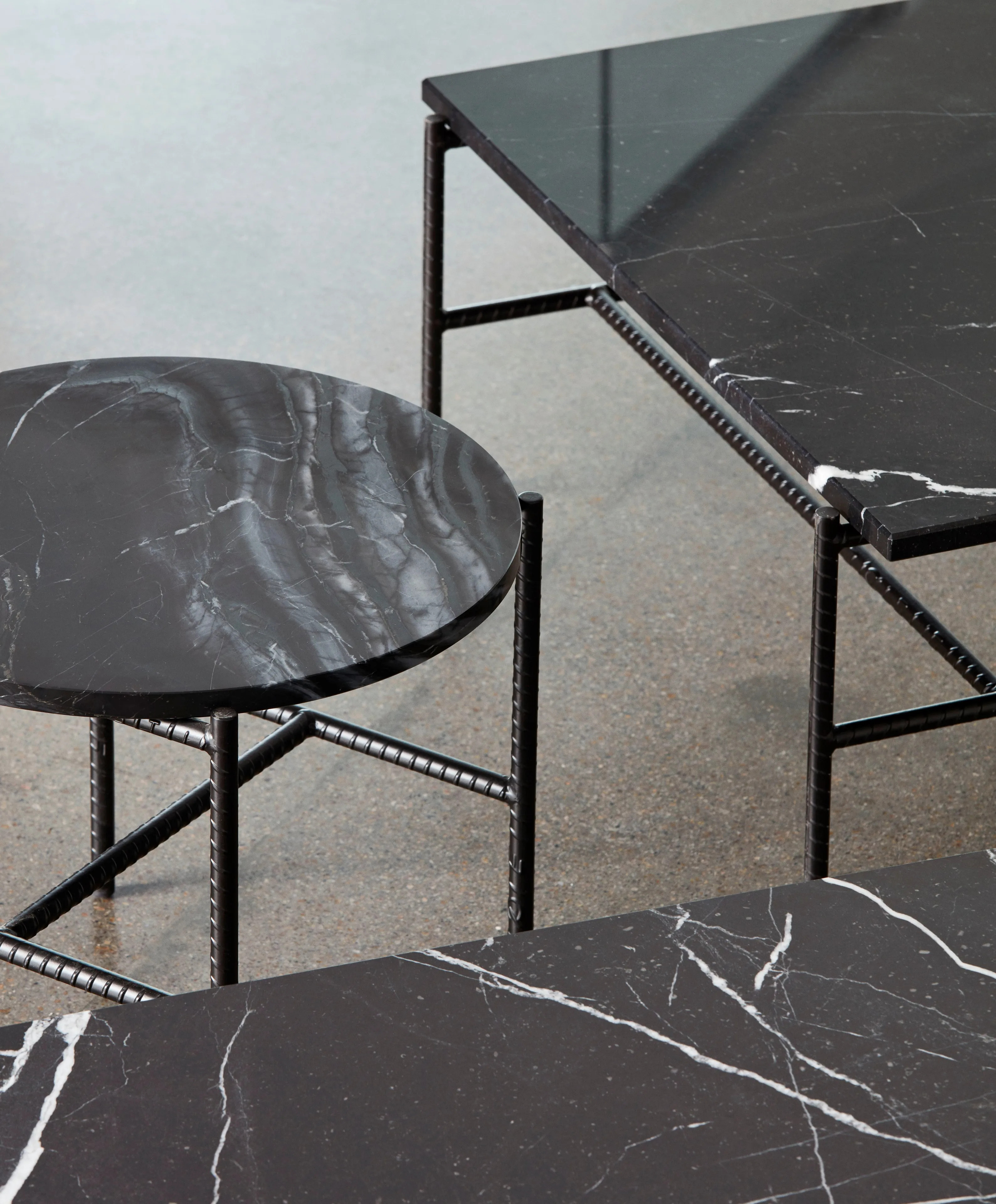 Sylvain Willenz Rebar kollekciója a kávézóasztalok, oldalasztalok és tálcás asztalok sorozata, amely a konstrukciós anyagok és eljárások újragondolásának lehetőségeit vizsgálja. A design a megerősített acélkeretet fekete márványlapokkal és fém tálcákkal kombinálja, így teremtve meg a harmonikus esztétikát. Az asztalok különböző méretekben, kerek, négyzet és téglalap alakban érhetők el, és alkalmasak magán-, vállalati vagy közösségi terekben való használatra. Az étkezőasztal 18 mm-es polírozott márvány asztallappal és letört élekkel rendelkezik. A 16 mm-es teljesen hegesztett acélkeret átlátszó szilikon ütközőkkel van ellátva.