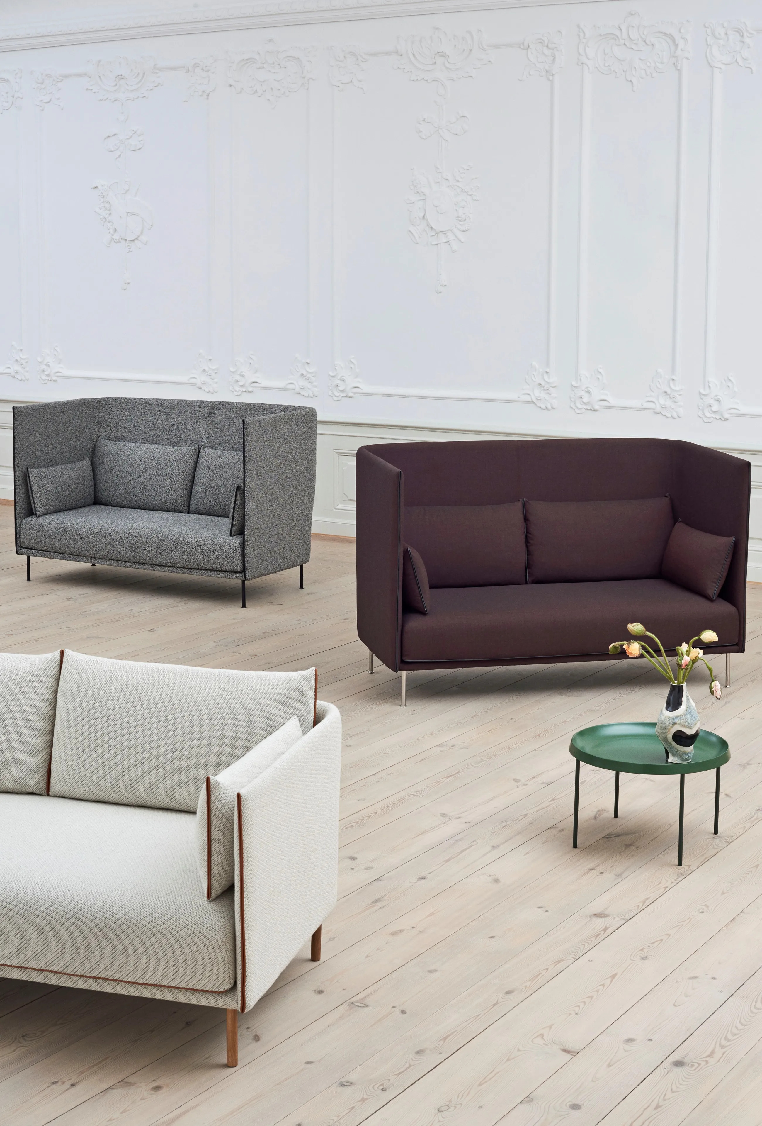 A GamFratesi által tervezett Silhouette High Back kanapé sorozatot a háttámla sima íve jellemzi, amely erőteljes karaktert és egyszerű, organikus megjelenést ötvöz. Az elülső nézet szögletes, a részletek pedig határozottak, így a kanapé kompakt és helytakarékos, mégis tágas és kényelmes ülőhelyet biztosít. A sorozat különböző méretű és magasságú kanapékat tartalmaz, fém vagy tömör fa lábakkal, valamint számos kiválasztott textillel. A különböző konfigurációk és a markáns szerkezeti nyelvezet révén a kanapé ideális választás a tér meghatározására és intimitás megteremtésére mind nagy, mind kis terekben, legyen szó irodai, szállodai vagy vendéglátóipari környezetről. A váz erősített üvegszálas héjból készült, PU habbal kárpitozva, míg az ülőpárnák poliuretán habból állnak. A lábak 17,5 cm magasak, porfestett acélból, krómozott acélból vagy tömör tölgyből készülnek. Számos standard szövet és bőr közül választható, négy különböző alapfelülettel: fekete porfestett acél (RAL 9005), krómozott acél, olajozott tömör tölgy, füstölt tömör tölgy.