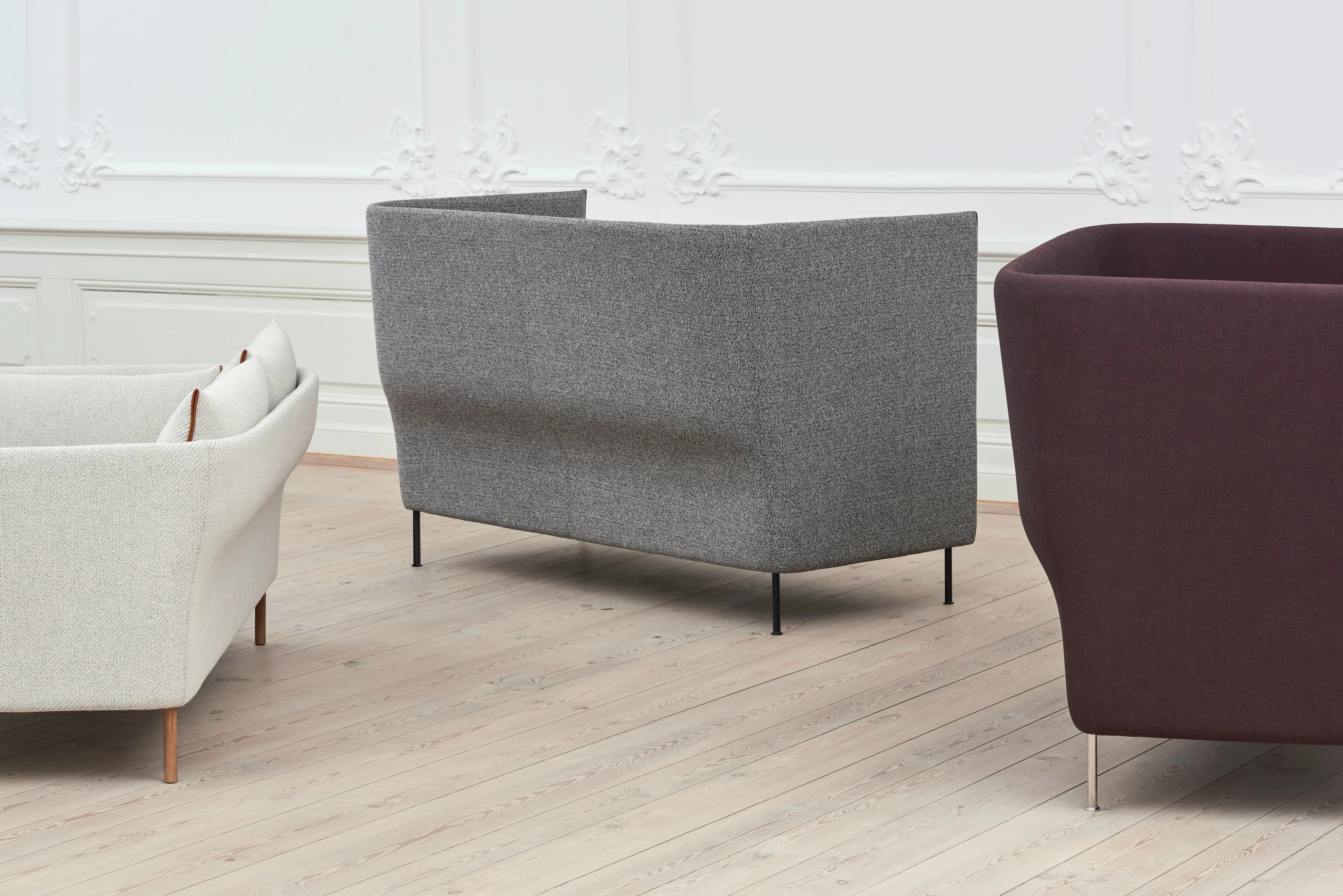 A Silhouette High Back kanapé sorozatot a háttámla sima íve jellemzi, amely erőteljes karaktert és egyszerű, organikus megjelenést ötvöz. Az elülső nézet szögletes, a részletek pedig határozottak, így a kanapé kompakt és helytakarékos, mégis tágas és kényelmes ülőhelyet biztosít. A sorozat különböző méretű és magasságú kanapékat tartalmaz, fém vagy tömör fa lábakkal, valamint számos kiválasztott textíliával. A különböző konfigurációk és a markáns szerkezeti nyelvezet révén a kanapé ideális választás a tér meghatározására és intimitás teremtésére mind nagy, mind kis terekben, legyen szó irodai, szállodai vagy vendéglátóipari környezetről. A váz üvegszálas héjból készült, PU habbal kárpitozva, a párnák toll és hab kombinációjával töltöttek. A lábak 17,5 cm magasak, elérhetők fekete porszórt acél, krómozott acél, olajozott vagy füstölt tömör tölgy kivitelben. Széles választékban kapható standard szövetekkel és bőrökkel.