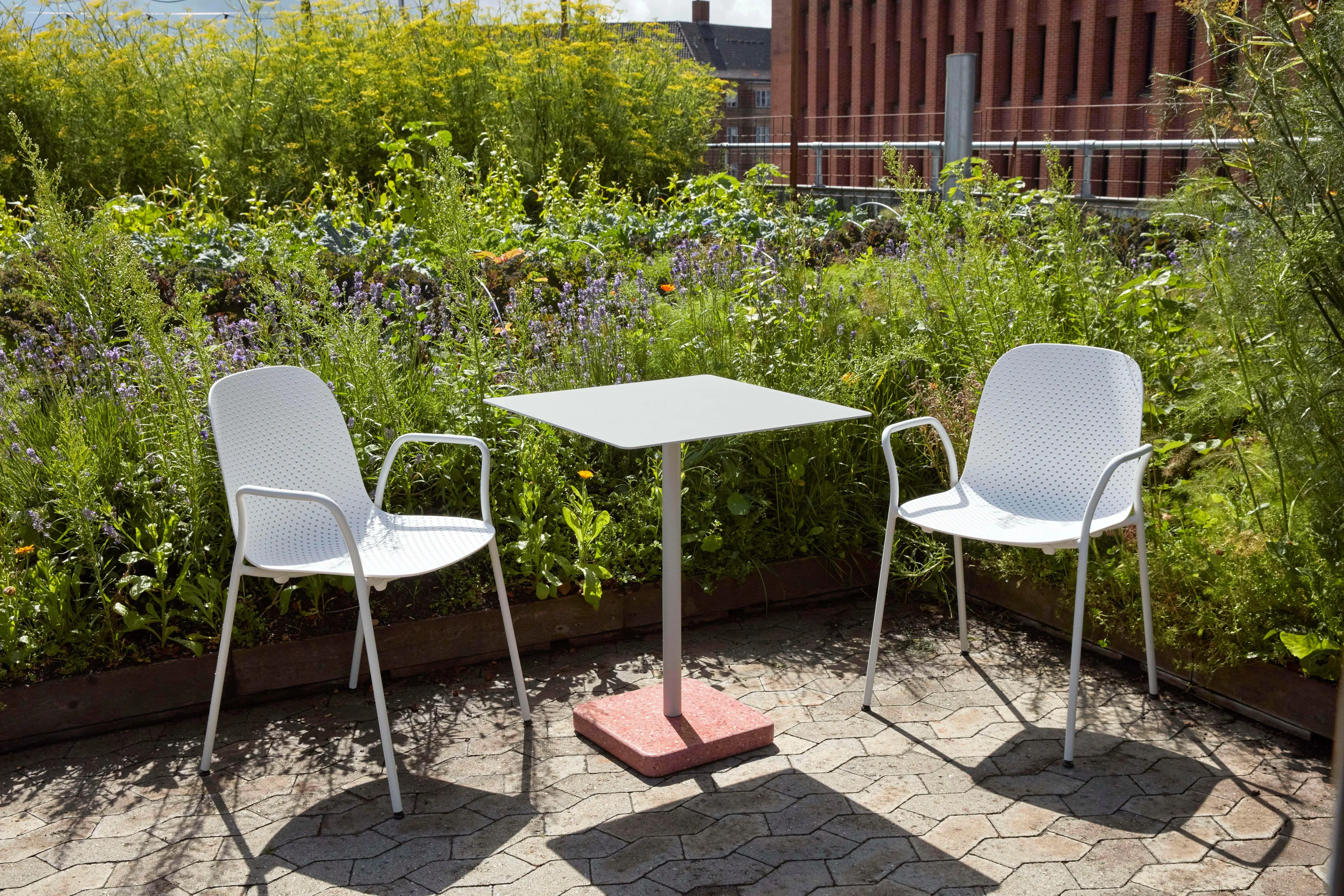 A svéd tervező, Daniel Enoksso által megálmodott Terrazzo asztal kerek vagy négyzet alakú asztallappal rendelkezik, amelyet elektrogálvanizált acélból készítettek, és porszórt bevonattal láttak el a tartósság érdekében. A Terrazzo alapanyag választása nemcsak a kiváló tartóssága miatt volt kézenfekvő, hanem a különleges és jellegzetes megjelenése miatt is, amely hatékony kontrasztot alkot az asztallap egyszerűségével. Az asztal kültéri környezetben is megállja a helyét, így alkalmas beltéri és kültéri használatra egyaránt. Az asztallap és oszlop elektrogálvanizált acélból készült, kültéri porszórt bevonattal. Az alap polírozott Terrazzo. Az asztallap két színben érhető el: antracit (RAL 9011) és égkék szürke (RAL 7038). Az alap kétféle kivitelben kapható: szürke és vörös Terrazzo.