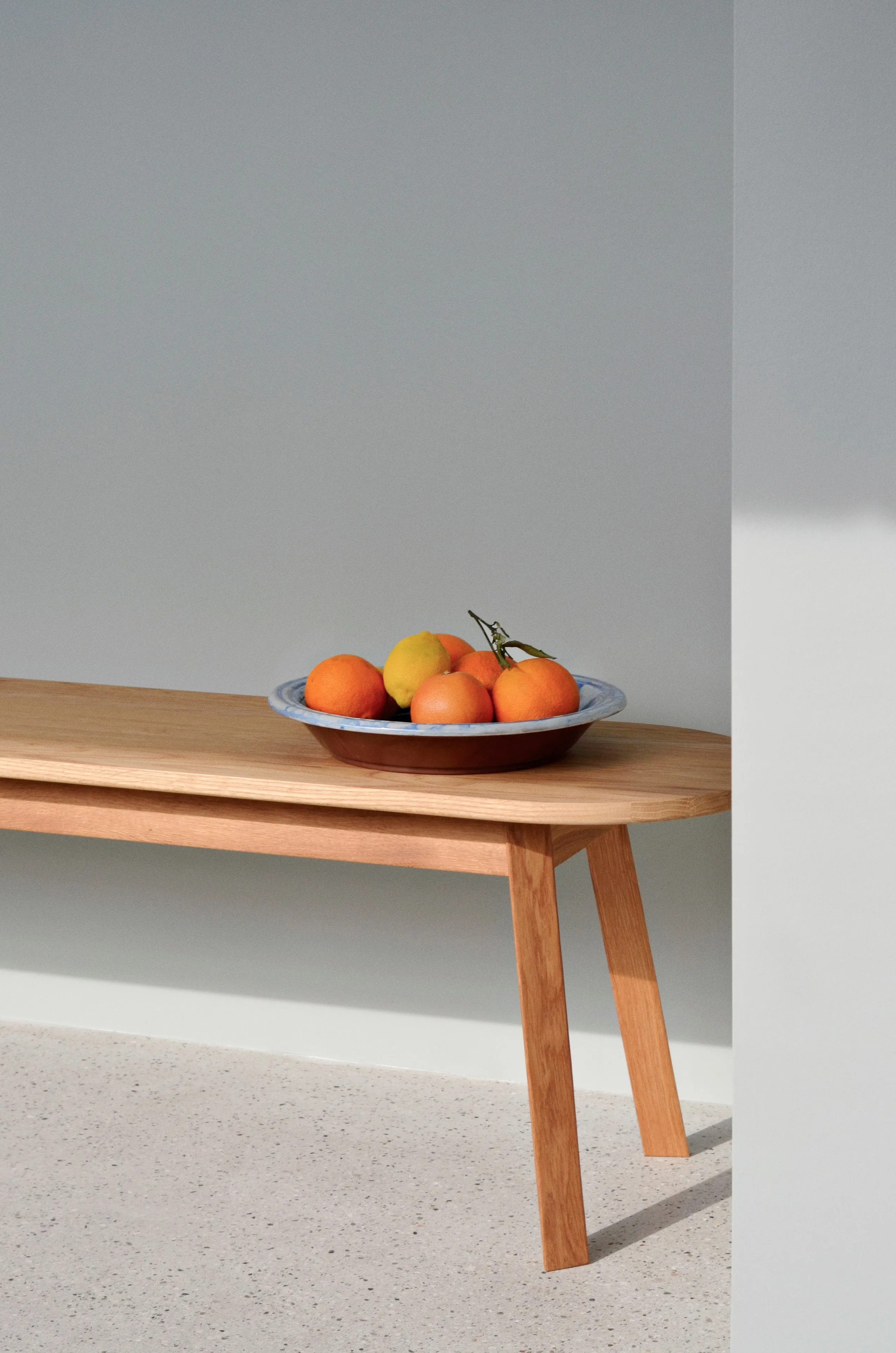 A TRIANGLE LEG asztal és pad sorozatot Simon Jones tervezte, hogy több helyet biztosítson egy kör alakú asztal körül. Az asztallap és a pad téglalap alakú végei lekerekítettek, így barátságos környezetet teremtenek, amely maximalizálja az ülőhelyek számát. A szilárd tölgyfából készült, olajozott, szappanozott vagy vízbázisú lakkozott felülettel rendelkező sorozat sokoldalúan alkalmazható étkezőasztalként, irodai asztalként vagy modern asztalok részeként különféle magán- és közösségi terekben. A 22 mm vastag tölgy asztallap alá szerelt tartórudak biztosítják a stabilitást. A négy tömör fa láb rejtett, csavarozható, állítható talpakkal rendelkezik, amelyek akár 12 mm-rel is meghosszabbíthatók az egyenetlen felületek kiegyenlítésére. Három különböző felületkezeléssel érhető el: vízbázisú lakkozott, szappanozott és olajozott tölgy.