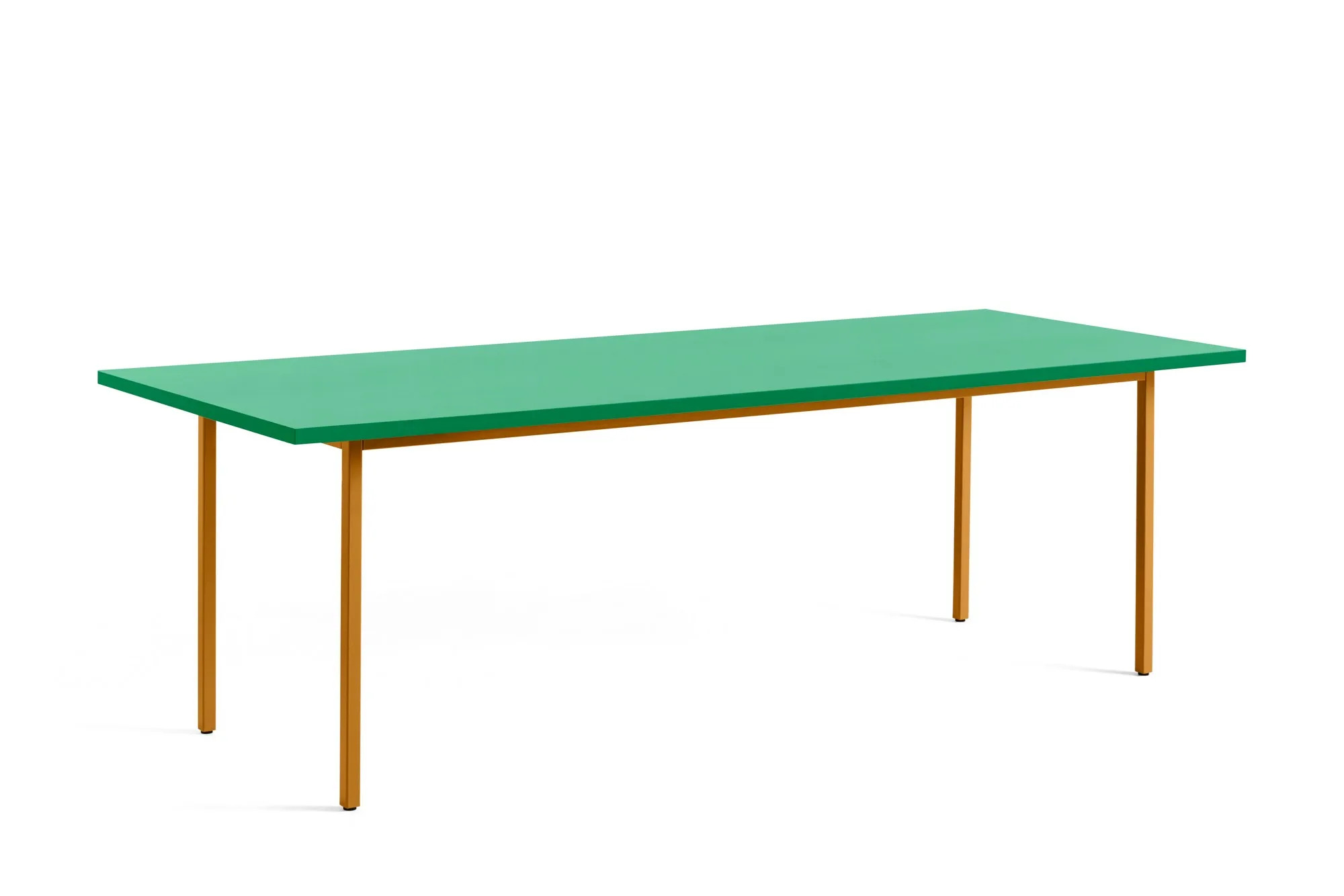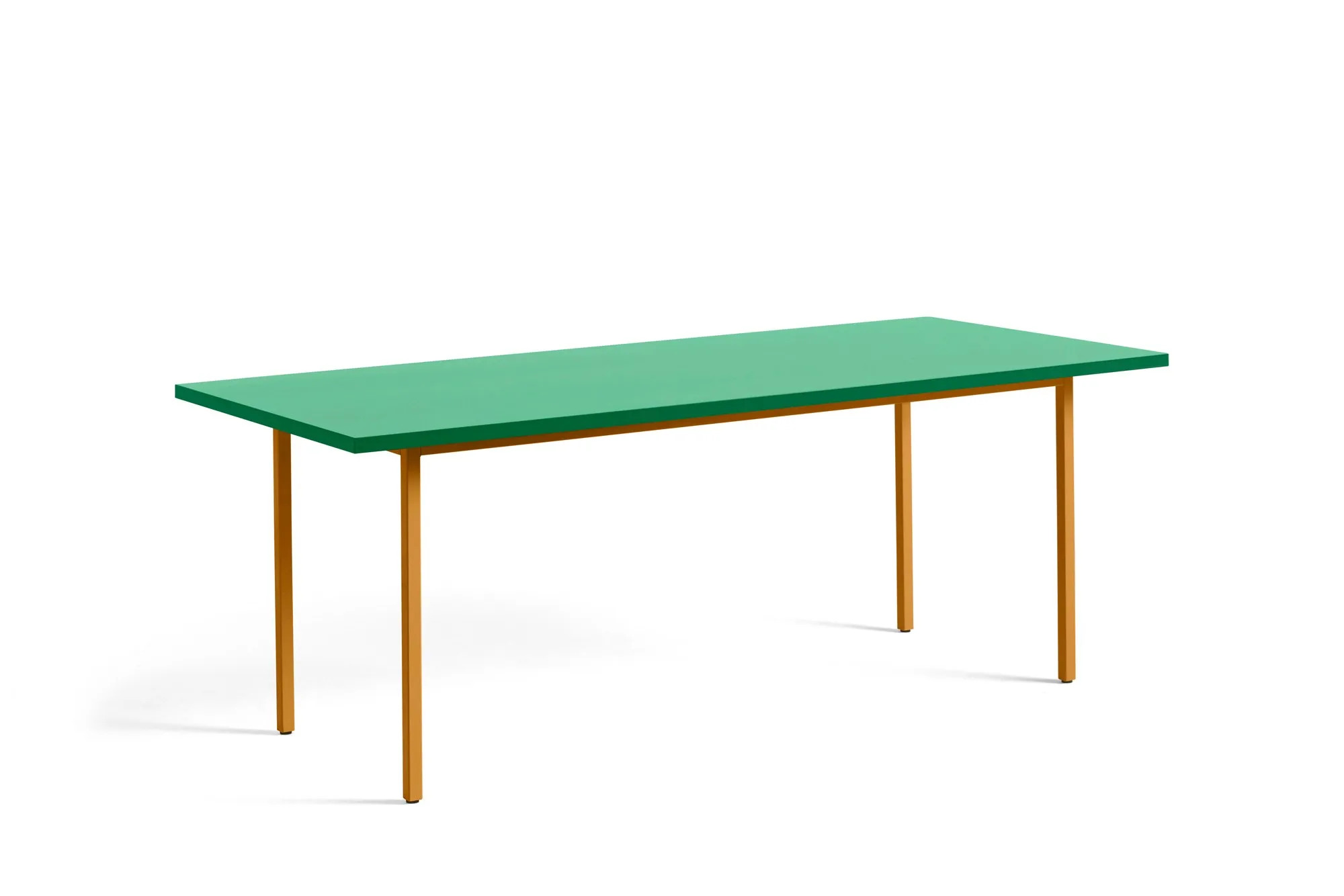 A belga tervezők, Muller Van Severen által megálmodott Two-Colour asztalsorozat a különböző anyagok kontrasztjaira és hasonlóságaira épít. Az acélcső lábak optimális szilárdságot és stabilitást biztosítanak, míg az asztallap organikus színű Valchromatból készül, amely egy különleges, FSC-tanúsítvánnyal rendelkező, robusztus MDF anyag, vízbázisú lakkal kezelve. Az egyenletes vastagságú elemek egységes sziluettet alkotnak, amelyet a színek kontrasztja tesz különlegessé. A Two-Colour különböző formákban, méretekben és színkombinációkban érhető el, így tökéletes választás kávézókba, éttermekbe, irodákba és közösségi terekbe. A 30 mm vastag Valchromat látható fa szálakkal rendelkezik, a porszórt acélcső váz és lábak pedig magas fényűek. A beépített, műanyagból készült, 12 mm-ig állítható csúszkák biztosítják a stabilitást.