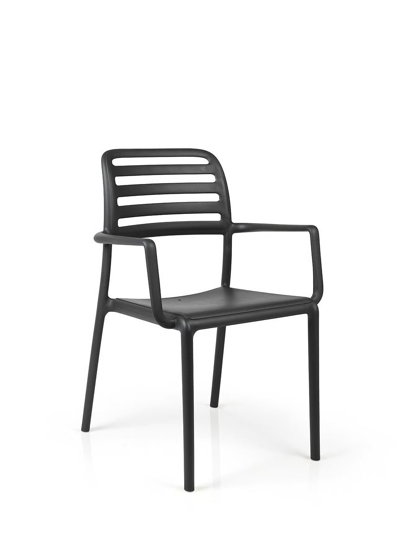 A Costa szék minimalista vonalvezetésével és karfás, léces háttámlájával sokoldalú megoldást kínál különböző bel- és kültéri környezetekben. Az egybefüggő keret lekerekített profilokkal és sarkokkal rendelkezik, eredeti és könnyed kialakítása újrahasznosítható, UV-kezelt, tömegében színezett üvegszálas gyantából készült, matt felülettel. Könnyen egymásra rakható, a Costa világoskék, agávé, galambszürke, antracit, fehér és piros színekben érhető el. Csúszásmentes lábakkal felszerelt, méretei: szélesség 58,5 cm, mélység 57 cm, háttámla magassága 86 cm, ülésmagasság 46,5 cm. Alkalmas étkezőasztalokhoz, irodai asztalokhoz, modern asztalokhoz és kávézó székekhez.