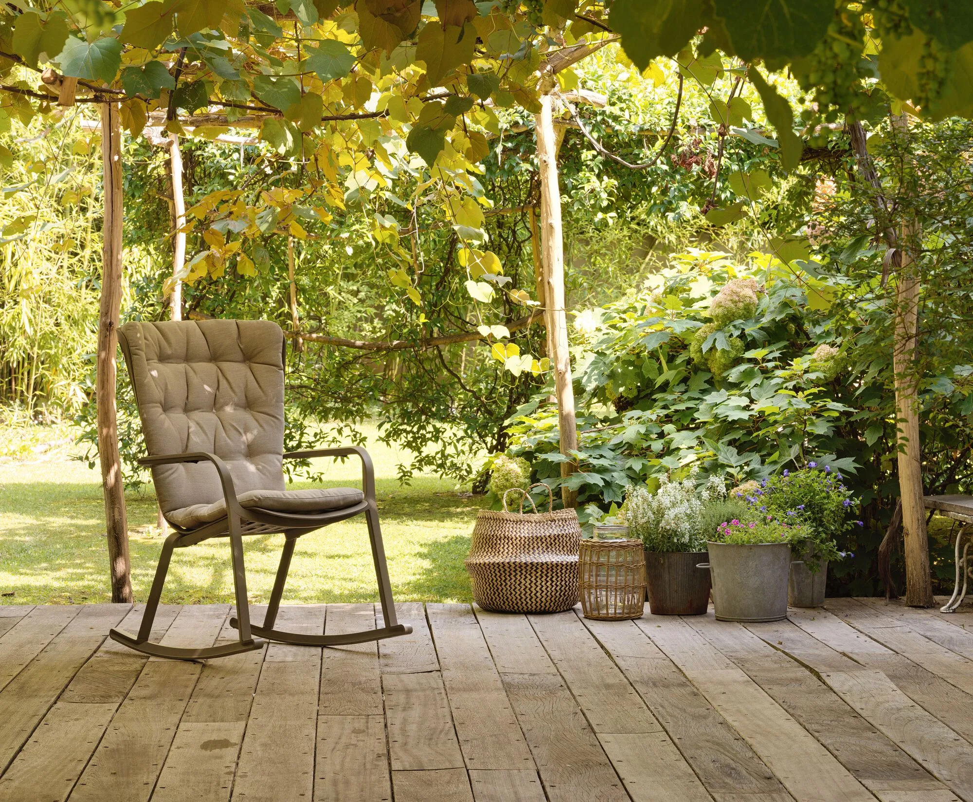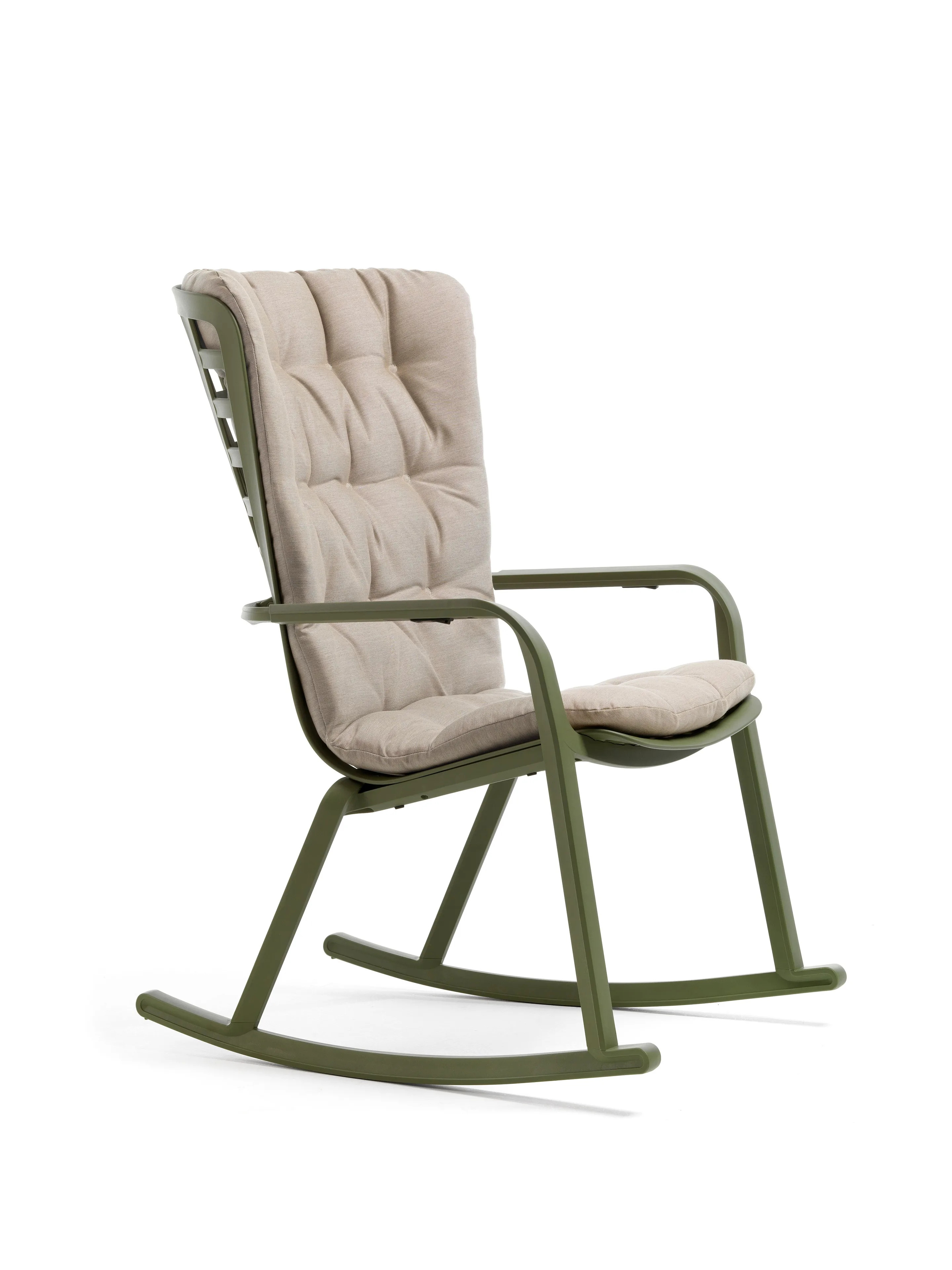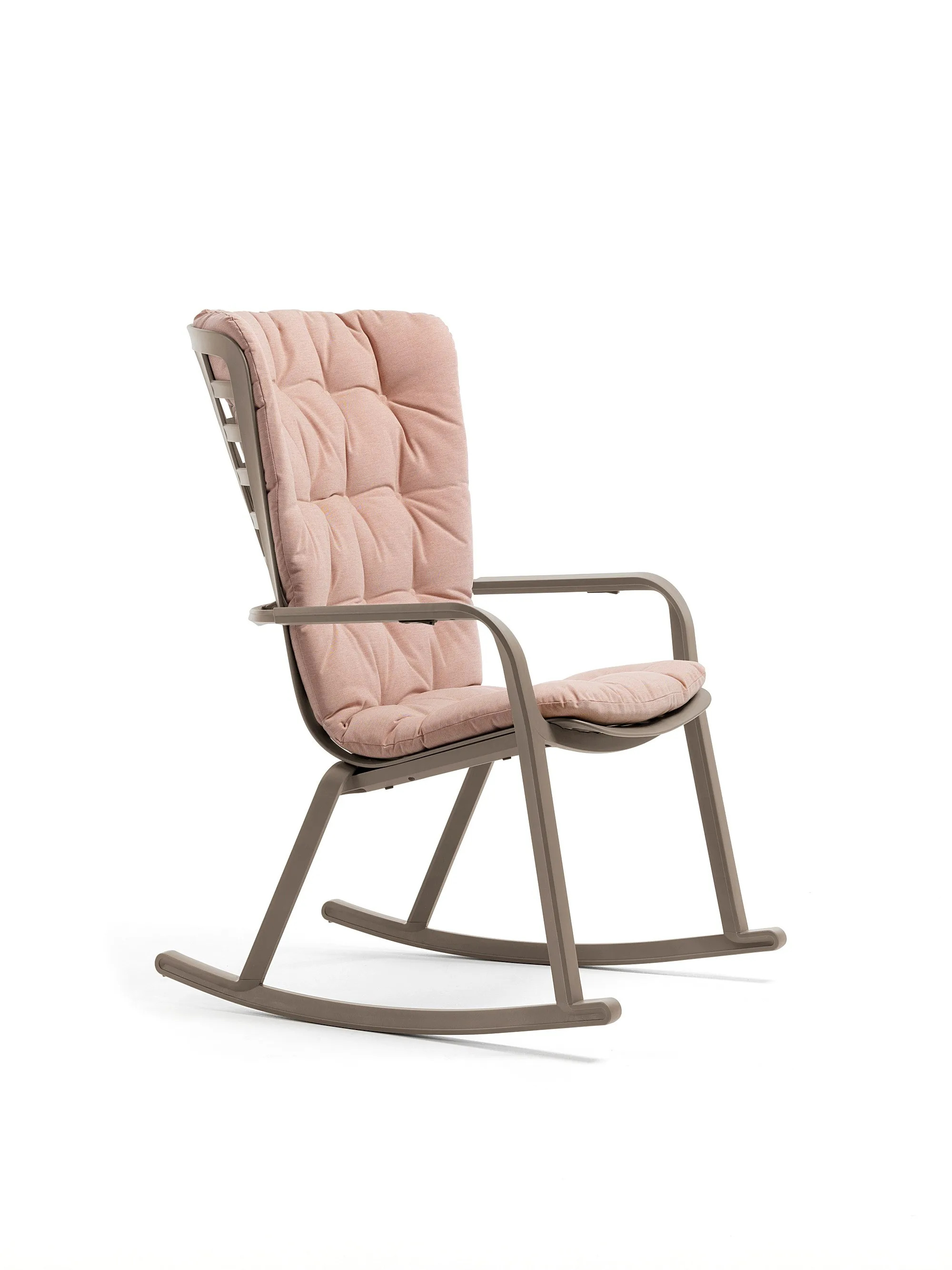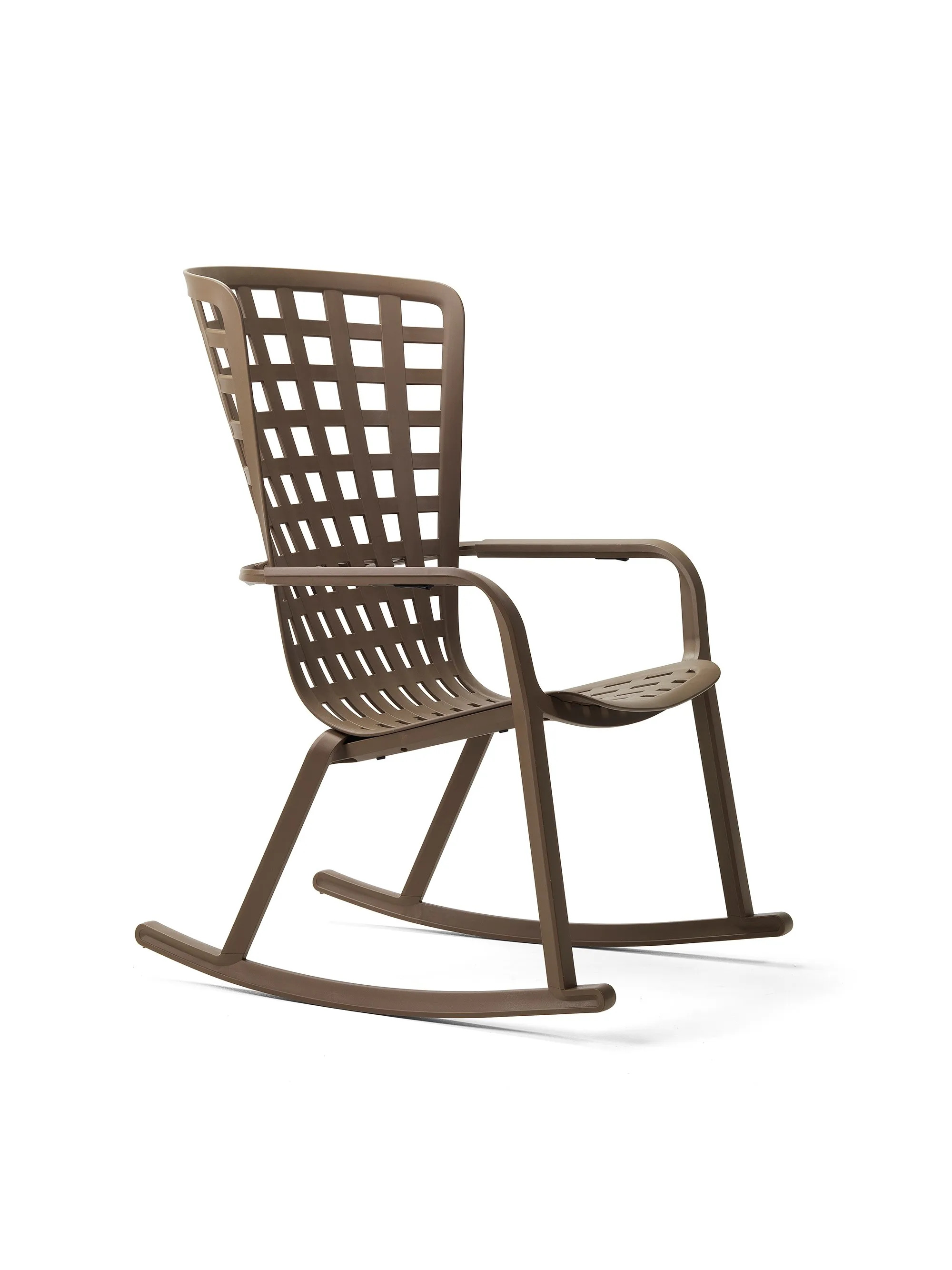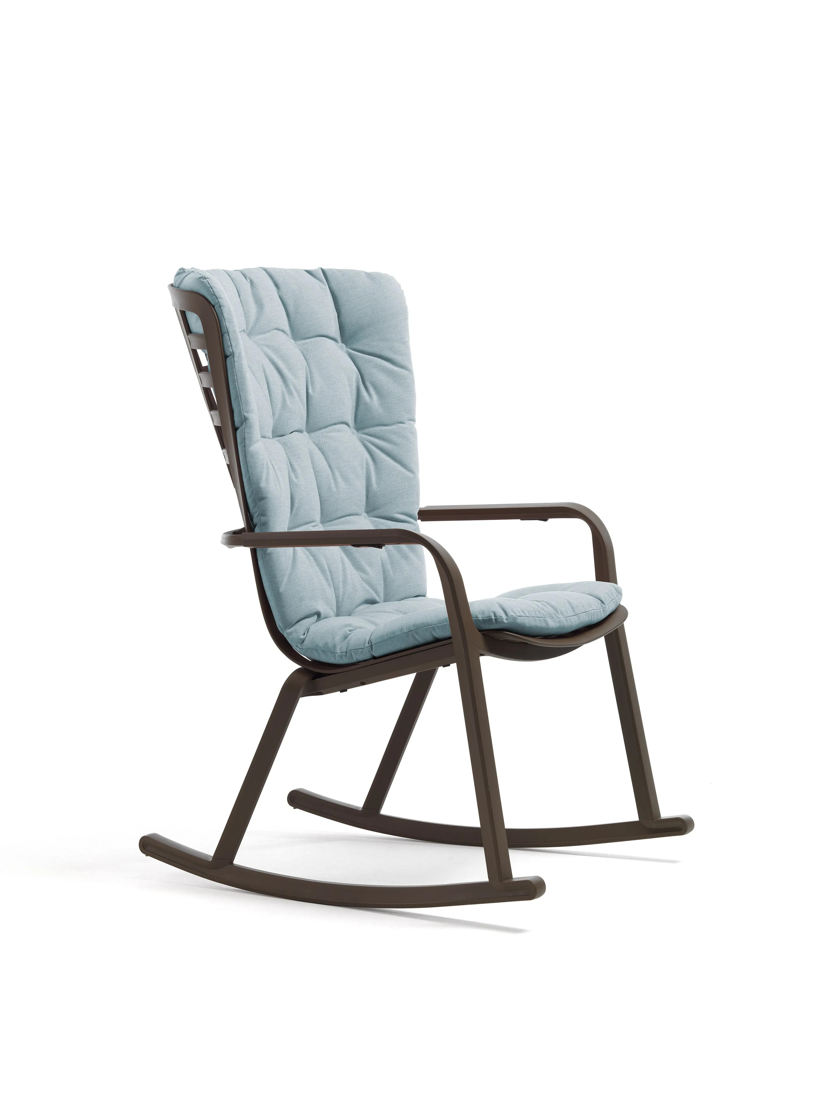 A FOLIO ROCKING egy modern, kültéri használatra tervezett hintaszék, amely üvegszálas gyantából készült, perforált négyzetmintával és matt felülettel. Az ergonomikus háttámla és a mélyen ülő ülőfelület egyetlen, elegáns szerkezeti egységet alkot, amely két kényelmes pozícióba dönthető. Az alap két ívelt polipropilén talpból áll, amelyek a székhez rögzíthetők, így biztosítva a hintaszékek jellegzetes ringató mozgását. A székhez választható elegáns párna is, különböző kültéri használatra alkalmas anyagokból és színekből. Az anyagok időjárásállóak, könnyen tisztíthatók és teljesen újrahasznosíthatók. A párnák puha belső része tökéletesen illeszkedik a szerkezethez, míg a fejpárna könnyen rögzíthető. A FOLIO kollekció része a Poggio lábtartó is, amely szintén üvegszálas gyantából készült, és azonos perforált mintával rendelkezik.