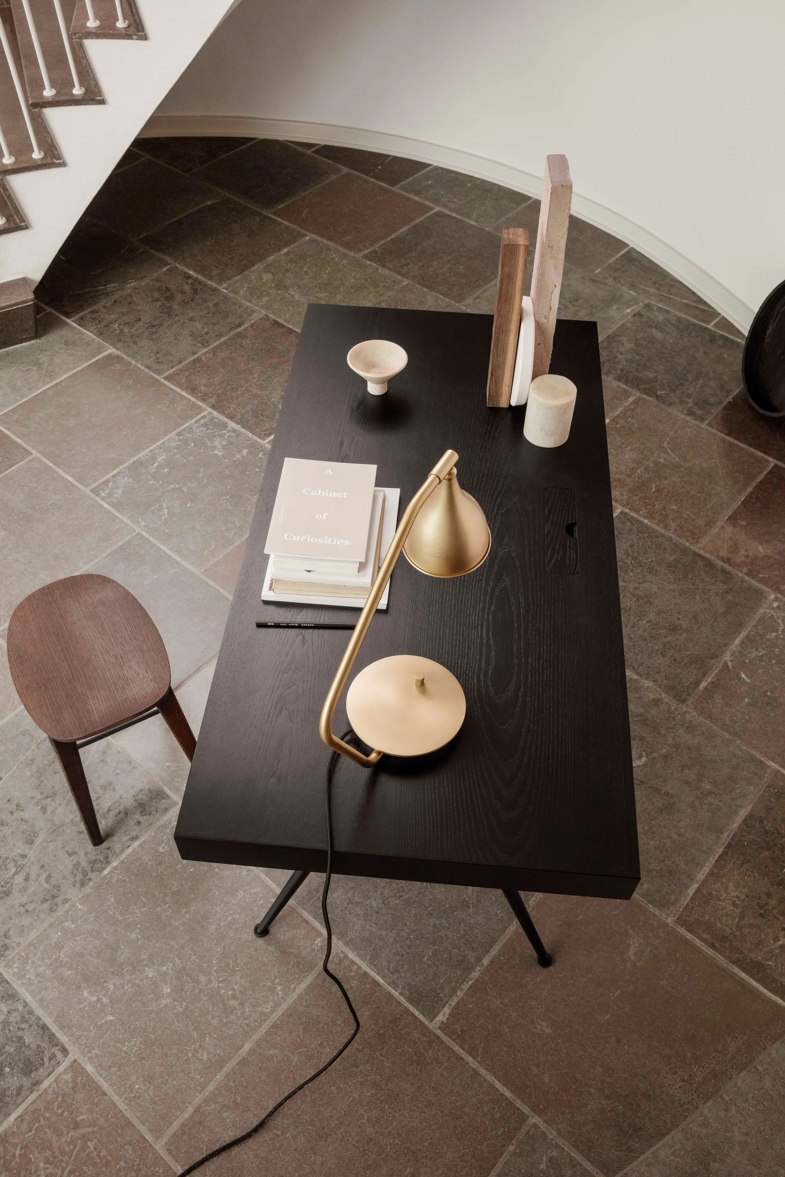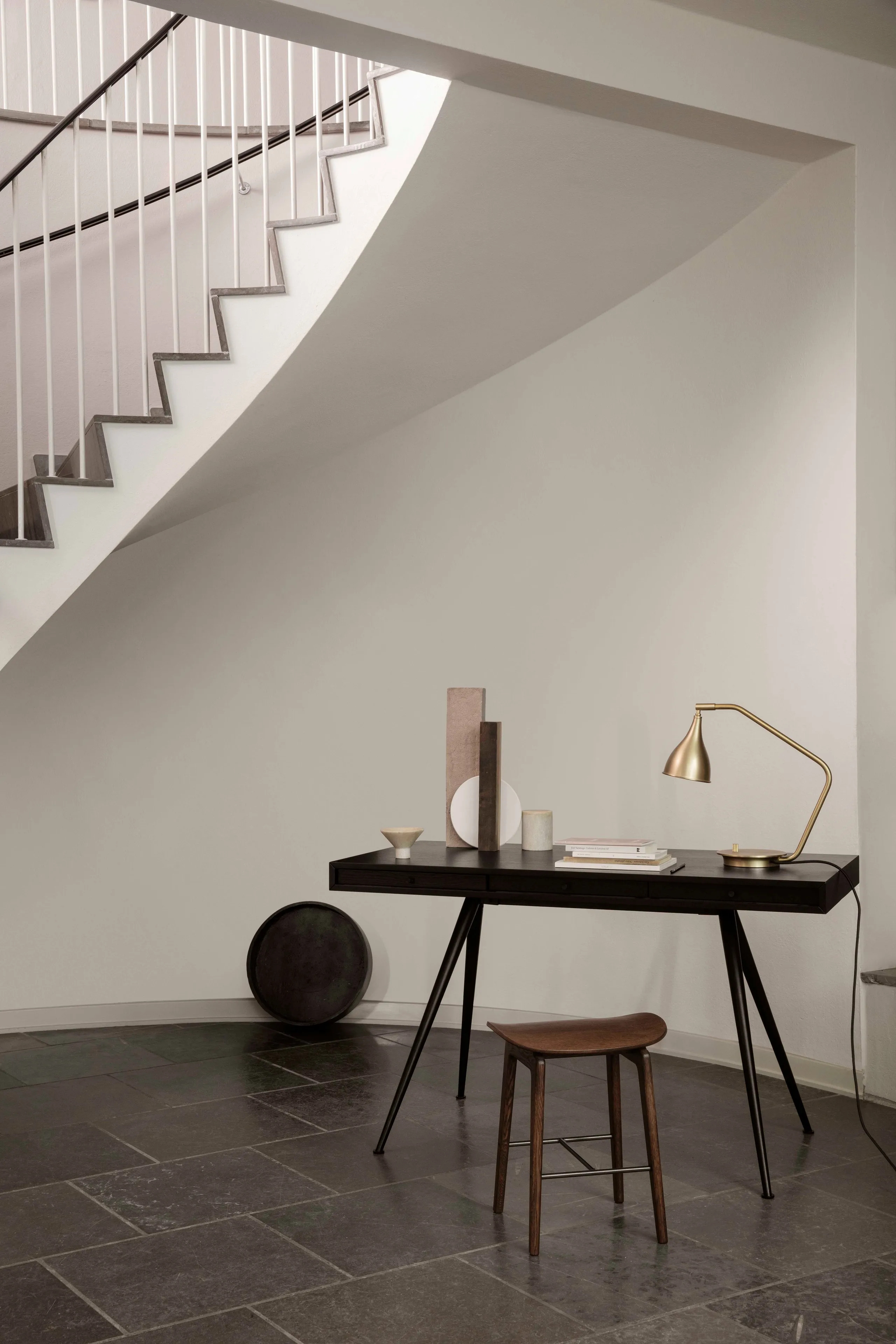 A 60-as évek ihlette JFK Office íróasztal letisztult és egyszerű formatervezésével ideális választás irodák, éttermek, kávézók és oktatási intézmények számára. Az asztal neve egy klasszikus dán dizájnra utal, amelyet John F. Kennedy elnök kapott ajándékba. Az asztal vékony, kőris furnér asztallappal rendelkezik, amelyen három beépített fiók található, és négy kúpos, fekete porszórt alumínium lábon áll. A fiókok apró, recézett gombjai a régi Jaguar rádiógombokra emlékeztetnek. Az asztallap rejtett helyet biztosít egy power bank számára, így könnyen csatlakoztatható laptop, asztali lámpa vagy okostelefon. A kábelek a lábakban elhelyezett kis nyíláson keresztül vezethetők, így a kábelek nem zavarják a padlót. Két méretben kapható, és sima magasságállítást kínál, hogy mindenki megtalálhassa az ideális magasságot ülve vagy állva.