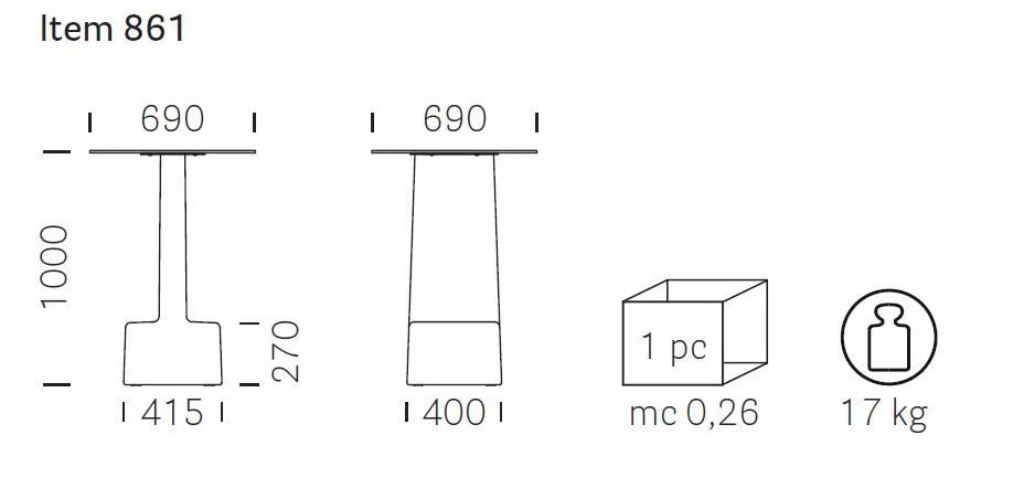 A SERIF 861 kollekció háromdimenziós kialakításával tűnik ki, amelyet az oszlopok építészeti elemei és a betűtípusok jellegzetes "serif" elemei ihlettek. Az étkezőasztal alapja forgóöntéssel készült polietilénből, míg a teteje masszív laminált anyagból áll. Ideális választás irodai asztalnak, modern asztalok közé sorolható, és tökéletesen illeszkedik éttermek, kávézók, oktatási intézmények, konferenciatermek és tárgyalótermek környezetébe. A design székek és kávézó székek mellett harmonikus egységet alkot, így különböző vendéglátóipari egységek és középületek számára is megfelelő.