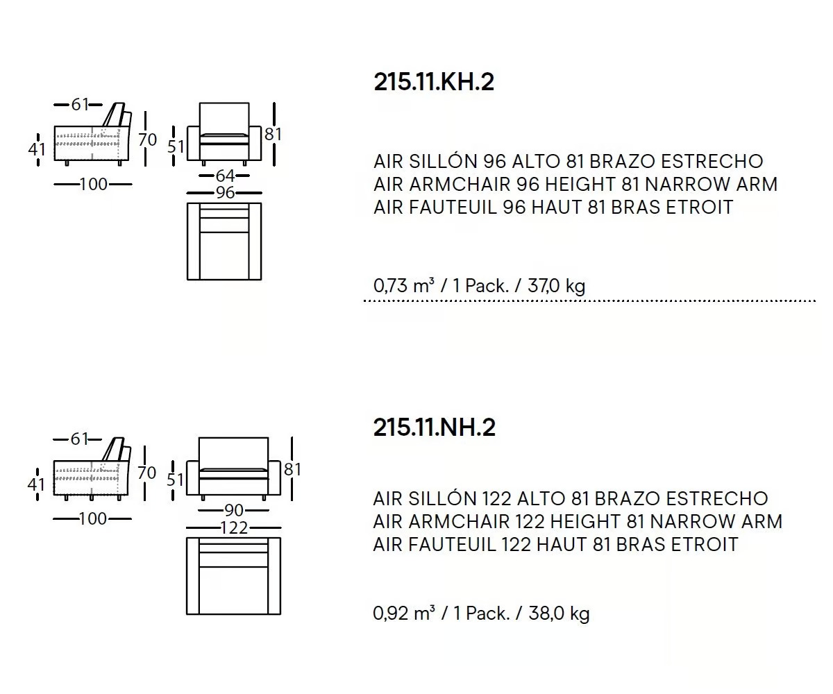 Az Air karosszék sokoldalúságát a mélység és magasság egyszerű variációival elérhető különböző kompozíciók jellemzik. A háttámla magassága választható 81 vagy 88 cm között. A karok háromféle kialakítása – széles, keskeny és magas – további lehetőségeket kínál, például kárpitozott asztalok, puffok és extra párnák formájában. A magas kar opció ideális sarokmodul kialakításához. A bükkfa lábak visszahúzottak, így a karosszék szinte lebeg a levegőben. A kárpitozott változat teljesen levehető huzattal rendelkezik, fa szerkezete CMHR 30kg habbal és 100g szálas héjjal van ellátva. Az ülőfelület 80mm NEA rugalmas szalaggal és CMHR 35kg habbal van felszerelve. A háttámla CMHR 30kg és CMHR 60kg habot tartalmaz. A párnák kétféle magasságban elérhetők, szilikon szálas belsővel. A fekete pácolt bükkfa lábak elegáns megjelenést biztosítanak.