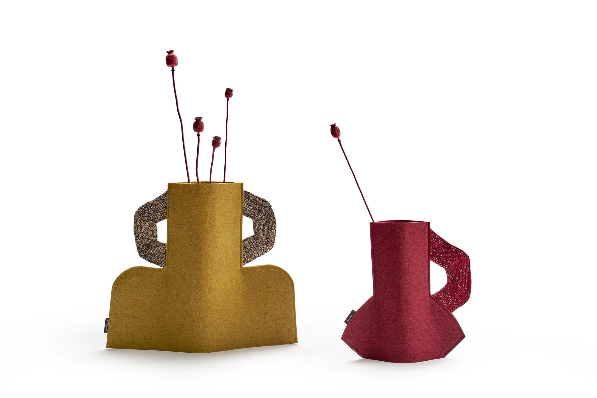 A FLOWER POWER RAW vázák a lakásdekoráció és lakberendezési kiegészítők világában különleges helyet foglalnak el. Ezek a textilvázák nemcsak virágok befogadására alkalmasak, hanem önálló díszítőelemként is megállják a helyüket. Az Estudio Sancal által tervezett vázák új, "Raw" változatai szürke, piros és sárga árnyalatokban érhetők el, melyek letisztult színpalettát képviselnek. A fonott fogantyúk otthonos jelleget kölcsönöznek a daraboknak. A vázák célja, hogy új életet leheljenek a hétköznapi műanyag palackokba, így környezetbarát megoldást kínálnak az otthoni dekoráció terén. A vázák tartósak, könnyűek és esztétikusak, a kiválasztott ipari filc anyag pedig meleg, rusztikus megjelenést biztosít. A FLOWER POWER RAW kollekció különböző méretekben és színekben érhető el, mint például Stone, Carmine, Taupe és Mustard.