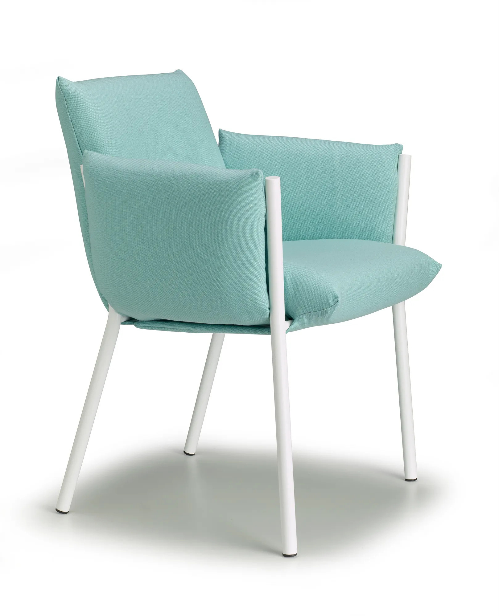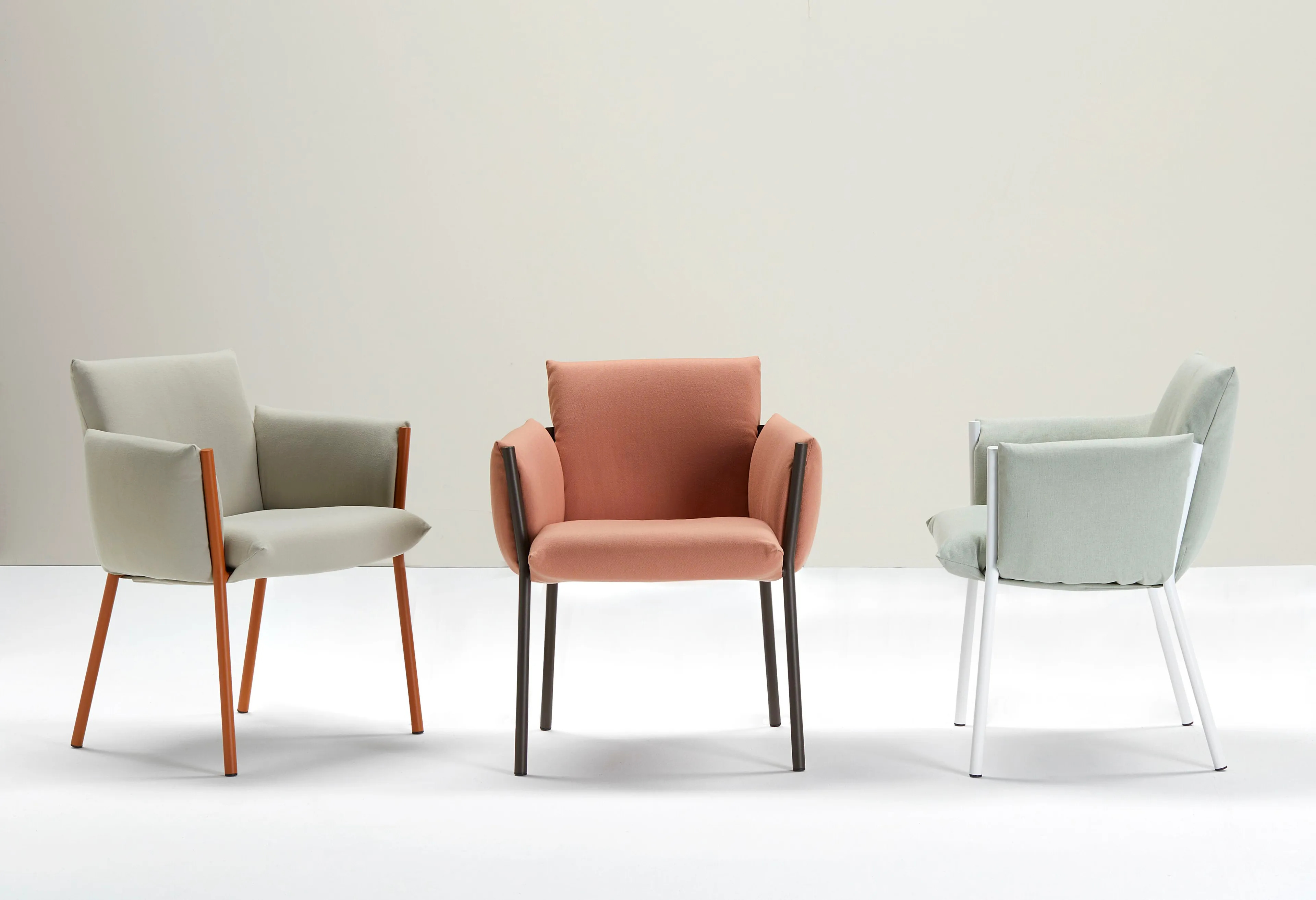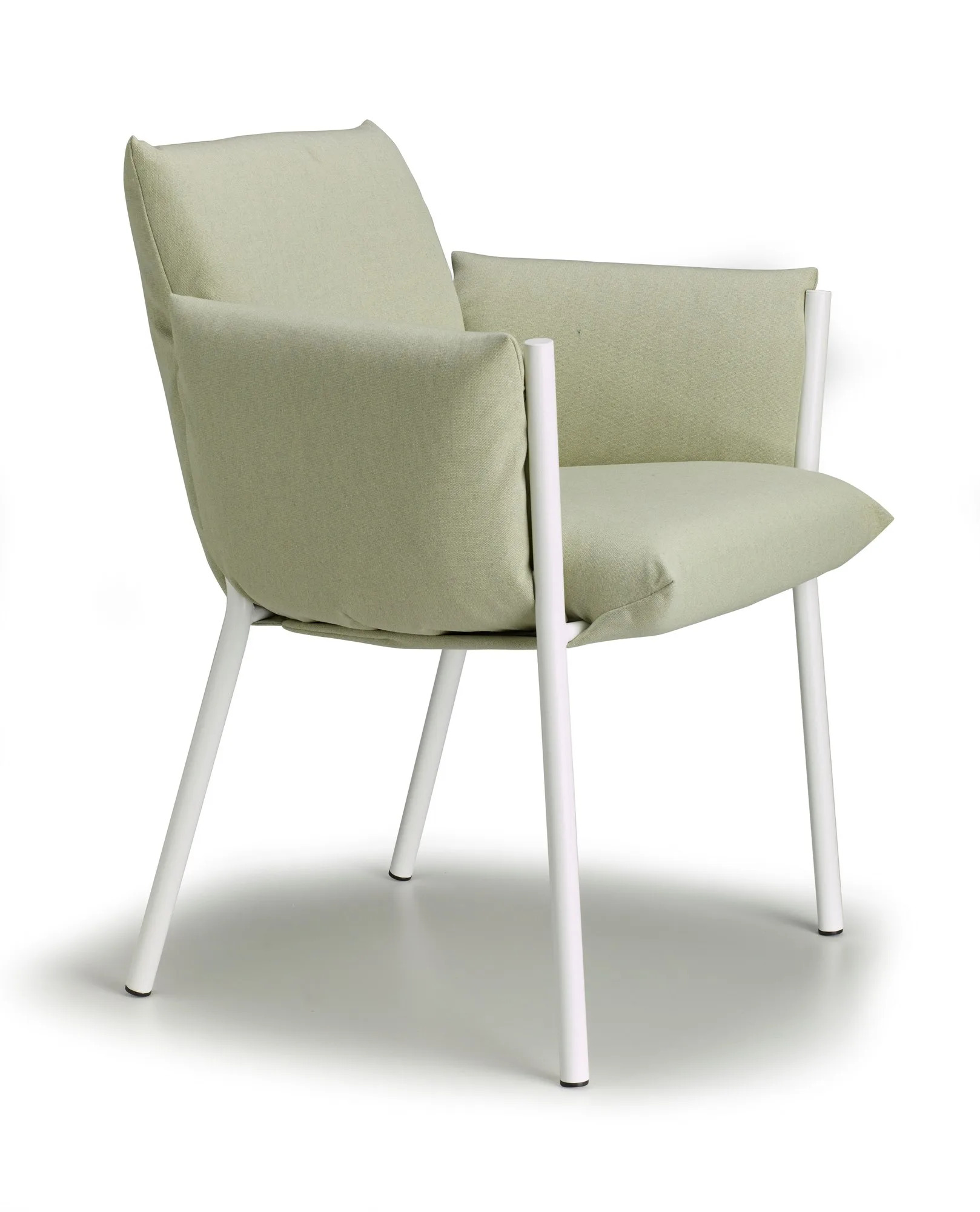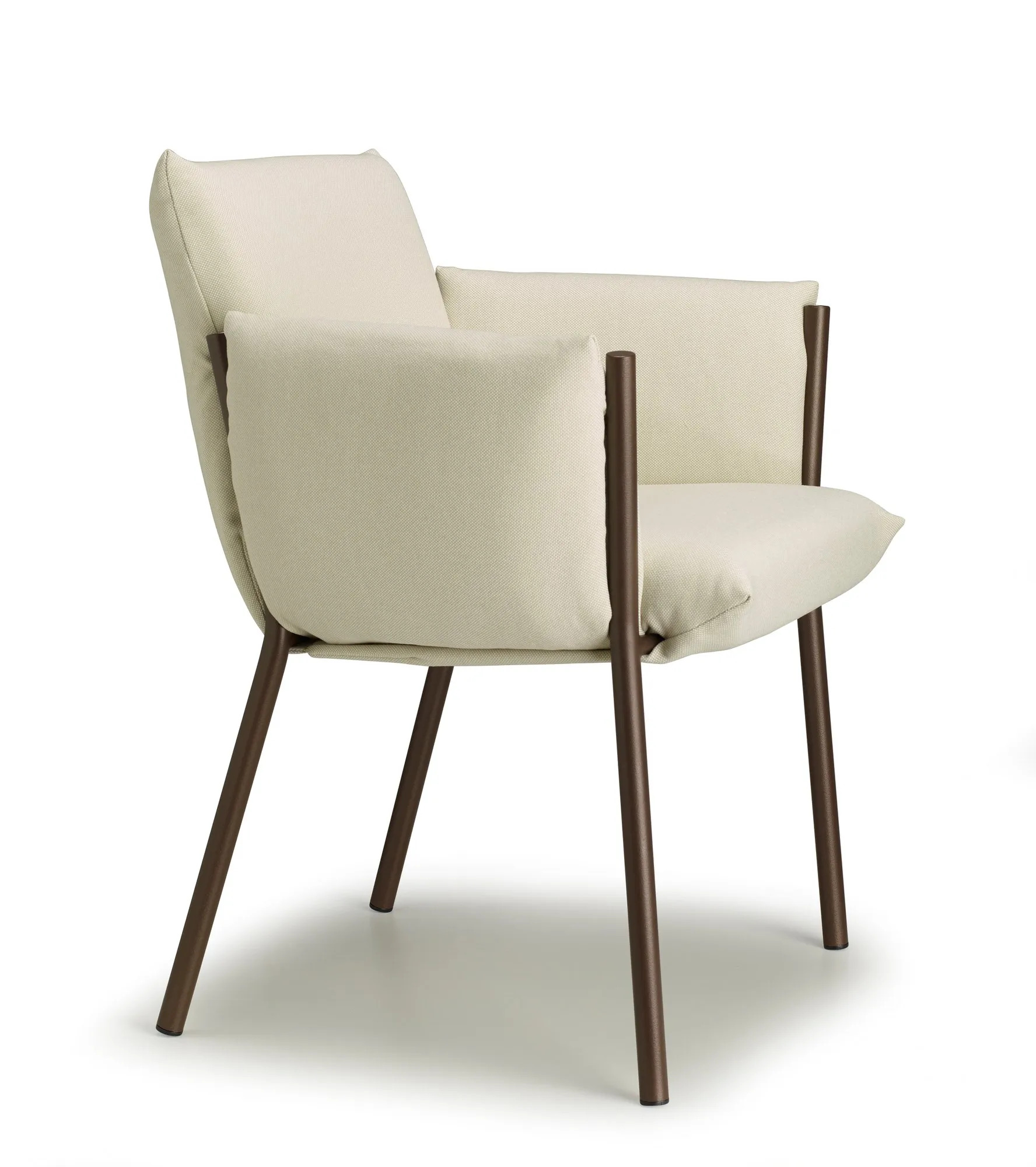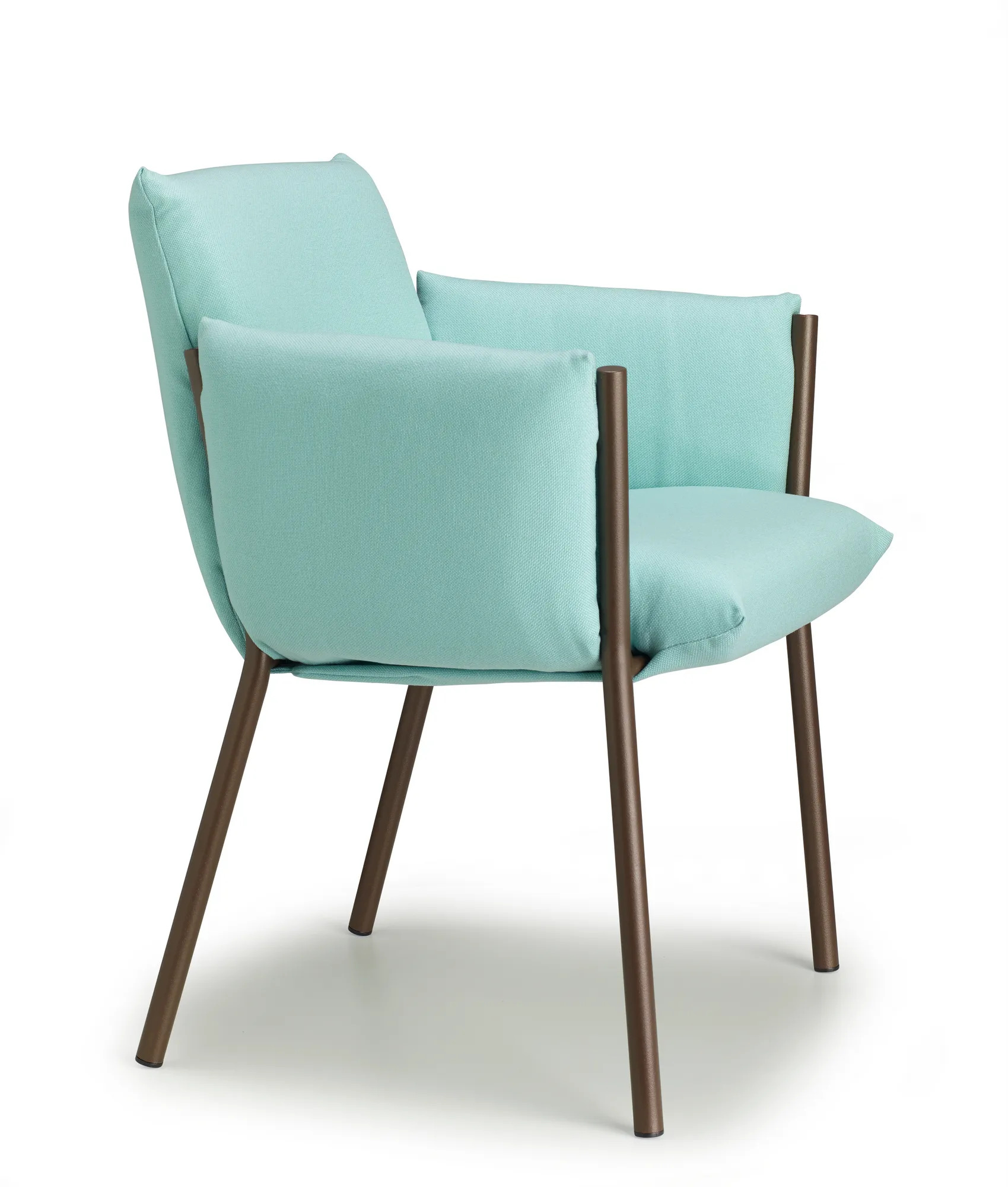 A Brezza szék 25 mm átmérőjű acélcső vázzal rendelkezik, amely len, galambszürke, antracit, olívazöld, mokka és terrakotta színekben érhető el. A széles választékú kárpitok között újrahasznosított, környezetbarát szövetek is megtalálhatók, amelyek új termékekké alakított hulladékokból származnak. Alessandro Stabile tervezésében a váz és a párnák innovatív módon kapcsolódnak össze, ötvözve a szilárdságot és az eleganciát. Az ülőfelületek könnyen rögzíthetők az egymásba illeszkedő elemekkel. A kerek fém lábak láthatóak maradnak, erőt és egyediséget kölcsönözve a széknek. A Brezza környezettudatossága az anyagválasztásban rejlik: újrahasznosított fonalból készült szövetek, ragasztómentes kialakítás, és a szállítási méret minimalizálása érdekében egymásra rakható vázak, csökkentve a CO2-kibocsátást.