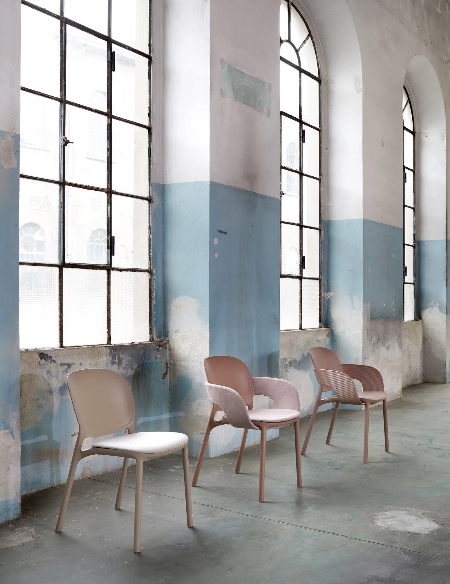 A HUG szék egy halmozható polipropilén ülőalkalmatosság, amely karfákkal rendelkezik. Különleges jellemzője a szék és a háttámla közötti sáv, amely harmonikus formáival biztosítja a kényelmet. Ez a dizájn elem beltéri és kültéri használatra egyaránt alkalmas, követve a modern trendeket, amelyek azonos esztétikai elveket alkalmaznak mindkét környezetben. Két változatban érhető el: az egyik teljesen technopolimerből készült, amelyet a sáv mentén dombornyomott csíkos minta díszít, a másik pedig párnázott ülőfelülettel és szövettel borított sávval rendelkezik a fokozott kényelem érdekében. A HUG kollekció a Meneghello Paolelli és az S•CAB együttműködésének eredménye, amely a használhatóság és fenntarthatóság kérdéseire is választ ad. A szék technopolimer monocoque szerkezetű, de rugalmas rendszerként különböző konfigurációkban is elérhető. A szék és a háttámla közötti sáv egyensúlyt teremt, amely új esztétikai és funkcionális dimenziót ad a terméknek.