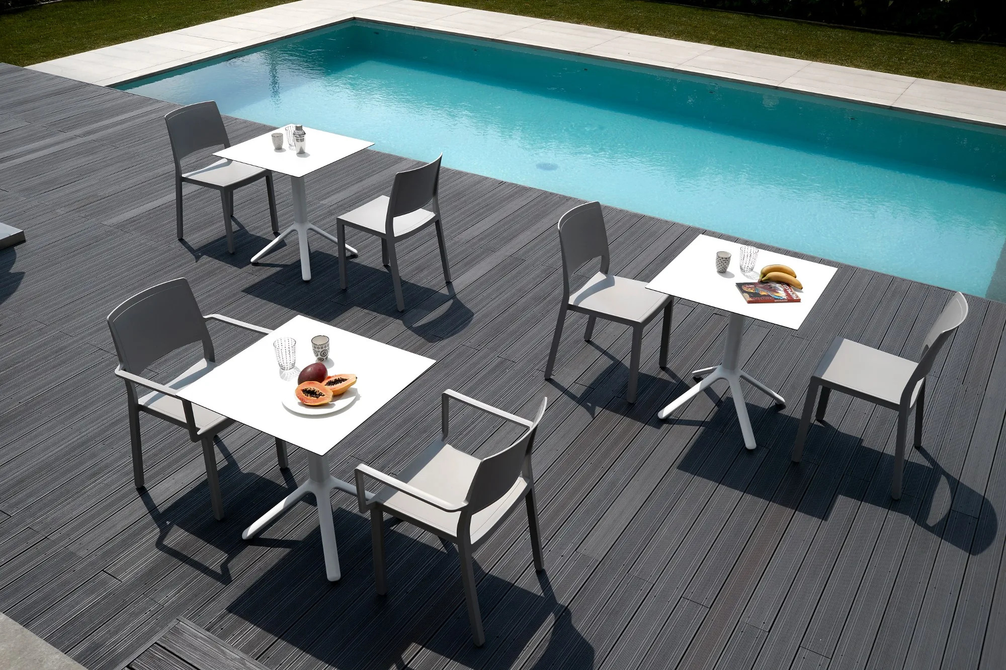 A NEMO egy négyzet alakú, lehajtható alumínium asztal, amely ideális választás irodák, éttermek, kávézók, oktatási intézmények, konferenciatermek és tárgyalótermek számára. A modern asztalok közé tartozik, amelyek praktikus megoldást kínálnak a helytakarékosságra. Az étkezőasztal kialakítása lehetővé teszi a könnyű tárolást és a gyors átrendezést, így rugalmasan alkalmazkodik a különböző igényekhez. A design székek és kávézó székek tökéletes kiegészítői lehetnek ennek az irodai asztalnak, amely a vendéglátóipari egységek és középületek számára is ideális. Az alumínium szerkezet tartósságot és stabilitást biztosít, miközben a letisztult formatervezés modern megjelenést kölcsönöz a térnek.