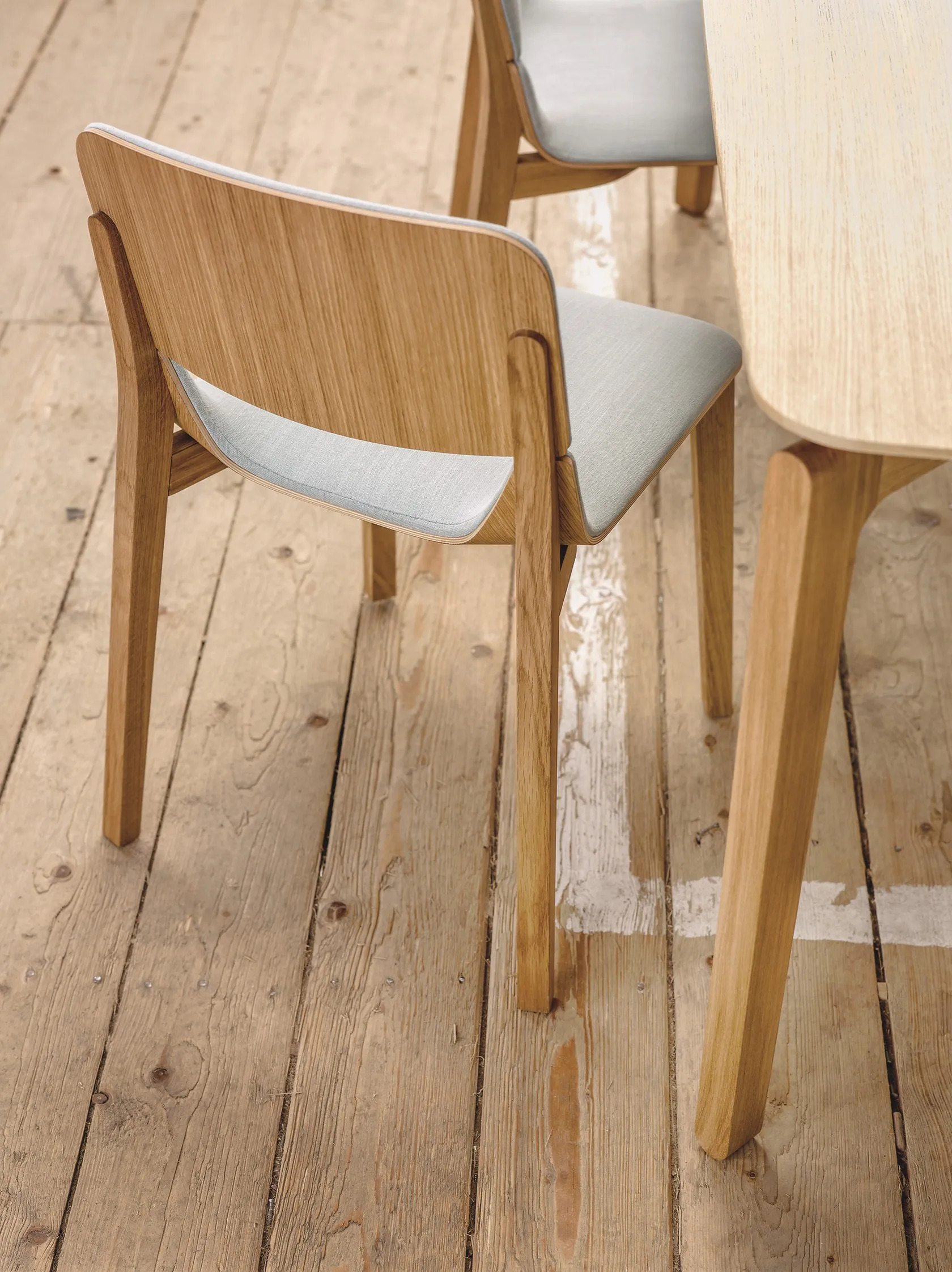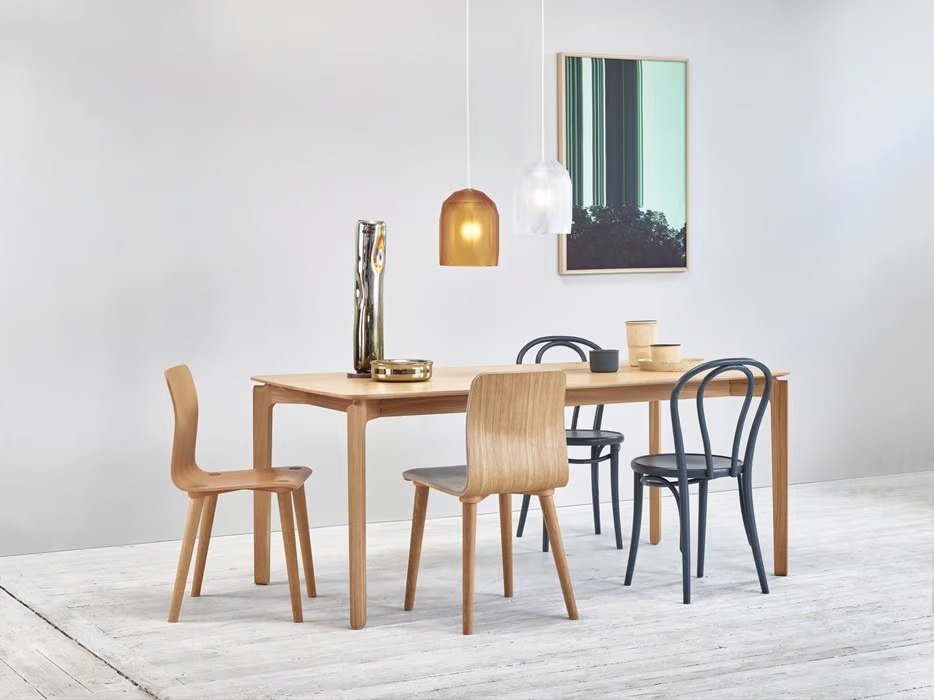 A természetes anyagok és formák iránti visszatérés jegyében készült a Leaf kollekció, amelyet a torinói Studio E-ggs tervezett a TON számára. A kollekció része a különböző magasságú bárszékek és székek, amelyekhez az étkezőasztal is tökéletesen illeszkedik. Az asztal tervezése során az aprók használata olyan hatást kelt, mintha az asztallap lebegne az alap felett. A Leaf székekkel való összhangot a felső lábak végén található kerek részlet biztosítja. A modern asztalok közé tartozó darab nemcsak a kollekció többi elemével, hanem más modellekkel is harmonizál, skandináv stílusának köszönhetően. Két formában érhető el: téglalap és kör alakú.