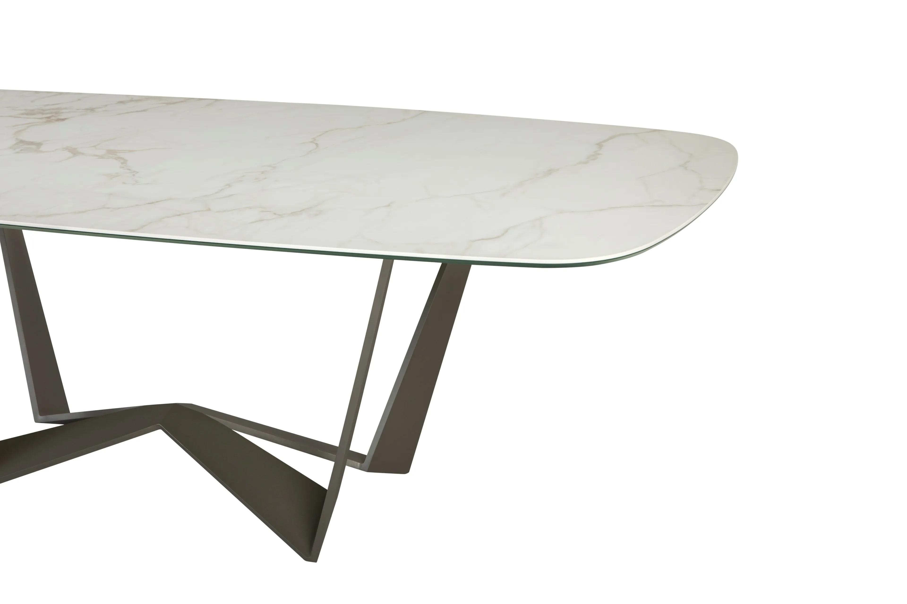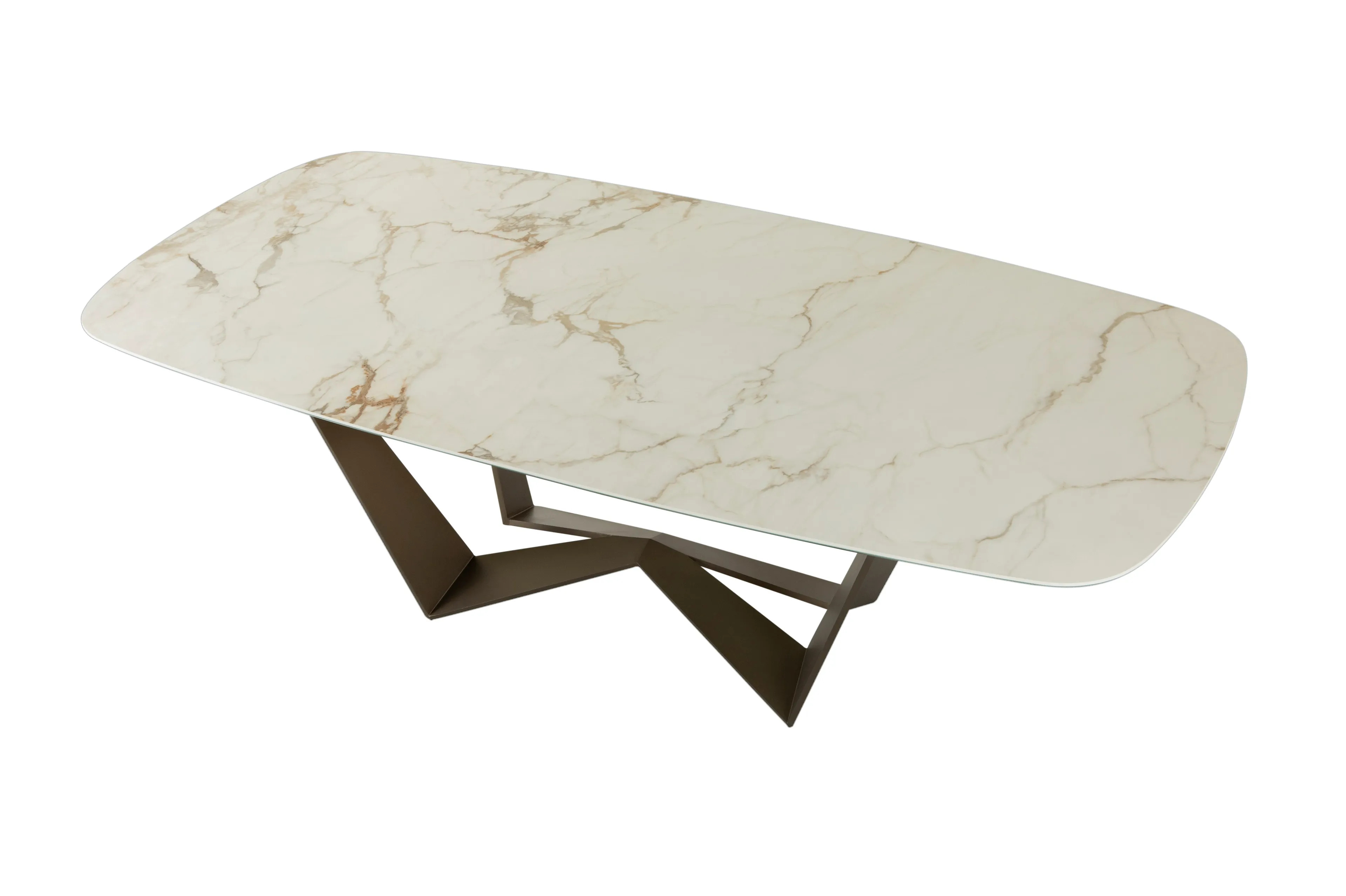 A REVERSE porcelán kőagyag asztal ideális választás irodák, éttermek, kávézók, oktatási intézmények és konferenciatermek számára. Az asztal festett acél vázzal rendelkezik, amelyet különböző felületű üveg vagy porcelán kőagyag lapok egészítenek ki. A geometrikus formájú alap és az új, elegáns lapok közötti kontraszt lenyűgöző megjelenést biztosít. A fix szerkezetű asztal fém váza arany, réz, csiszolt réz, bronz és titán színekben érhető el. A porcelán kőagyag lapok különböző stílusokban kaphatók, mint például Emperador, Symphonie, Onice Ambra, Macchiavecchia fényes és matt. Ideális étkezőasztal, irodai asztal vagy modern asztalok kiegészítője, amely harmonizál a design székekkel és kávézó székekkel.