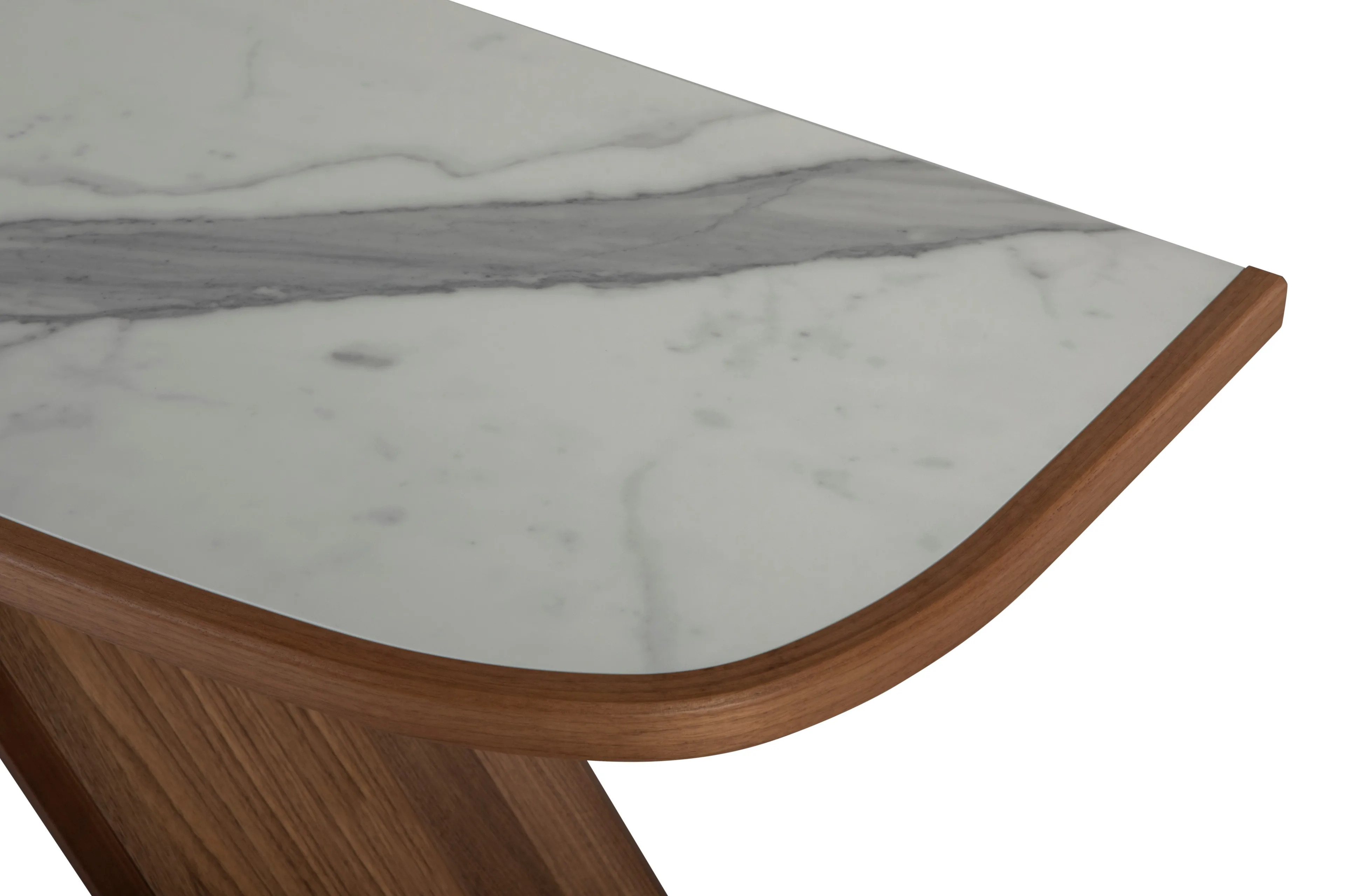 A STILL ÉLIT konzolasztal kifinomult megjelenésével ideális választás irodák, éttermek, kávézók és középületek számára. A Canaletto diófa alap és a statuario altissimo porcelánlap kombinációja modern asztalok eleganciáját tükrözi. A porcelánlap különböző változatokban is elérhető, mint például onyx szürke, Portoro, onyx borostyán és Emperador. A hajlított fa kidolgozása a design székek és étkezőasztalok világában a legnemesebb megmunkálásnak számít. Az Élit verziót a masszív fa gyűrű teszi különlegessé, amely bármely irodai asztal vagy kávézó székek környezetében stílusos megjelenést biztosít.