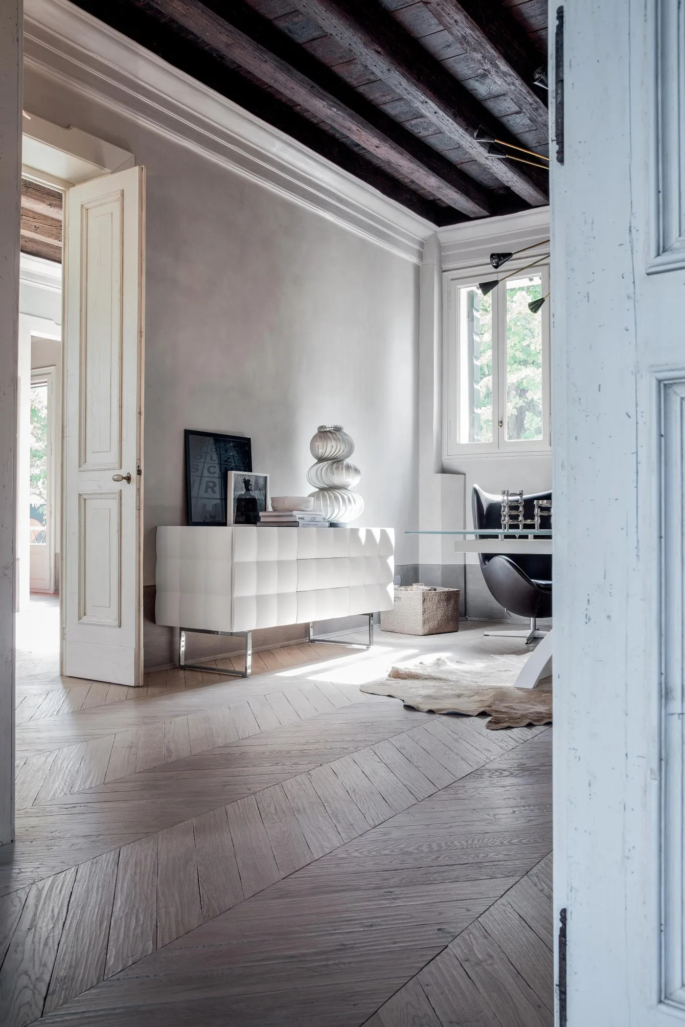 A VENICE tároló szekrények a technika és a kifinomultság találkozásának példái. Az MDF anyagból készült, dombornyomott és lézerrel megmunkált felület, vagy fa borítás, Capitonné hatást kelt, amely a merev szerkezetet puha párna megjelenésűvé varázsolja. A színválaszték a matt fehértől a fekete, bézs és matt pezsgő árnyalatokig terjed. Az idei évtől elérhető egy új, talán még elegánsabb változat is: a Canaletto diófa verzió, amely klasszikus megjelenést kölcsönöz ennek az innovatív fiókos és polcos tároló rendszernek.