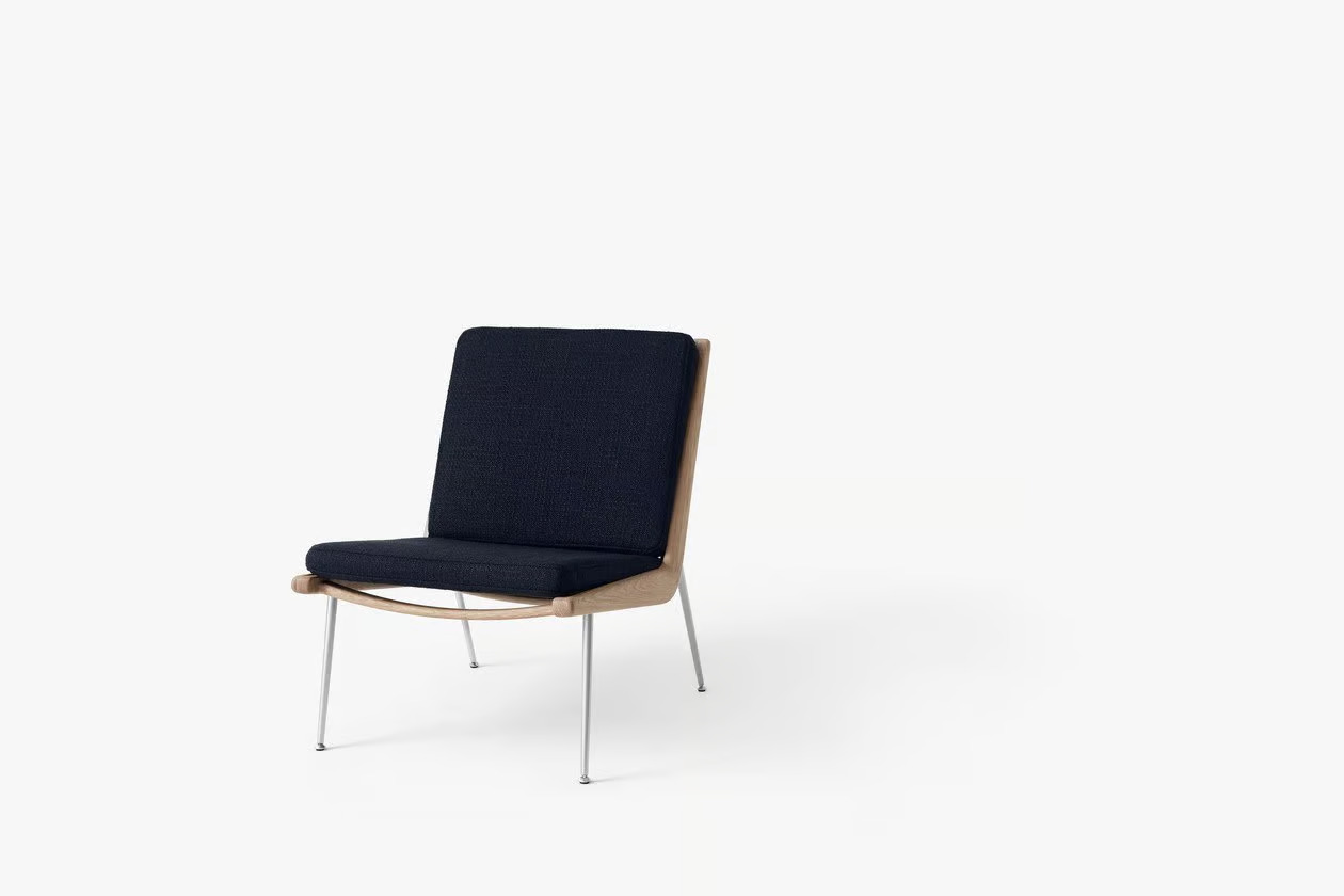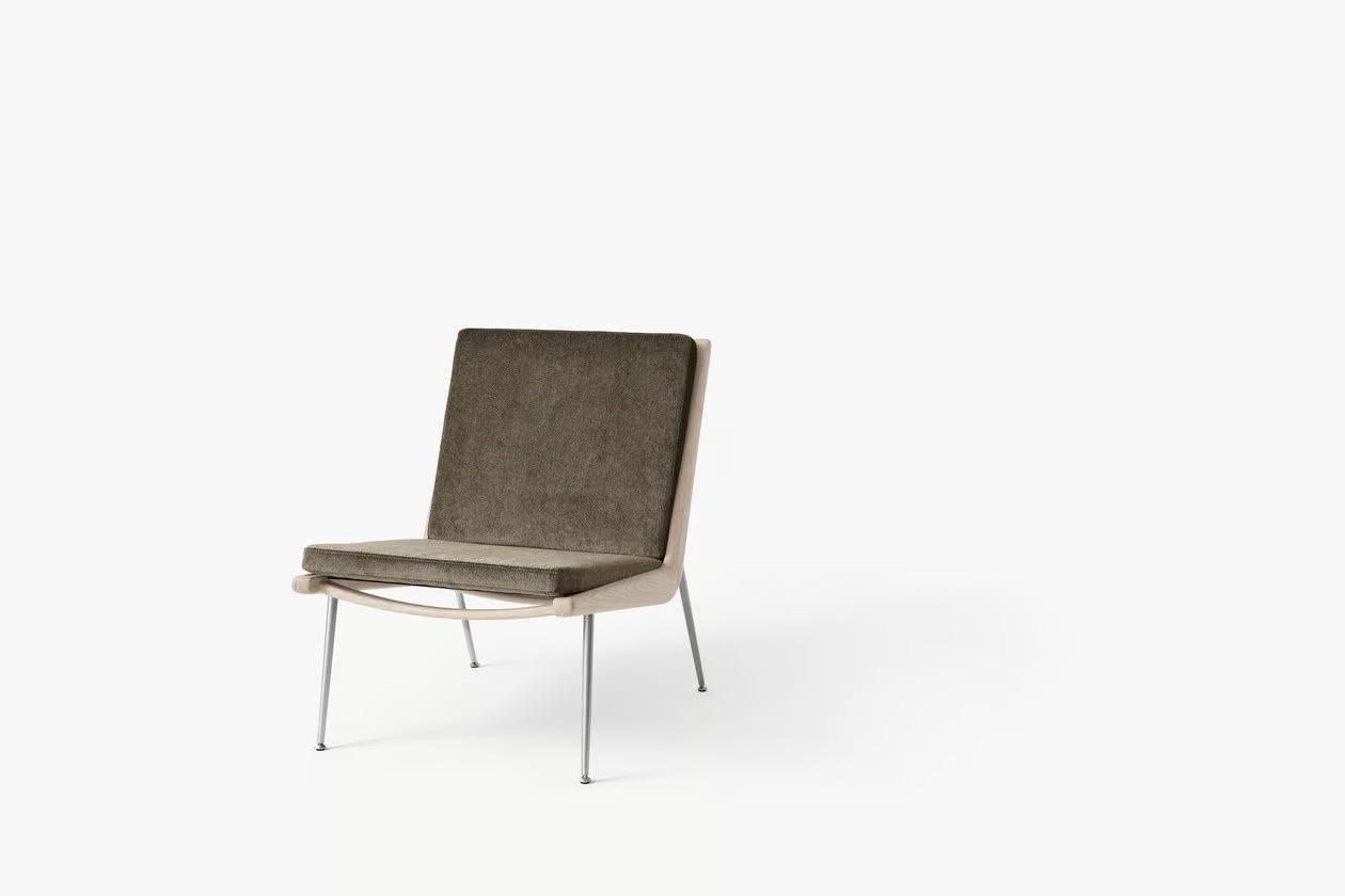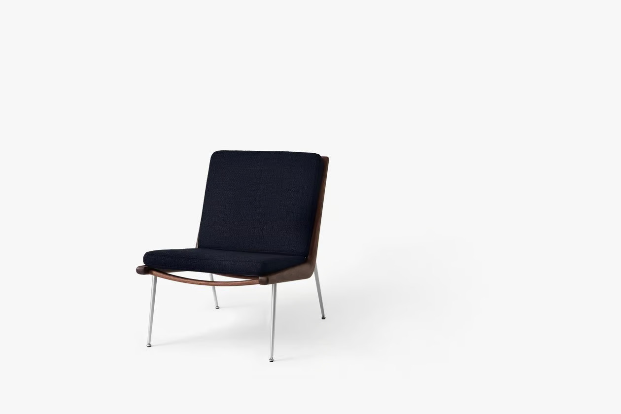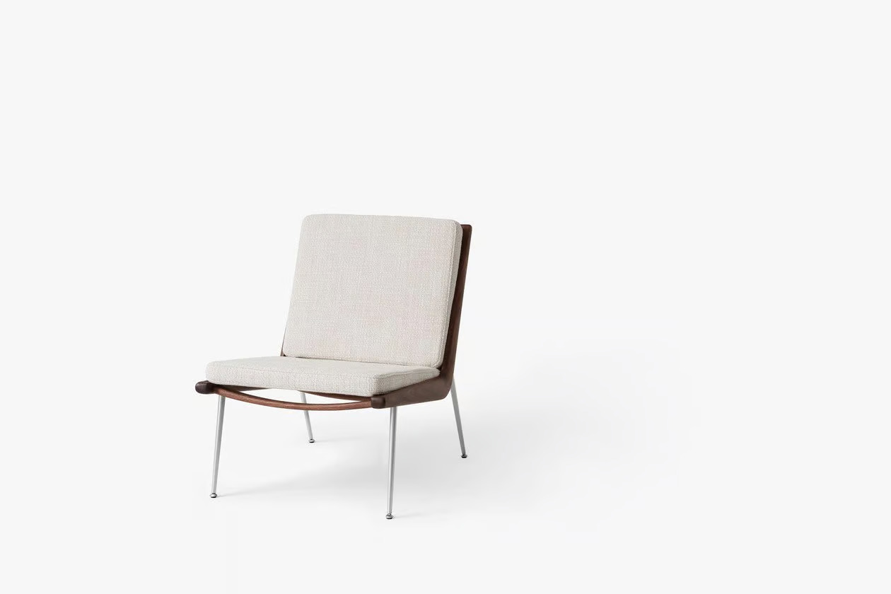 A BOOMERANG HM1 kanapé, amelyet Hvidt & Mølgaard tervezett 1956-ban, a dán dizájn időtlen remekműve. Letisztult formavilága és sallangmentes kialakítása révén ideális választás irodák, szállodák, éttermek és kávézók számára. A kézzel polírozott fa váz és a karcsú réz vagy rozsdamentes acél lábak elegáns megjelenést kölcsönöznek. Az anyagok között található tömör fa, HR hab, poliészter vatta és különféle szövetek. A keret marással készül, a rugók műanyaggal bevont acélból vannak, a szerelvények lézervágott fémből. A fa felületek olajozott tölgy, olajozott dió vagy szappanozott tölgy kivitelben érhetők el, míg a lábak réz vagy rozsdamentes acél változatban. A kanapé Dániában és Litvániában készül a Kvist Industries A/S és UAB BS Classic által.