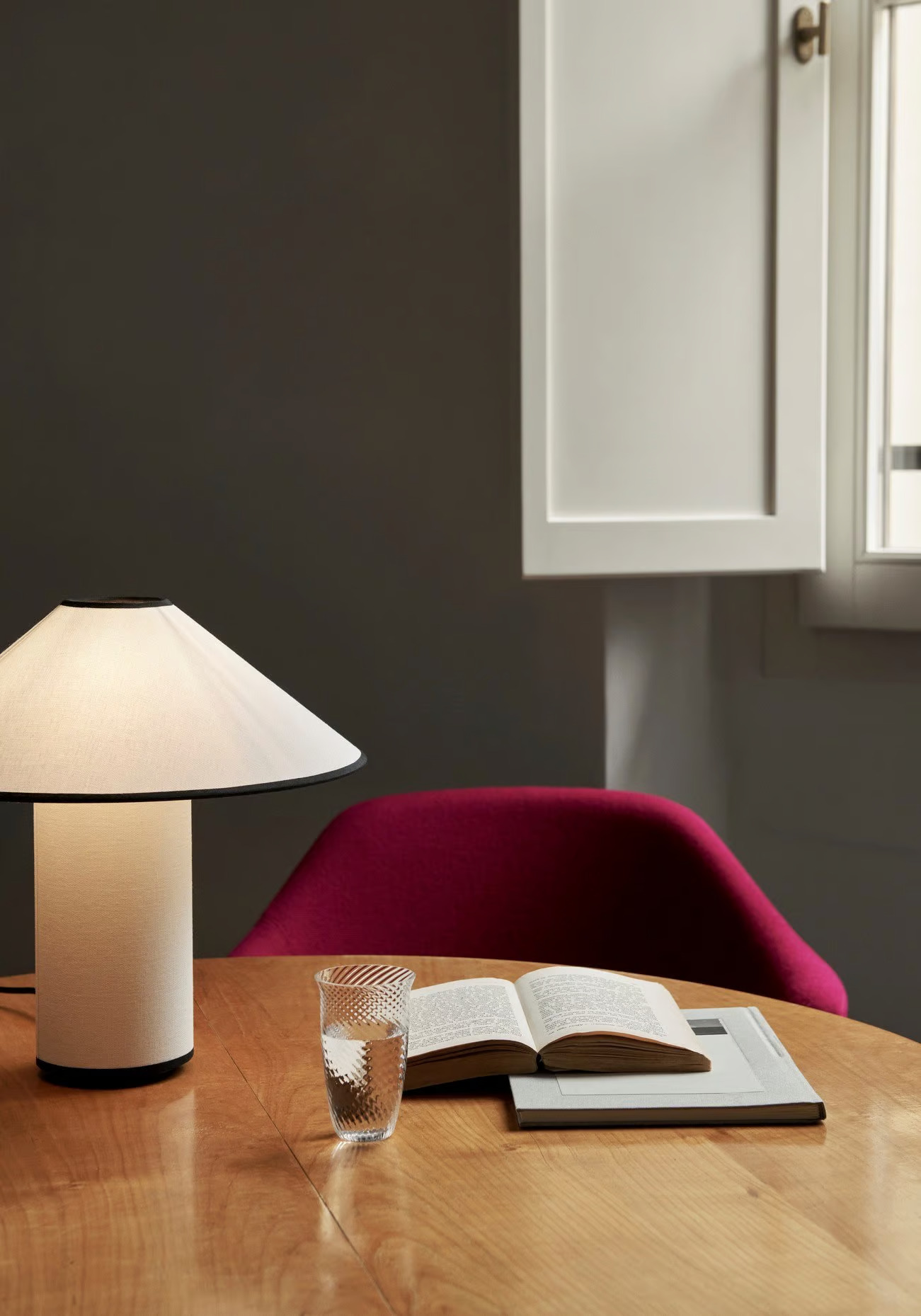 A COLETTE ATD6 asztali lámpa a modern világítás és a hangulatos világítás tökéletes példája, amely ideális választás irodák, éttermek, kávézók, szállodák és középületek számára. A lámpa avantgárd esztétikáját a finom tapintású, fehér pamut-len keverék borítású árnyékoló és talp adja. A lámpa dimmelhető, így a belső világítás igényeihez igazítható. Az árnyékoló és a talp anyaga pamut és len keveréke, hátoldalán PVC réteggel. A belső szerkezet alumíniumból és vasból készült. A lámpa 220-240V feszültségen működik, E14 foglalattal, maximum 40 wattos fényforrással. A 250 cm hosszú kábel rugalmasságot biztosít az elhelyezésben. Két színváltozatban érhető el: fehér-fekete és fehér-merlot. Gyártója a Nine United China Ltd.