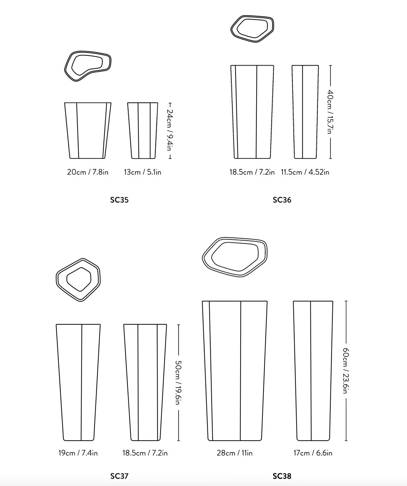 A Space Copenhagen által tervezett vázák a Collect sorozat részei, amely gondosan összeállított, kiváló minőségű lakberendezési kiegészítőket és otthoni dekorációkat tartalmaz. A három rétegű, kézzel fújt üvegből készült vázák egyedi vastagságot és különleges színárnyalatokat kínálnak, három változatban: átlátszó, füstös és karamell. Négy méretben érhetők el: 24 x 20 cm, 40 x 18,5 cm, 50 x 19 cm és 60 x 28 cm. Minden darab fix formában, kézzel fújt üvegből készül, amely biztosítja az ívelt dizájnt. A végső formát gondos vágás és kézi polírozás adja meg. Beltéri használatra ajánlott, tisztításuk nedves ruhával történik.
