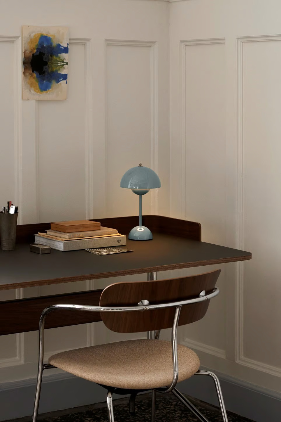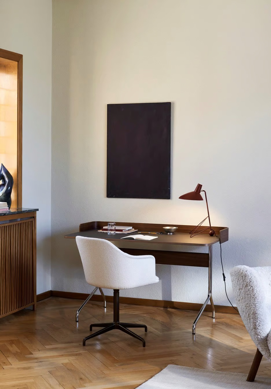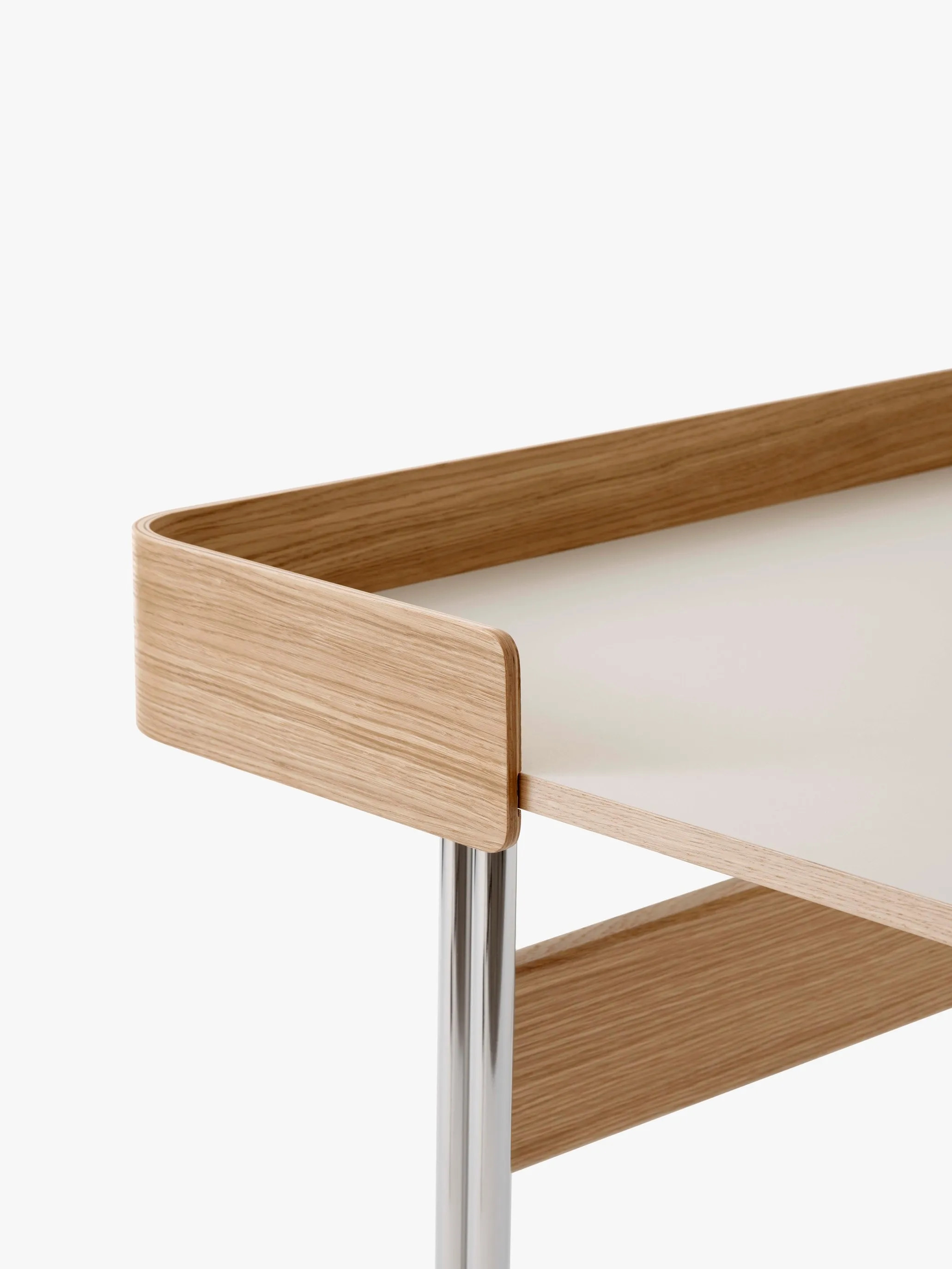 A Pavilion AV17 asztal a híres Langelinie Pavilon ihlette design székek sorozatának része, amelyet Anderssen & Voll tervezett. Ez a modern asztal kompakt méretével ideális irodai asztal vagy étkezőasztal lehet irodák, éttermek, kávézók és középületek számára. A járvány kezdetén tervezett asztal figyelembe veszi az otthoni munkavégzés igényeit, hátlappal ellátott változatban is elérhető. Az asztallap linóleummal laminált, furnérozott élekkel, míg a lábak hajlított acélcsövekből készülnek. A hátlap formázott furnérból készült. Az asztallap gombaszínű linóleummal és lakkozott tölggyel, valamint vas linóleummal és lakkozott dióval kapható. A terméket Dániában, a Kvist Industries A/S gyártja.