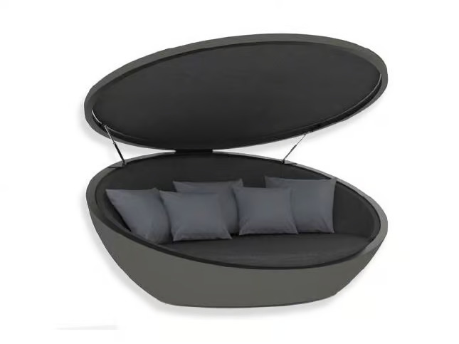 Az ULM DAYBED Ramón Esteve tervezésében egy kifinomult, tiszta gömbgeometriával rendelkező kültéri ülőgarnitúra, amely tökéletesen illeszkedik bármilyen környezetbe. Kör alakú formája és nagy mérete lehetővé teszi, hogy könnyedén alkalmazkodjon a különböző terekhez, míg forgó funkciója révén egyszerűen elforgatható saját tengelye körül. Az ULM kollekció részeként a funkcionalitás és a praktikum jegyében készült, mellőzve minden felesleges elemet, így rendkívül sokoldalú és könnyen karbantartható. A pergola védi a belső teret, miközben kellemes árnyékot biztosít áttetsző szövetborításával. Az ULM kollekció egységes dizájnja összhangban van más termékekkel, így egy teljes kültéri bútorokból álló együttest alkot. A kanapék, székek, kerti bútorok, dohányzóasztalok és puffok merev és tartós szerkezetet biztosítanak a pihenéshez és a kényelemhez. Az ULM kollekció darabjai integrált világítással is elérhetők, amely színes fényekkel emeli ki innovatív minőségüket.