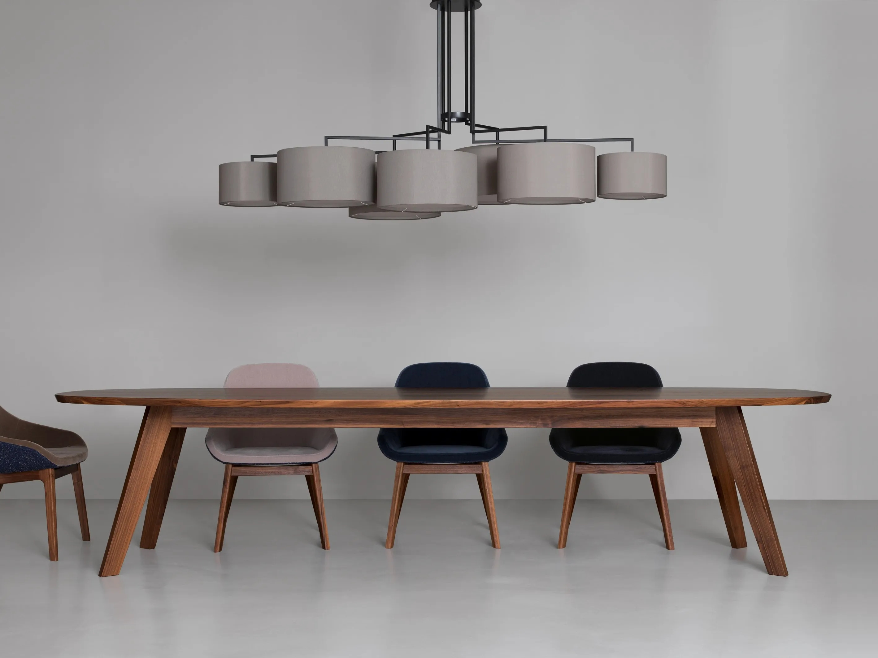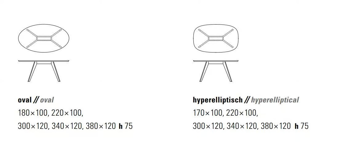 A CENA ovális asztal erős karakterrel rendelkezik, amelyet a ferde asztallap könnyedsége és dinamikája egészít ki, harmonizálva a masszív lábazattal. A kisebb változat kávézóasztalként vagy alkalmi asztalként is funkcionálhat, míg a nagyobb méret étkezőasztalként szolgál. Az asztallapok különböző formákban elérhetők: téglalap, hiperelliptikus, ovális, kerek és négyzet alakú. A CENA méretei rugalmasan alakíthatók, akár 540 cm × 130 cm-es téglalap, 240 cm × 240 cm-es négyzet, vagy Ø 240 cm-es kerek formátumok is megvalósíthatók. Anyagválaszték: tömör fa, mint például fehérre olajozott kőris, tölgy, amerikai cseresznye és dió. A felület természetes olajokkal és viaszokkal impregnált, a tölgy színű változat matt lakkozott. Szerződéses felhasználásra DD-lakk bevonat javasolt az asztallapokra.