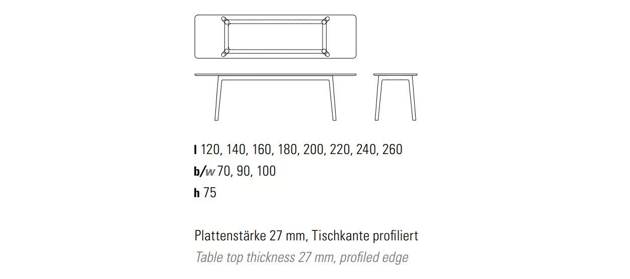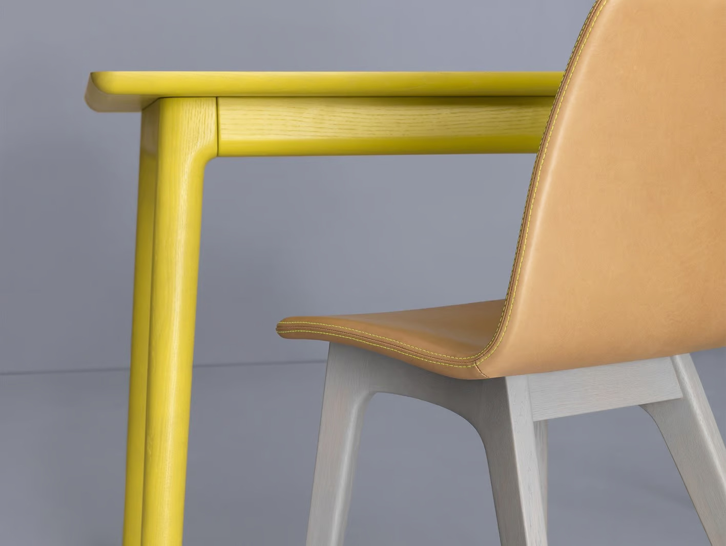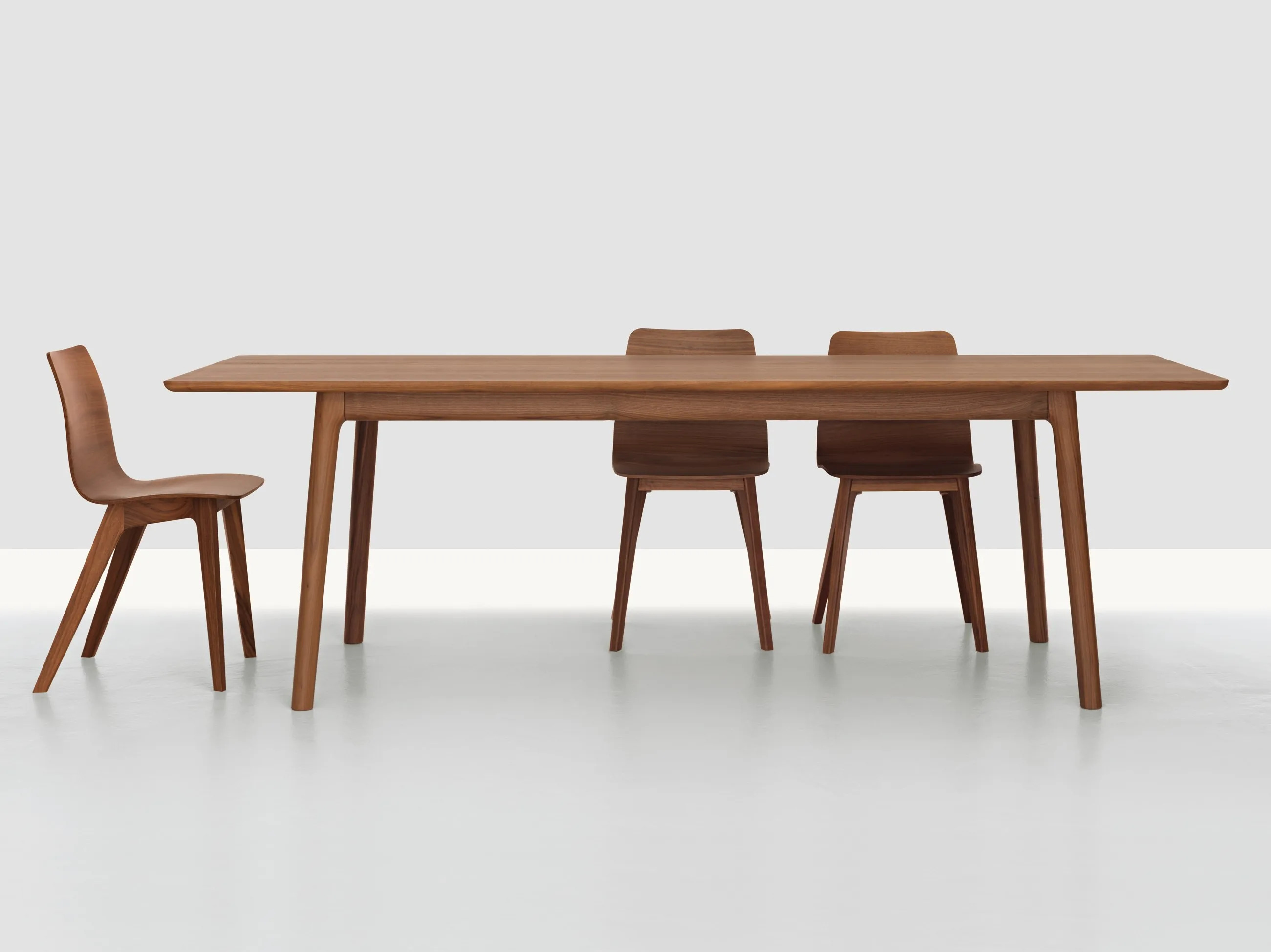 Az E8 téglalap alakú asztal Mathias Hahn tervezése, amelyet egykori londoni otthona inspirált. Az asztal keskeny, hosszú formája és a végén található túlnyúlások különleges megjelenést kölcsönöznek neki, amely ideális választás étkezőasztalként vagy irodai asztalként. Az asztal anyaga tömör fa, elérhető tölgy vagy amerikai dió változatban. A természetes verzió természetes olajokkal és viaszokkal impregnált, míg a színes változat matt lakkozással készül, ahol az asztallap tölgy, az alsó rész és a keret pedig cink sárga (RAL 1018) vagy színezett. Az E8 asztal modern asztalok és design székek társaságában is remekül mutat, legyen szó irodai, éttermi vagy kávézó környezetről.