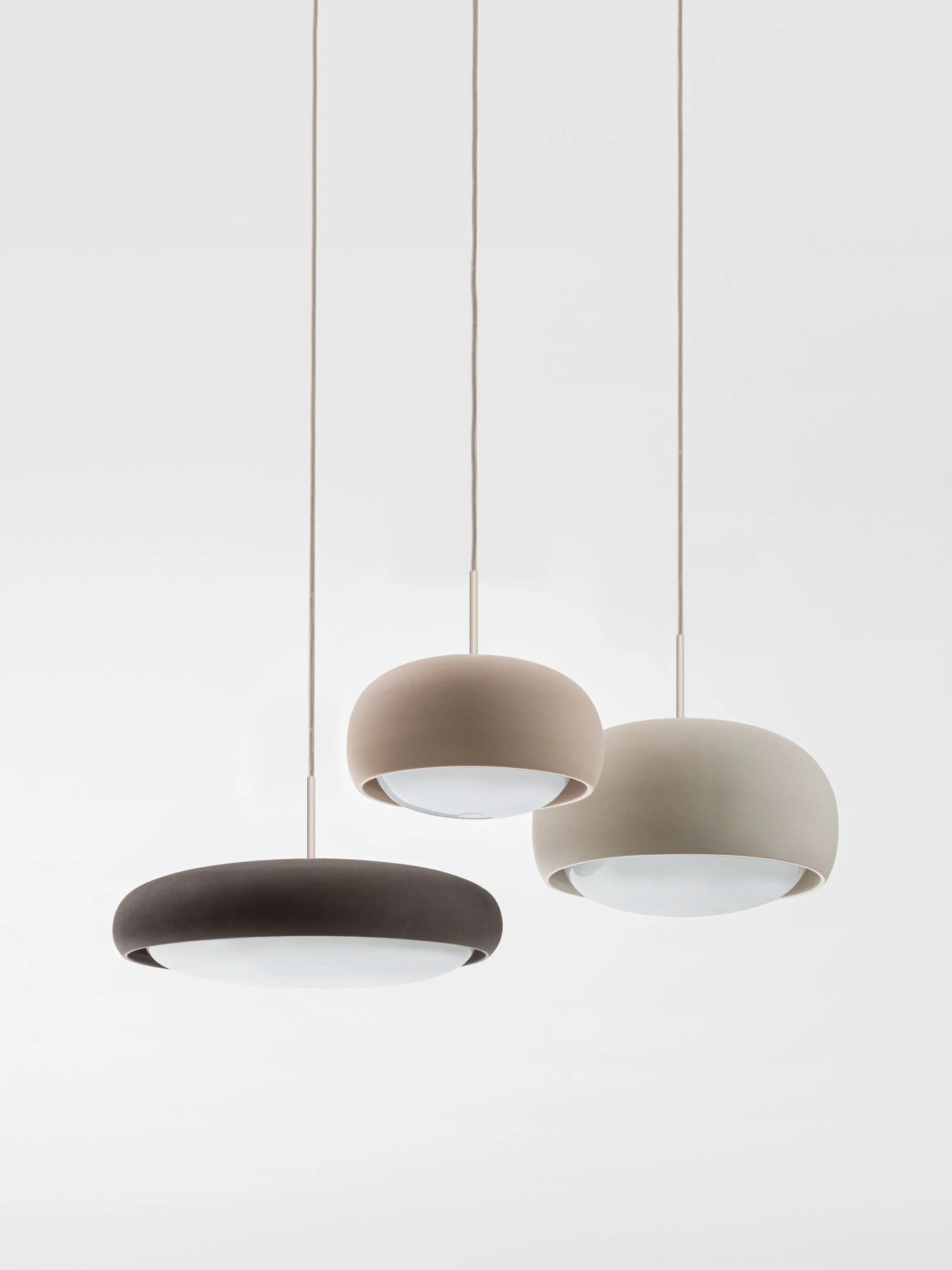 A GEMA L a természetes agyag tulajdonságait ünnepli, kézzel készítve Portugáliában. Az Engobe kerámiából készült, formás lámpabúra földszínekben – halvány rózsaszín, homok és szén – és három méretben érhető el. A felület érdes, mintha homokba mártották volna. Az Engobe kerámia színezési technika zárja a kerámia nyitott pórusait, finomítva az agyagot, színezve és bevonva a vékony agyagásványi masszával. A kerámia lámpabúra körülöleli az opálüveg testet, amely kézzel fújt, és lágy fénybe burkolja a környezetet. Az anyagok között megtalálható a halvány rózsaszín, homok és szén színű kerámia, valamint a kézzel fújt, fehér színű üveg. A lámpa három színben és méretben kapható, megerősített textilkábellel és világosszürke tehermentesítővel.