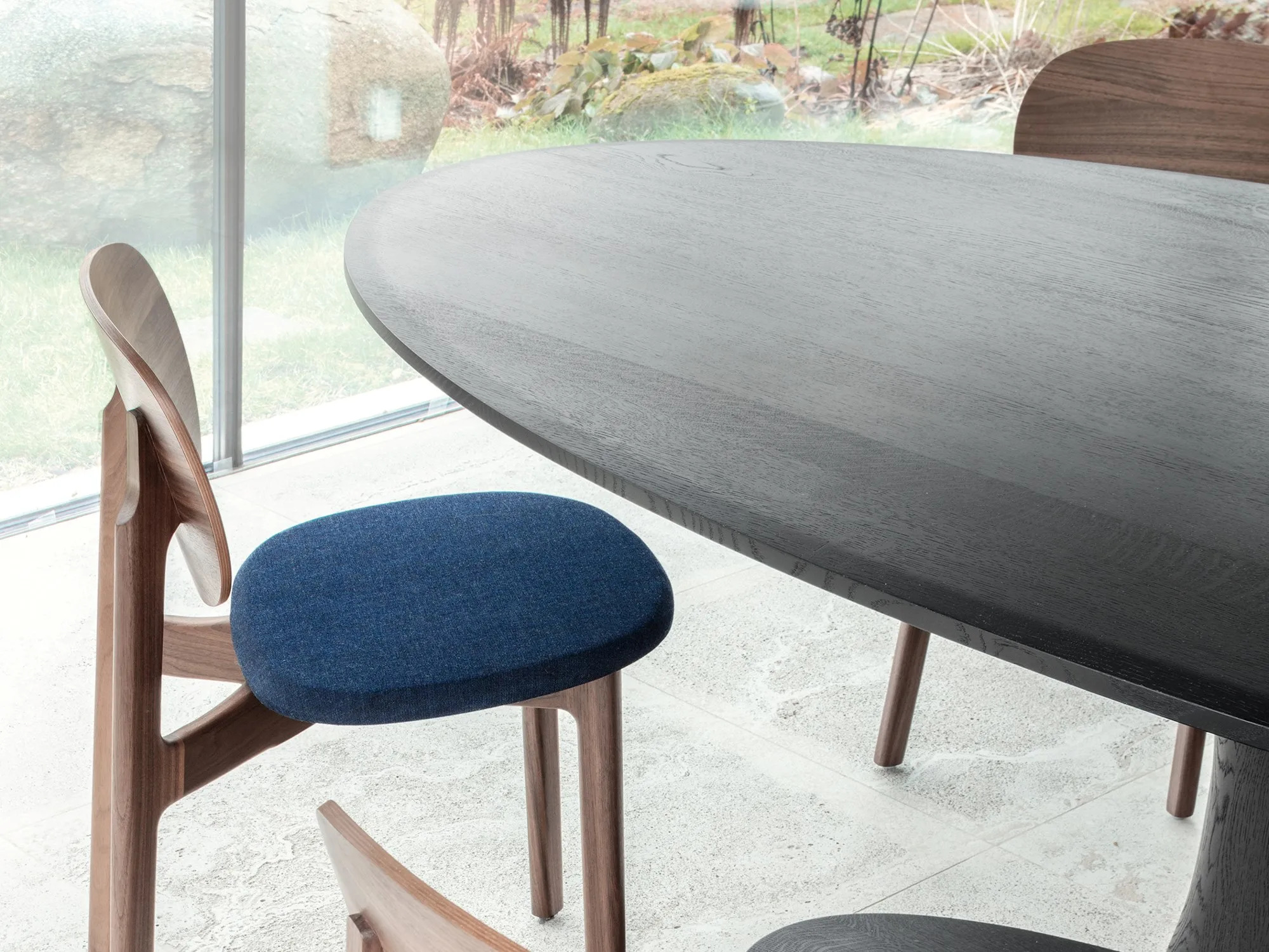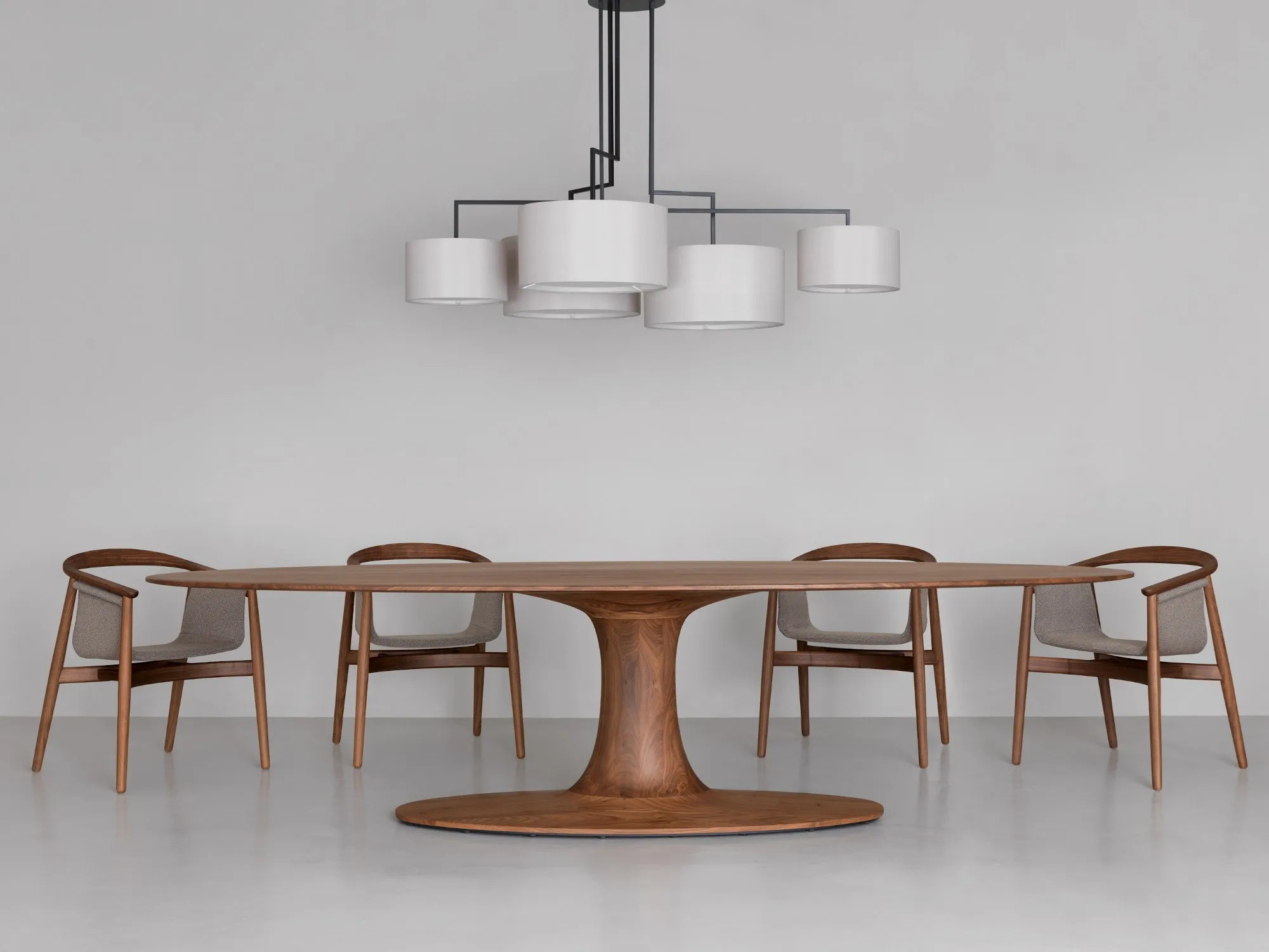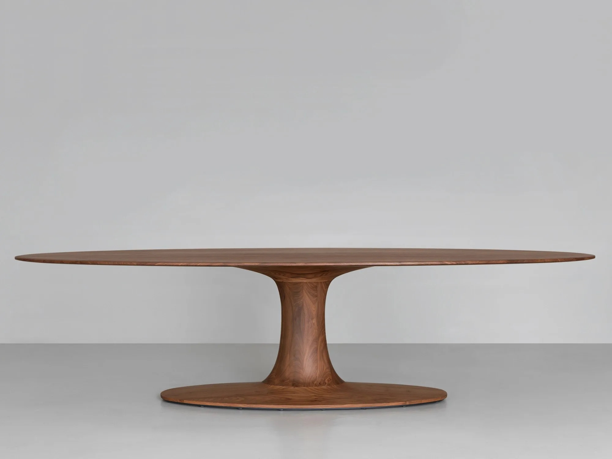 A TURNTABLE OVAL egy ovális étkezőasztal, amely ideális nagyobb csoportok számára, miközben helytakarékos megoldást kínál központi talpával. Az asztallap, a központi talp és a padlólemez is ovális kialakítású, ami különleges kézműves munkát igényel, és egyedülálló tömörfa változatban. Anyaga lehet tölgy, tölgy színű pác, amerikai cseresznye vagy amerikai dió. Felülete természetes olajokkal és viaszokkal impregnált, a tölgy színű pác matt lakkozott. Szerződéses felhasználás esetén lakkozott felületet javaslunk az asztallapokra. Az ovális láb és a több mint 200 kg-os talp stabilitást biztosít. Különböző méretekben is elérhető, így irodai asztalként, modern asztalok részeként vagy kávézó székek kiegészítőjeként is alkalmazható.