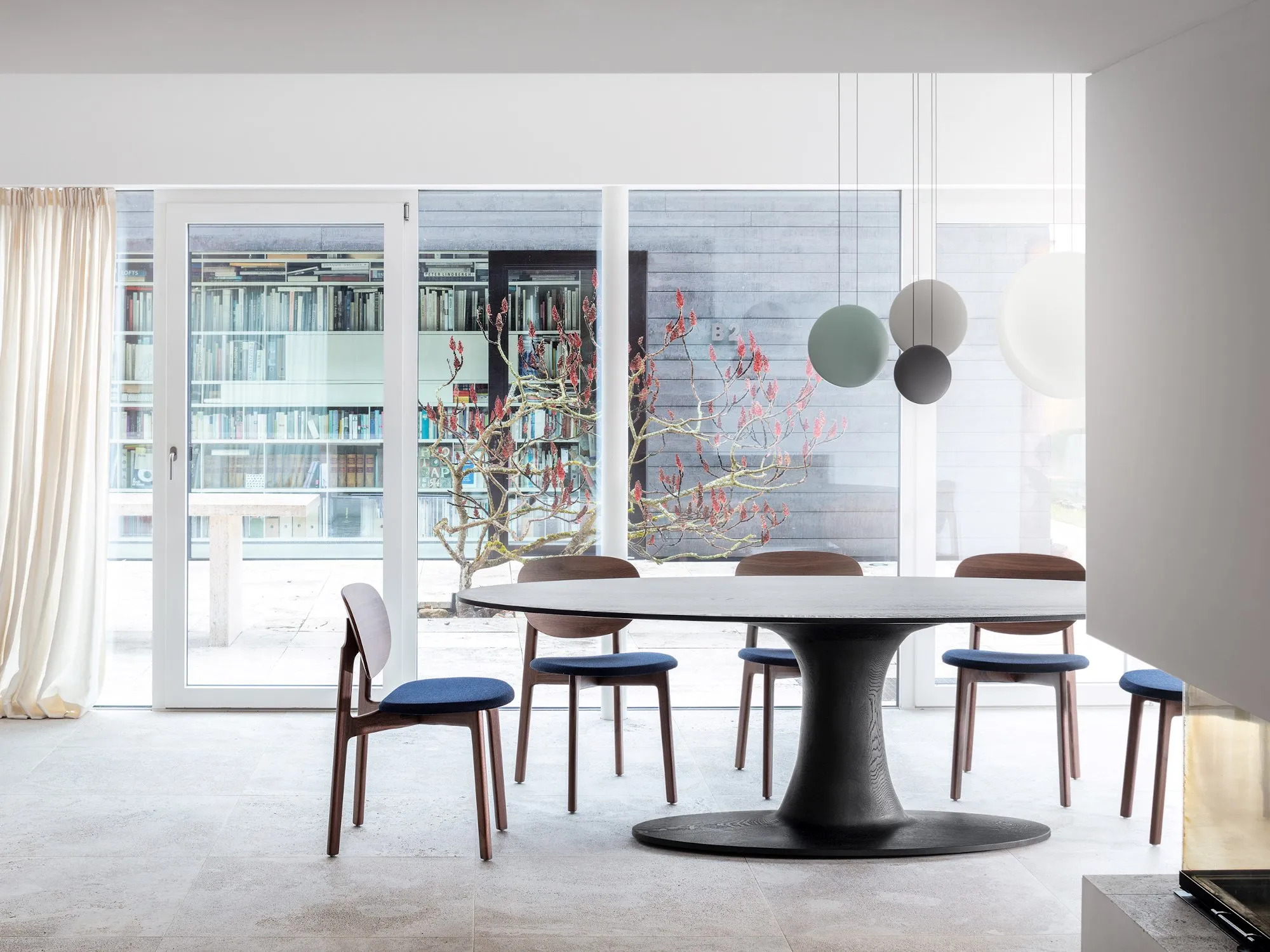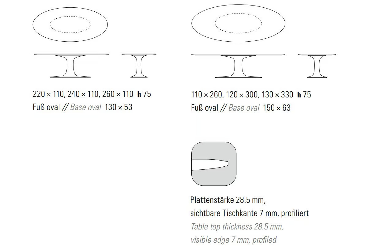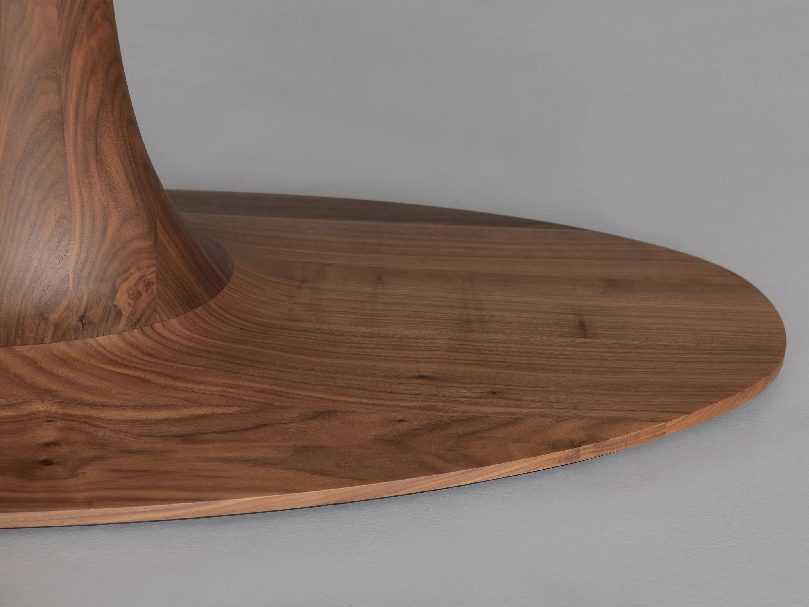 A TURNTABLE OVAL egy ovális étkezőasztal, amely ideális nagyobb csoportok számára, miközben helytakarékos megoldást kínál központi talpával. Az asztallap, a központi talp és a padlólemez is ovális kialakítású, ami különleges kézműves munkát igényel, és egyedülálló tömörfa változatban. Anyaga lehet tölgy, tölgy színű pác, amerikai cseresznye vagy amerikai dió. Felülete természetes olajokkal és viaszokkal impregnált, a tölgy színű pác matt lakkozott. Szerződéses felhasználás esetén lakkozott felületet javaslunk az asztallapokra. Az ovális láb és a több mint 200 kg-os talp stabilitást biztosít. Különböző méretekben is elérhető, így irodai asztalként, modern asztalok részeként vagy kávézó székek kiegészítőjeként is alkalmazható.